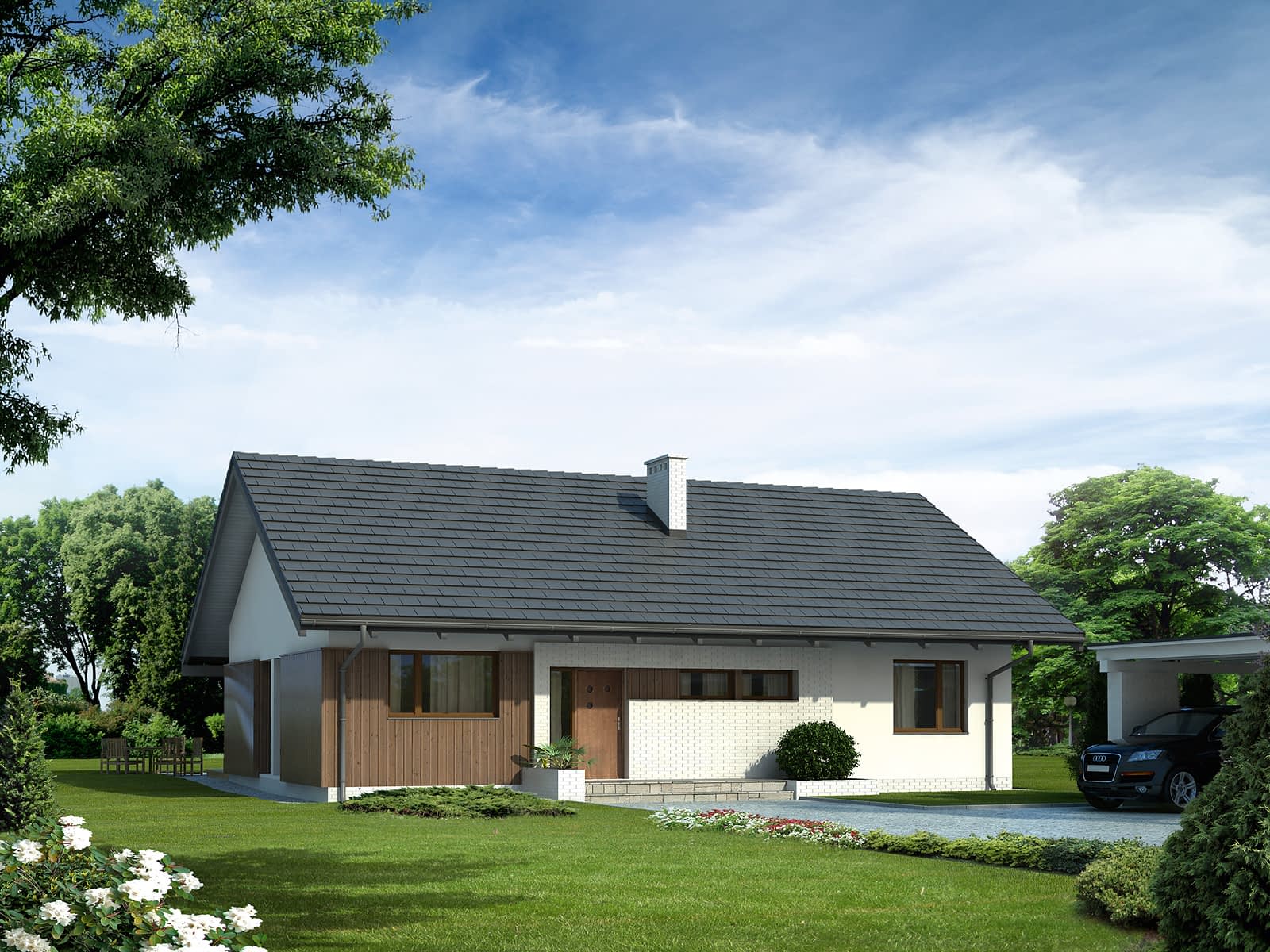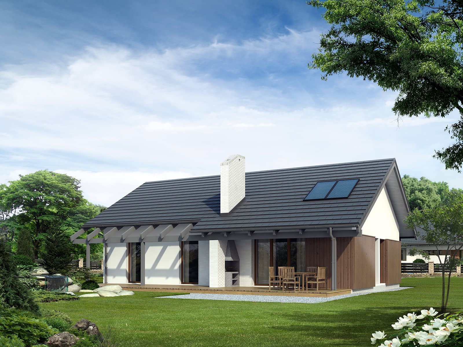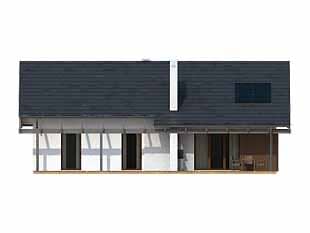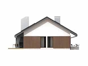 Parterowy dom jednorodzinny o czystym układzie funkcjonalnym, z wyraźnym podziałem na część dzienną i nocną. Przeznaczony dla 4-osobowej rodziny (trzy sypialnie). Zadaszony taras z miejscem na grill.Konstrukcja