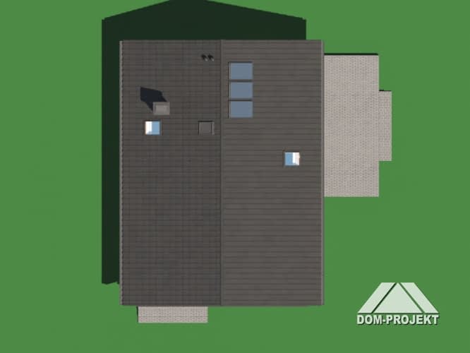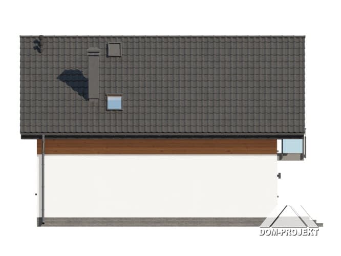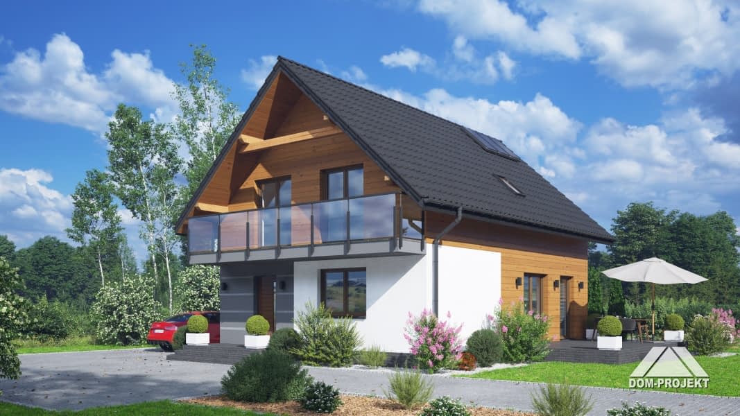 Dom z poddaszem użytkowym. Na parterze salon z aneksem kuchennym, wyjściem na taras i schodami na poddasze. Pokój, wiatrołap, łazienka. Na poddaszu trzy pokoje, łazienka, garderoba, komunikacja. Zwarta bryła budynku oraz dach dwuspadowy sprzyjają szybkiej i taniej budowie oraz niskim kosztom eksploatacji.Rzuty
