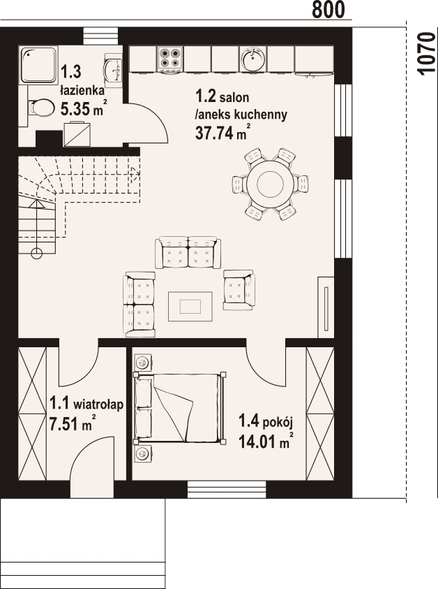 - 1.2 - salon z aneksem kuchennym37.74 m²