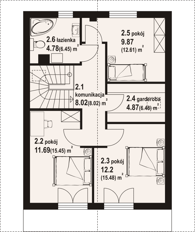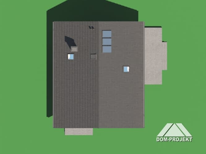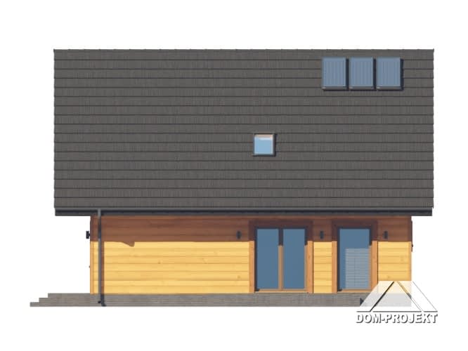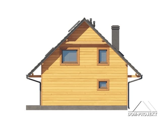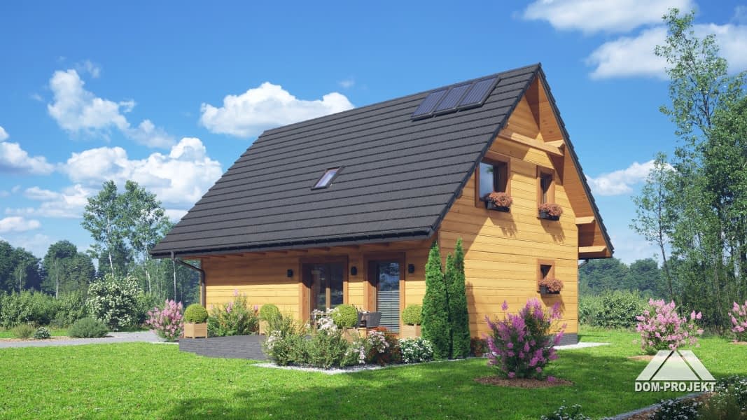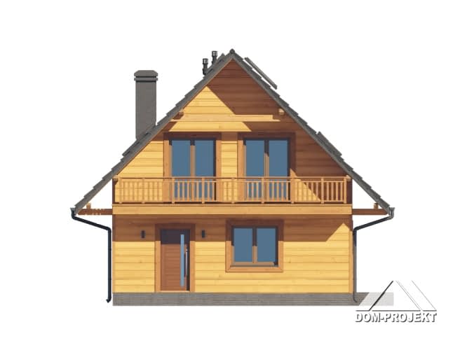 Dom w konstrukcji szkieletu drewnianego. Na parterze salon z aneksem kuchennym, wyjściem na taras i schodami na poddasze. Pokój, łazienka, wiatrołap. Na poddaszu trzy pokoje, garderoba, komunikacja, łazienka oraz balkon dostępny z dwóch pokoi. Zwarta bryła budynku oraz dach dwuspadowy sprzyjają szybkiej i taniej budowie oraz niskim kosztom eksploatacji.Rzuty