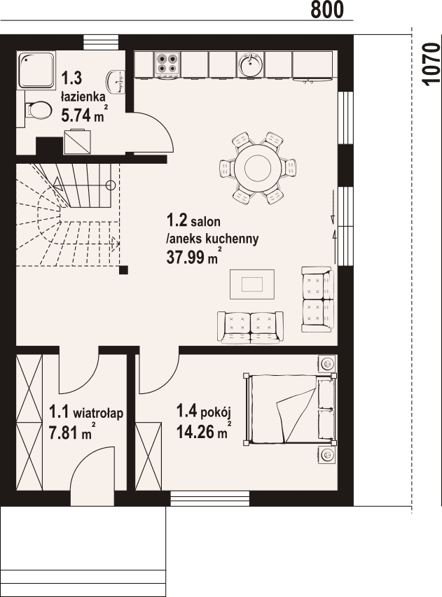 - 1.2 - salon z aneksem kuchennym37.99 m²