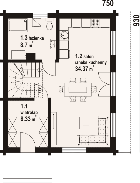 Dom z bali. Na parterze salon z aneksem kuchennym, wyjściem na taras i schodami na poddasze. Wiatrołap, łazienka. Na poddaszu trzy pokoje, łazienka, komunikacja. Balkon dostępny z dwóch pokoi. Zwarta bryła budynku oraz dach dwuspadowy sprzyjają szybkiej i taniej budowie oraz niskim kosztom eksploatacji.Rzuty