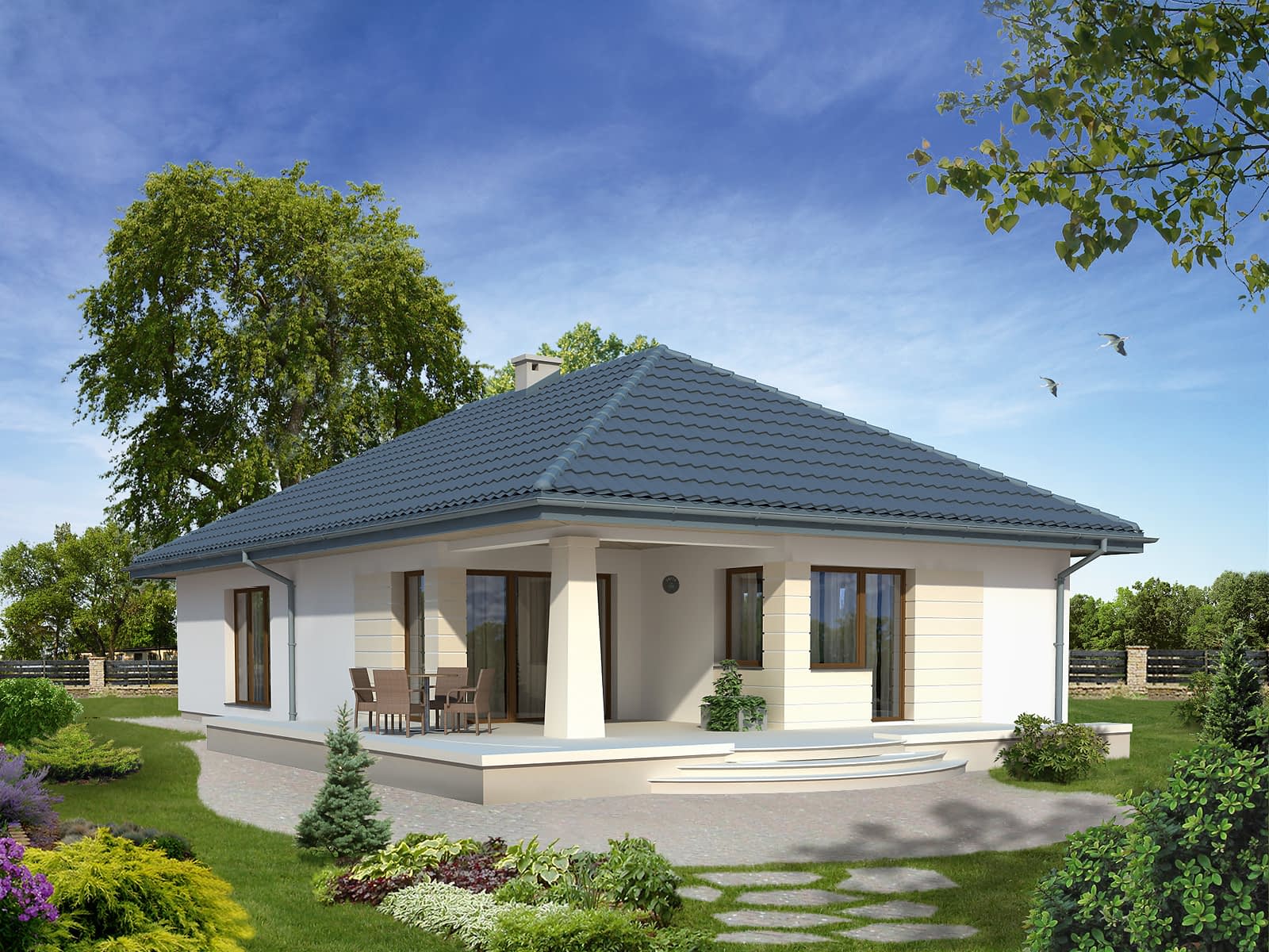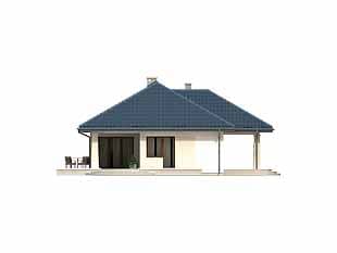 Parterowy budynek mieszkalny przeznaczony dla 3 osób. Na parterze, prócz części dziennej i sypialni, została zaprojektowana spiżarnia, spora kotłownia oraz wc z pralnią. Domek ma duże tarasy z zadaszeniem, umożliwiające korzystanie z nich nawet w kiepską pogodę.Konstrukcja