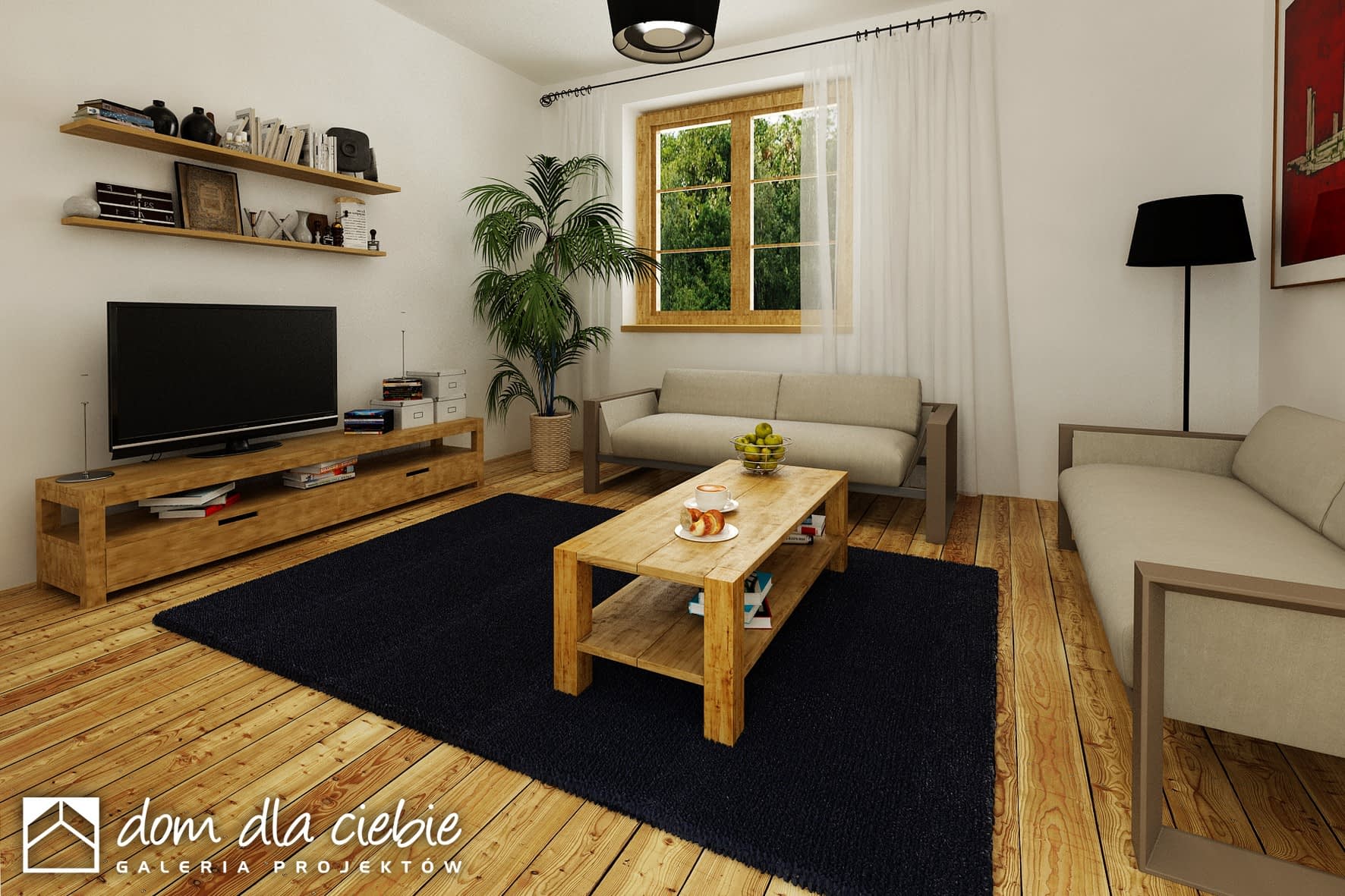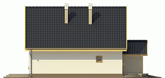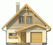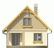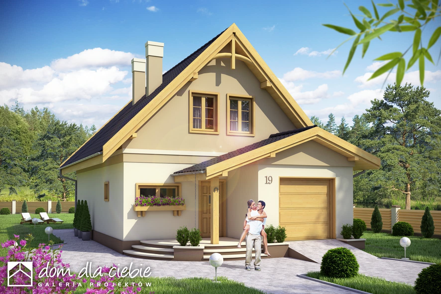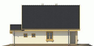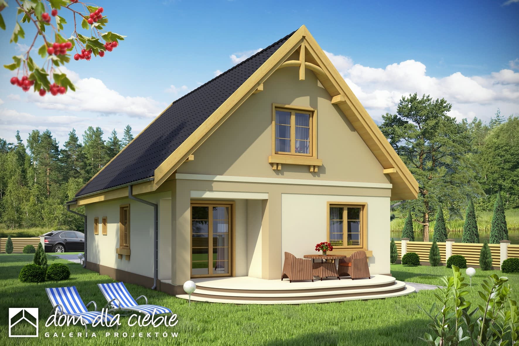 Ciepły, tradycyjny projekt małego domku dla 4-osobowej rodziny. Dzięki niewielkiej szerokości nadaje się na wąską działkę (likwidując okno w łazience na parterze można zyskać jeszcze dodatkowy metr). Strefa dzienna to salon: część wypoczynkowa z kominkiem i TV oraz jadalnia z wyjściem na częściowo zadaszony taras. Bezpośrednio przy jadalni znajduje się kuchnia, którą można również wydzielić ścianką. Pod schodami praktyczny schowek, który może pełnić rolę spiżarni, garderoby lub dodatkowego WC. Na poddaszu mieszczą się 2 przytulne sypialnie dla dzieci, łazienka oraz pokój rodziców z dużą garderobą (można ją także przerobić na łazienkę).W domu zaprojektowano ogrzewanie gazowe – piec znajduje się w pomieszczeniu gospodarczym dostępnym z wiatrołapu. Istnieje możliwość przeprojektowania ogrzewania na paliwo stałe, powiększając kotłownię o łazienkę. W takiej sytuacji najlepiej pod schodami zlokalizować WC.