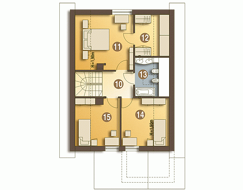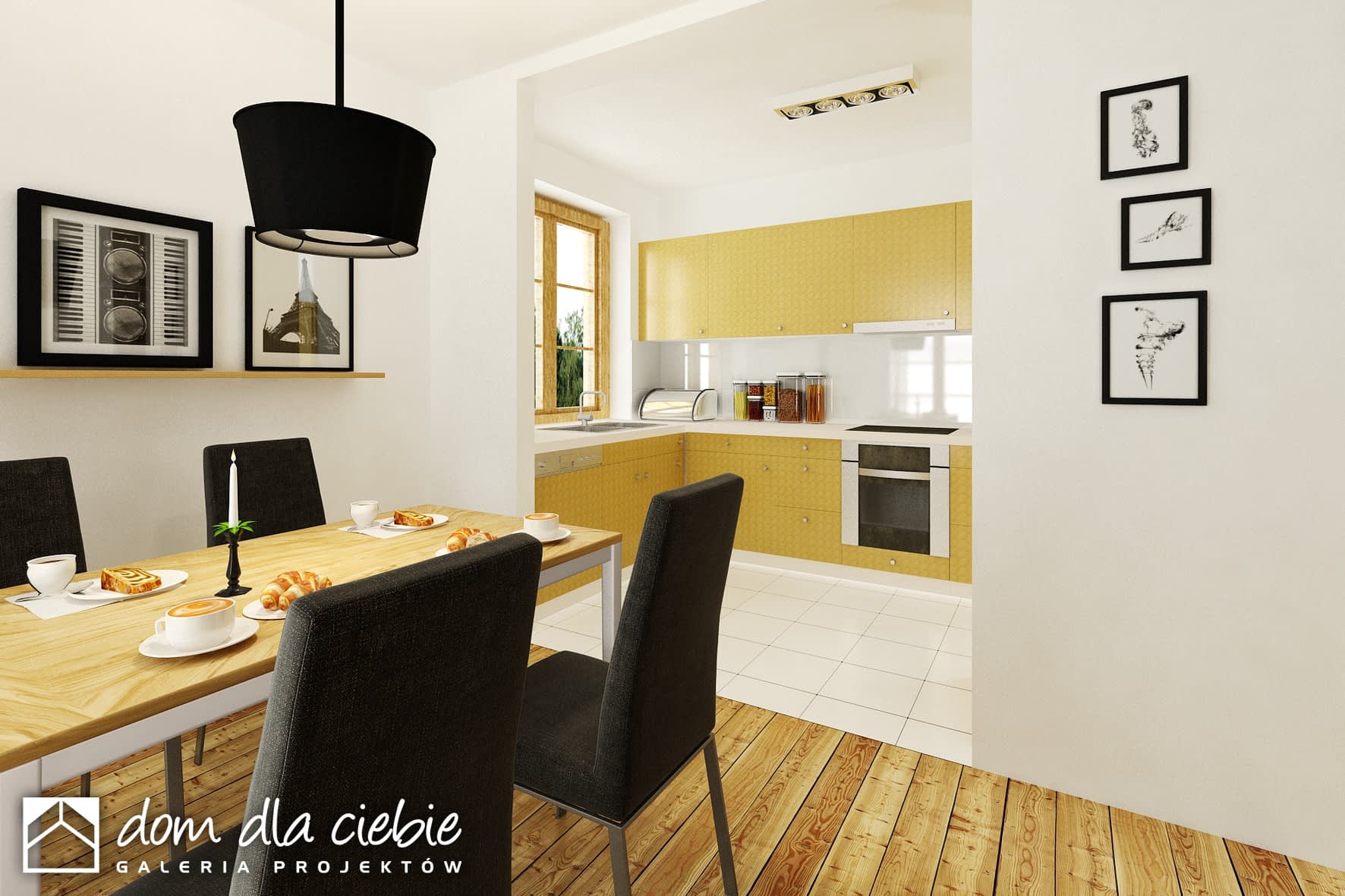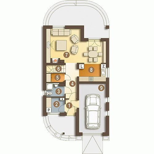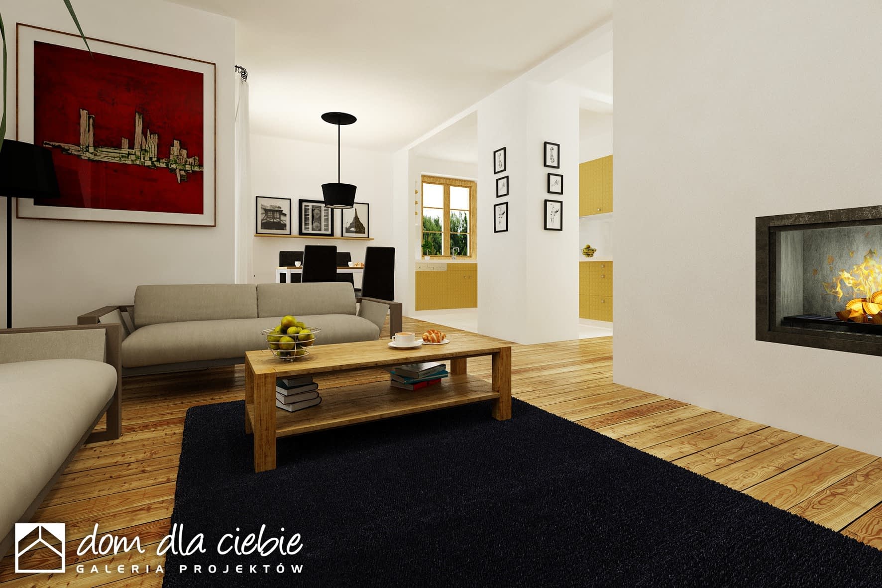 Ciepły, tradycyjny projekt małego domku dla 4-osobowej rodziny. Dzięki niewielkiej szerokości nadaje się na wąską działkę (likwidując okno w łazience na parterze można zyskać jeszcze dodatkowy metr). Strefa dzienna to salon: część wypoczynkowa z kominkiem i TV oraz jadalnia z wyjściem na częściowo zadaszony taras. Bezpośrednio przy jadalni znajduje się kuchnia, którą można również wydzielić ścianką. Pod schodami praktyczny schowek, który może pełnić rolę spiżarni, garderoby lub dodatkowego WC. Na poddaszu mieszczą się 2 przytulne sypialnie dla dzieci, łazienka oraz pokój rodziców z dużą garderobą (można ją także przerobić na łazienkę).W domu zaprojektowano ogrzewanie gazowe – piec znajduje się w pomieszczeniu gospodarczym dostępnym z wiatrołapu. Istnieje możliwość przeprojektowania ogrzewania na paliwo stałe, powiększając kotłownię o łazienkę. W takiej sytuacji najlepiej pod schodami zlokalizować WC.