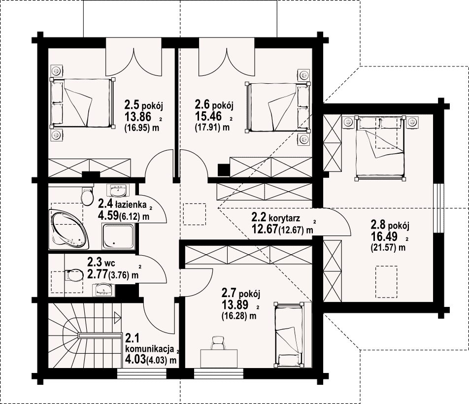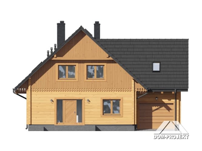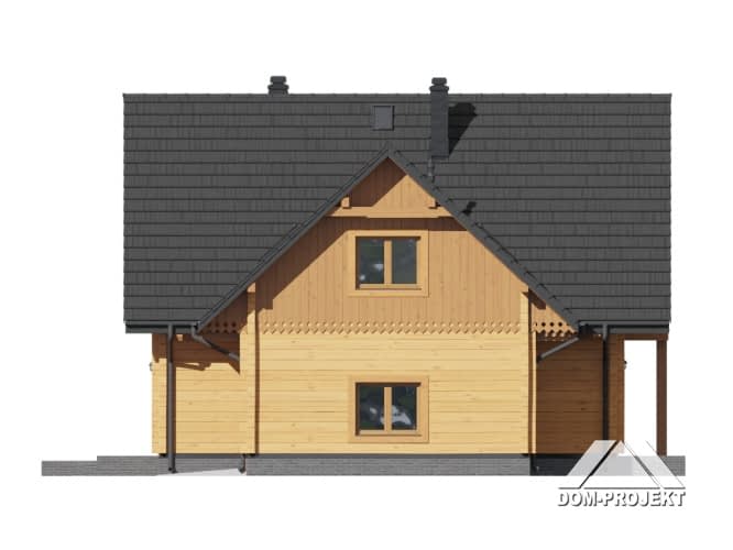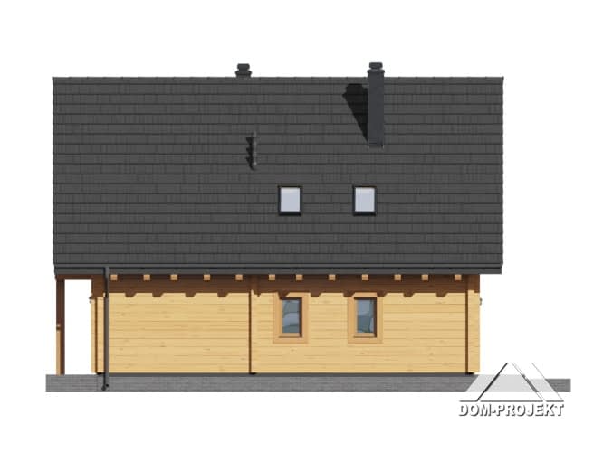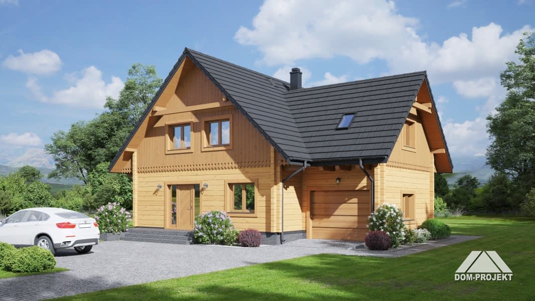 Dom z bali. Duży salon z aneksem kuchennym, kominkiem i wyjściem na taras. Pokój, garderoba, spiżarka, łazienka, komunikacja, wiatrołap i garaż. Na poddaszu cztery pokoje, łazienka, wc, garderoba, komunikacja i balkon. Zwarta bryła budynku i dach dwuspadowy sprzyjają szybkiej i taniej budowie i niskim kosztom eksploatacji.Rzuty