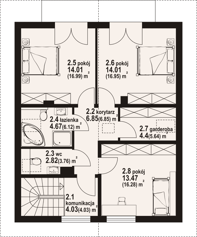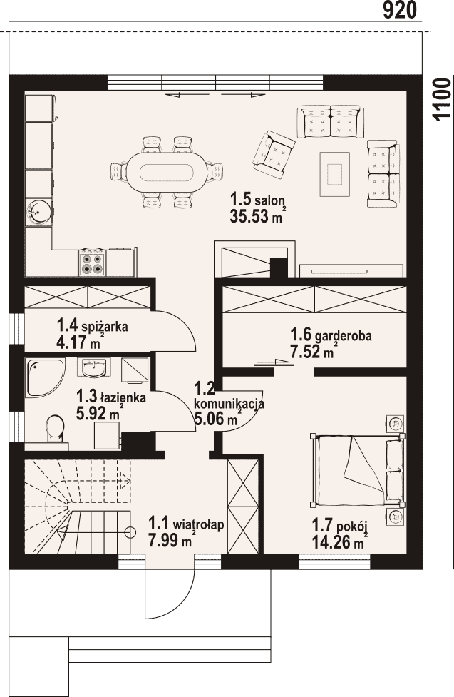 Dom w konstrukcji szkieletu drewnianego. Duży salon z aneksem kuchennym, kominkiem i wyjściem na taras. Pokój, garderoba, spiżarka, łazienka, komunikacja i wiatrołap. Na poddaszu trzy pokoje, łazienka, garderoba, wc, korytarz i balkon. Zwarta bryła budynku i dach dwuspadowy sprzyjają szybkiej i taniej budowie i niskim kosztom eksploatacji.Rzuty