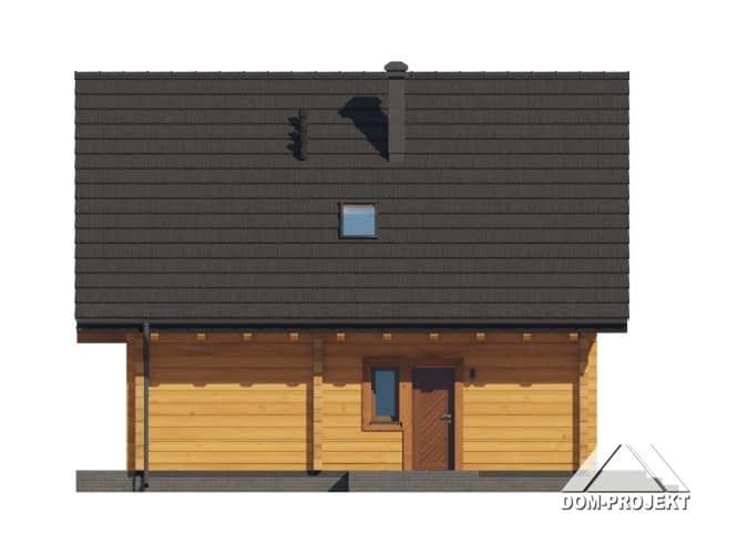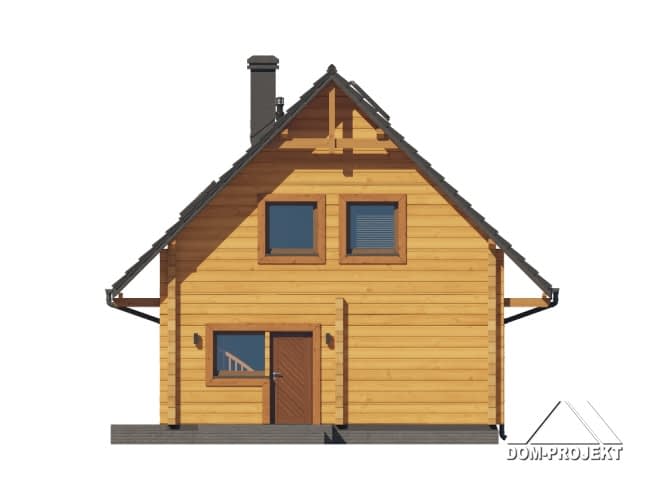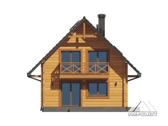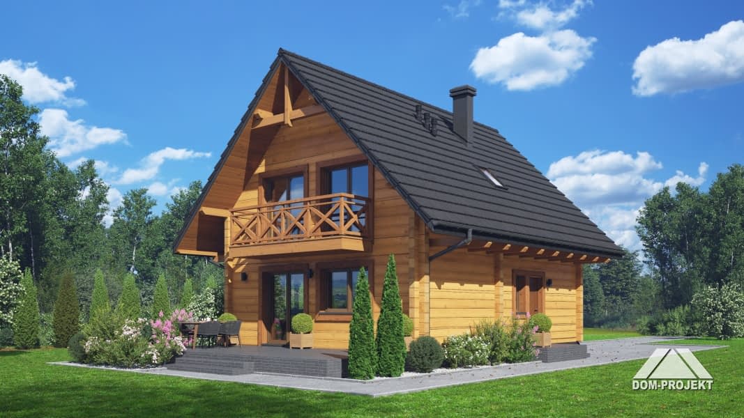 Dom z bali. Na parterze salon z kuchnią oraz wyjściem na taras. Pokój, komunikacja, łazienka, kotłownia, wiatrołap. Na poddaszu trzy pokoje, łazienka, komunikacja oraz balkon dostępny z dwóch pokoi. Zwarta bryła budynku oraz dach dwuspadowy sprzyjają szybkiej i taniej budowie oraz niskim kosztom eksploatacji.Rzuty
