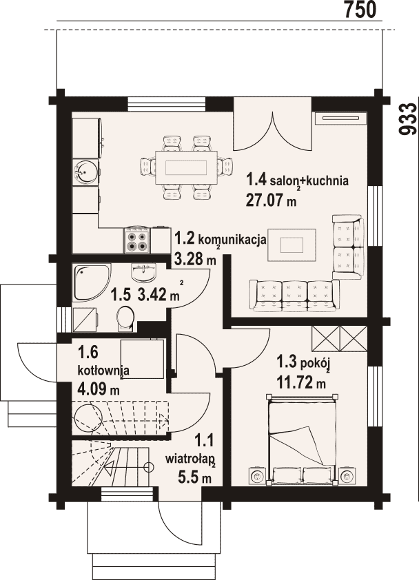 - 1.4 - salon+kuchnia27.07 m²