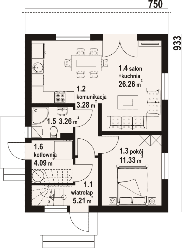 - 1.4 - kuchnia, salon26.26 m²