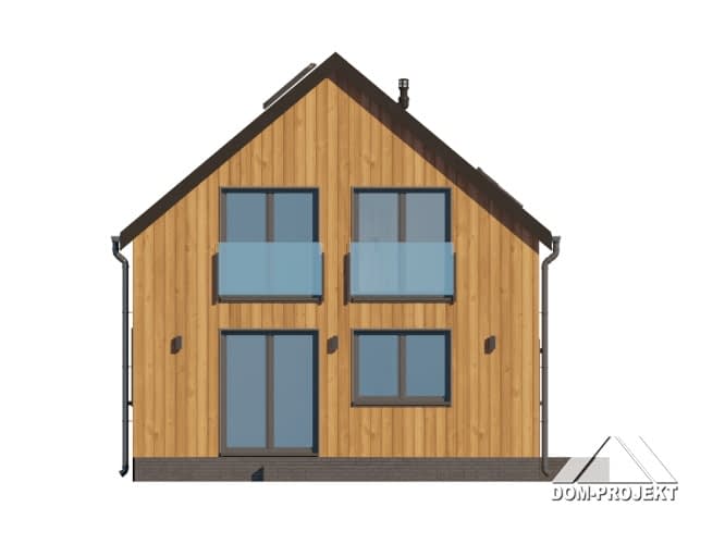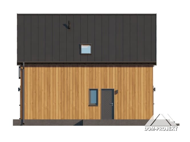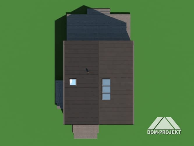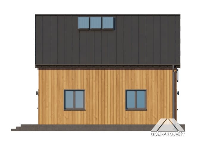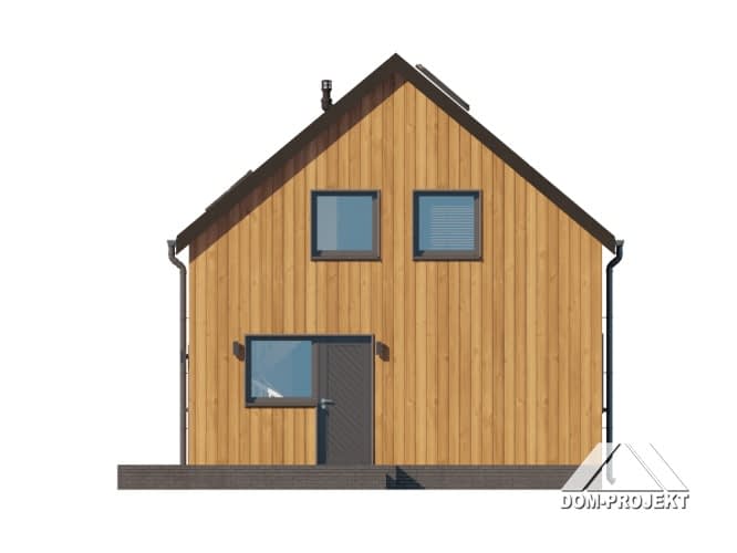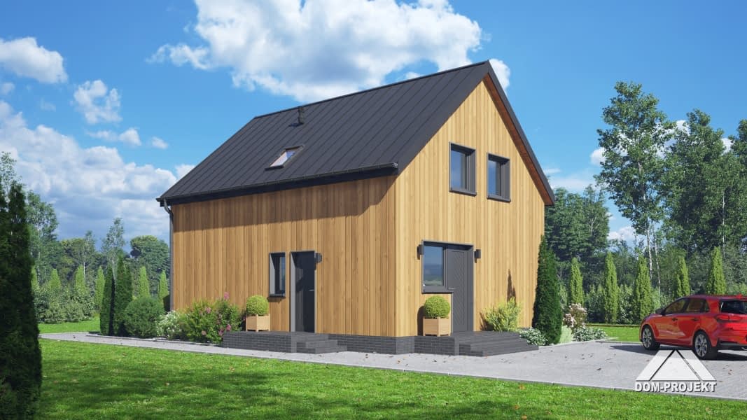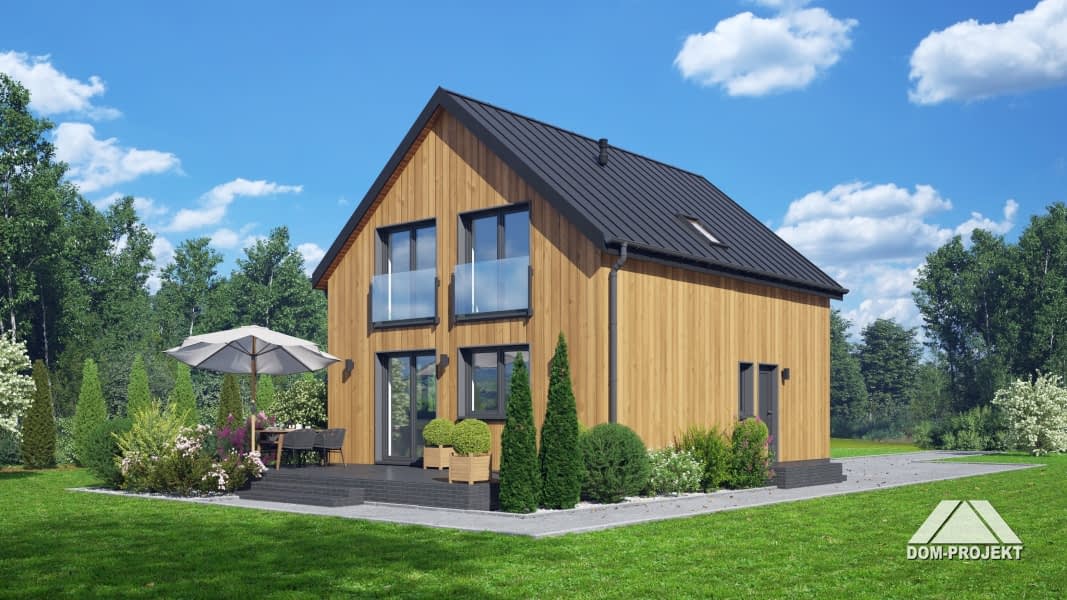 Dom z poddaszem użytkowym. Na parterze salon z kuchnią oraz wyjściem na taras. Pokój, łazienka, kotłownia, komunikacja, wiatrołap. Na poddaszu trzy pokoje, łazienka, komunikacja. Zwarta bryła budynku oraz dach dwuspadowy sprzyjają szybkiej i taniej budowie oraz niskim kosztom eksploatacji.Rzuty