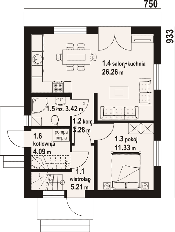 - 1.4 - salon+kuchnia26.26 m²