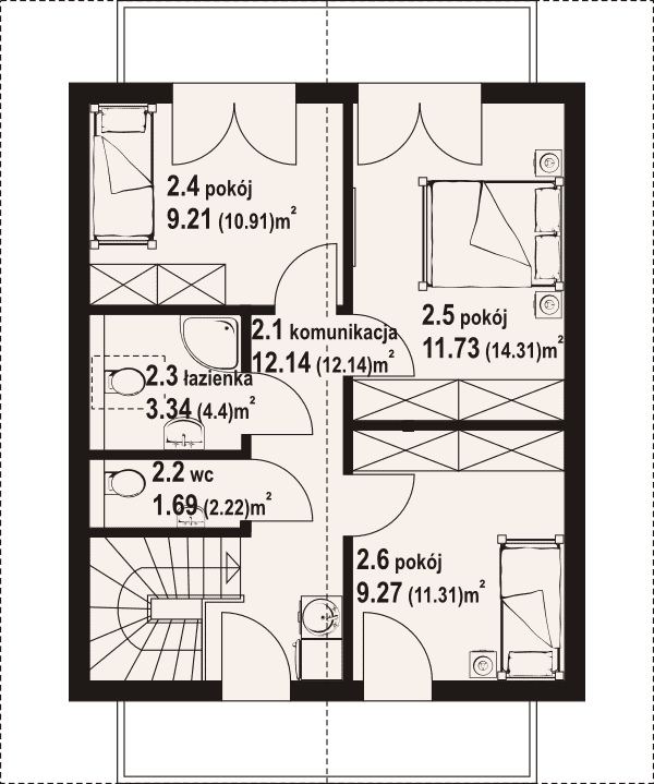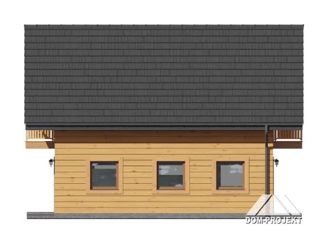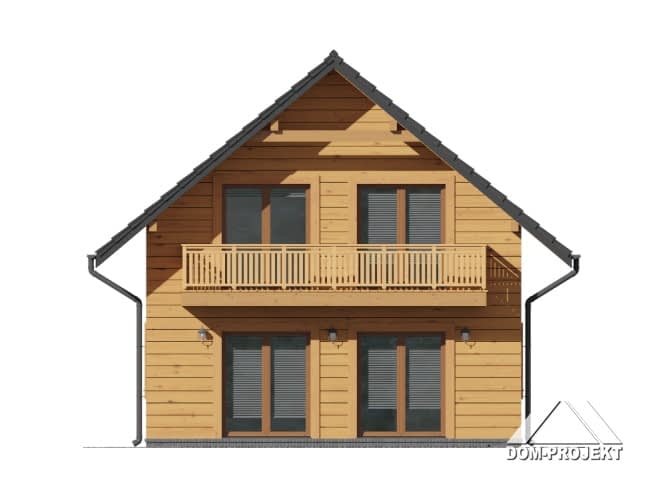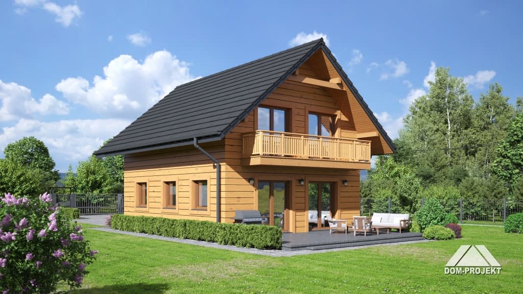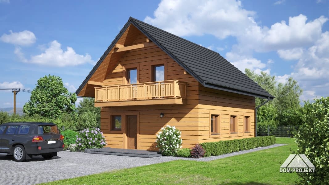 Dom w konstrukcji szkieletu drewnianego. Salon z aneksem kuchennym i wyjściem na taras. Dwa pokoje, łazienka, wc, wiatrołap i pomieszczenie gospodarcze.Na poddaszu trzy pokoje, łazienka, wc, komunikacja i dwa balkony. Zwarta bryła budynku i dach dwuspadowy sprzyjają szybkiej i taniej budowie i niskim kosztom eksploatacji.Rzuty