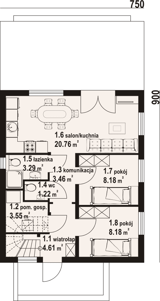- 1.6 - kuchnia, salon20.76 m²