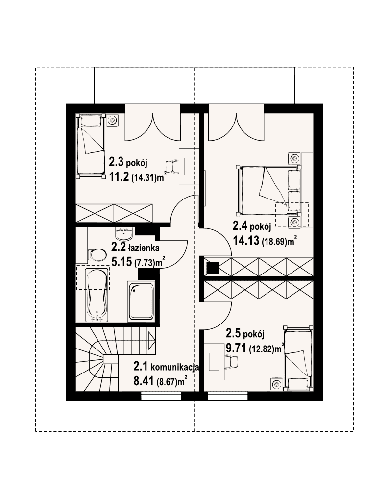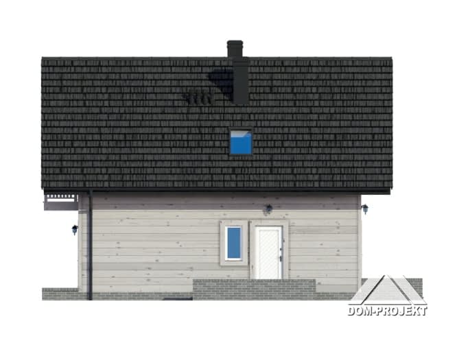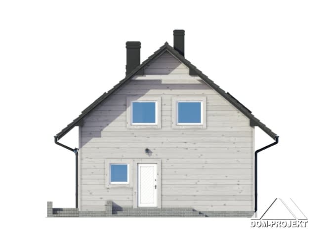 Dom w konstrukcji szkieletu drewnianego. Duży salon z aneksem kuchennym, kominkiem i wyjściem na taras. Pokój, łazienka, kotłownia, wiatrołap. Na poddaszu trzy pokoje, łazienka, komunikacja i balkon.Zwarta bryła budynku i dach dwuspadowy sprzyjają szybkiej i taniej budowie i niskim kosztom eksploatacji.Rzuty