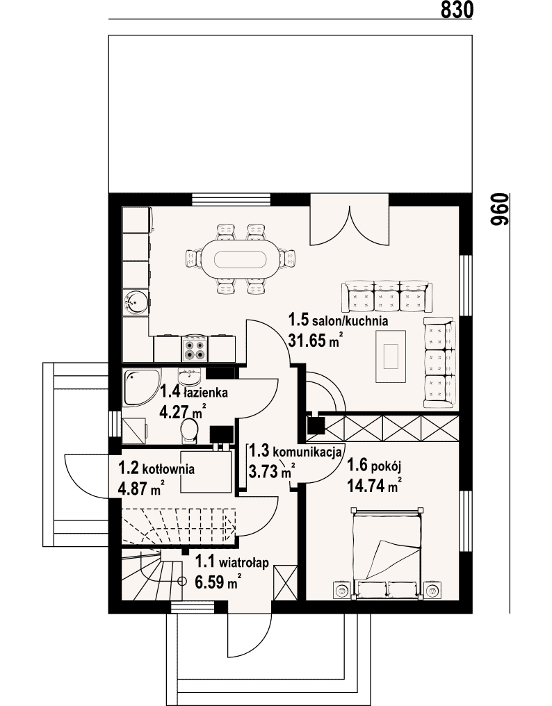 - 1.5 - kuchnia, salon31.65 m²