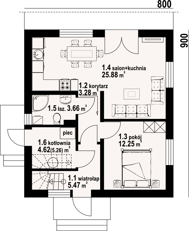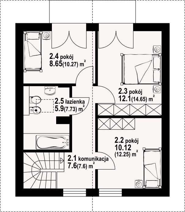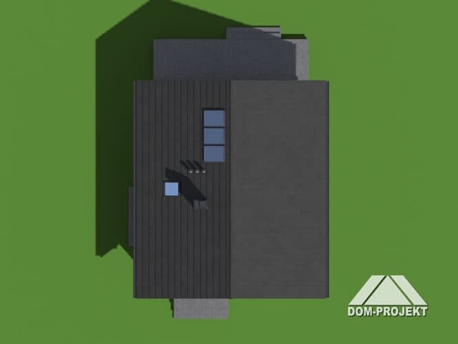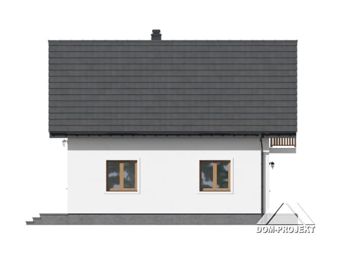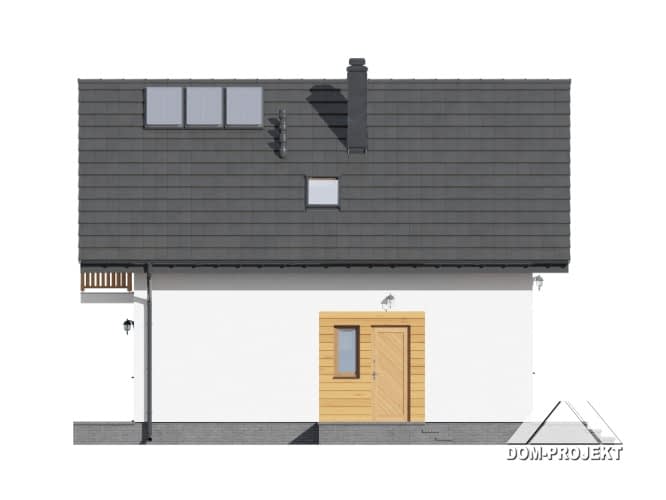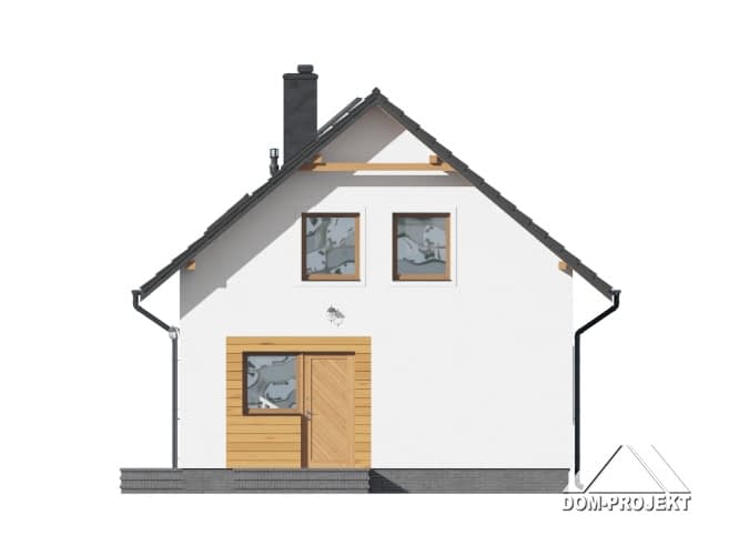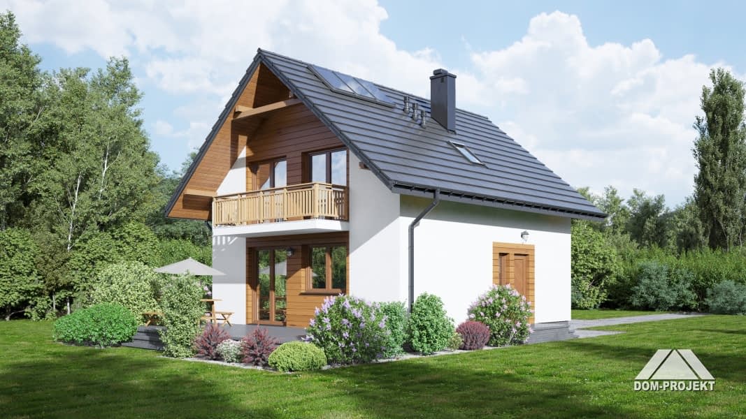 Mały dom z poddaszem użytkowym. Na parterze salon z kuchnią i wyjściem na taras, pokój, łazienka, kotłownia, wiatrołap i schody na poddasze. Na poddaszu trzy pokoje, łazienka i komunikacja. Dwa pokoje poddasza mają balkon. Zwarta bryła budynku i dach dwuspadowy sprzyjają szybkiej i taniej budowie i niskim kosztom eksploatacji.Rzuty