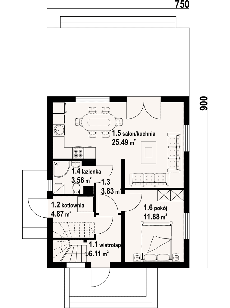 - 1.5 - kuchnia, salon25.49 m²