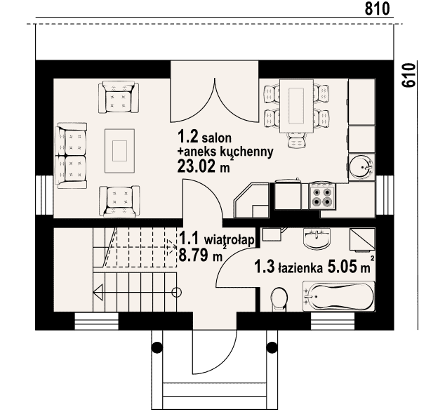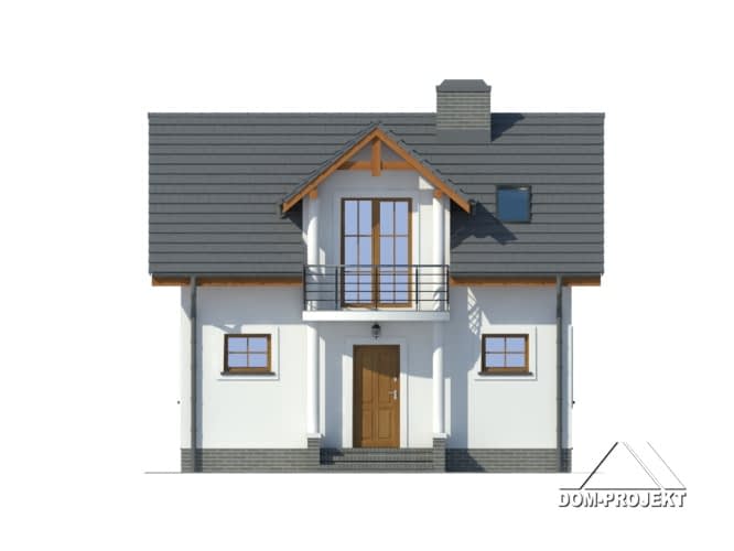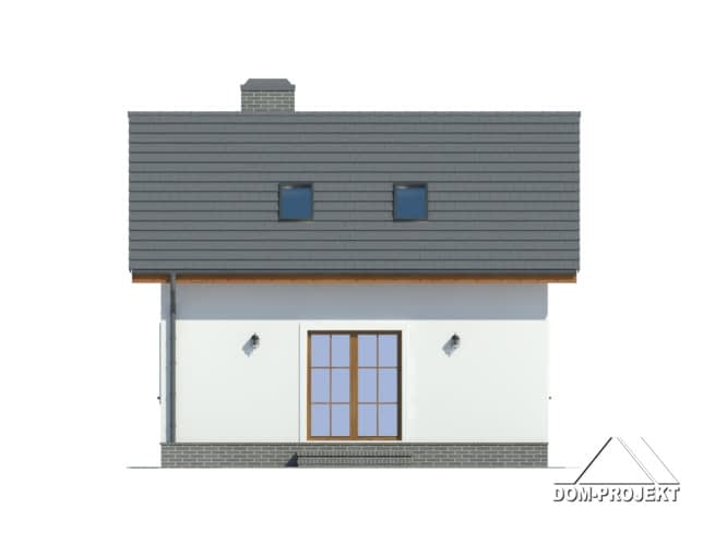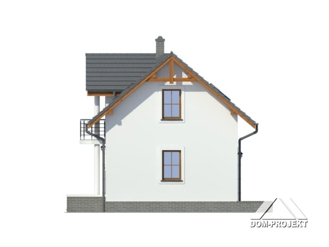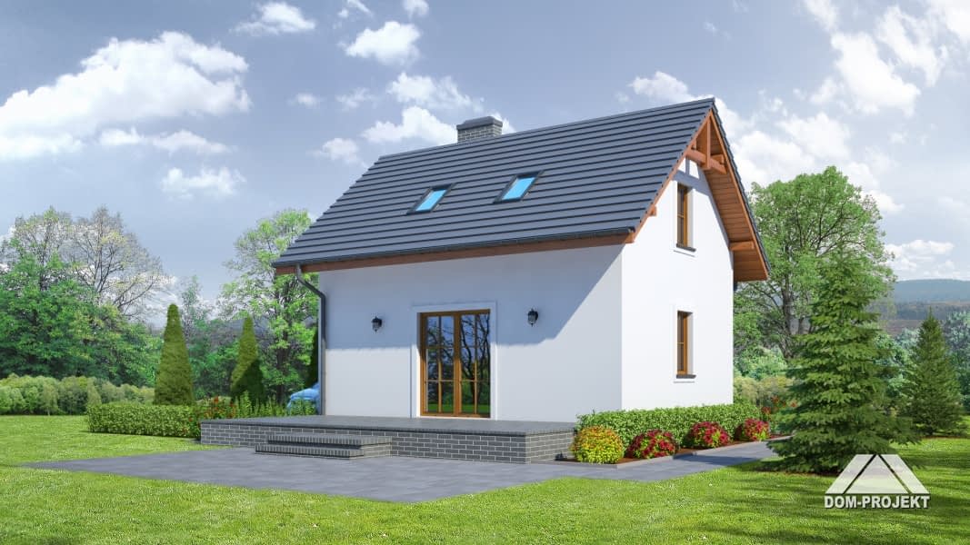 Mały domek z poddaszem użytkowym. Salon z aneksem kuchennym i łazienką to pomieszczenia na parterze. Na poddaszu duże pokoje (sypialnie) i łazienka. Zwarta bryła i jeden komin zapewnia niskie koszty budowy i eksploatacji.Rzuty