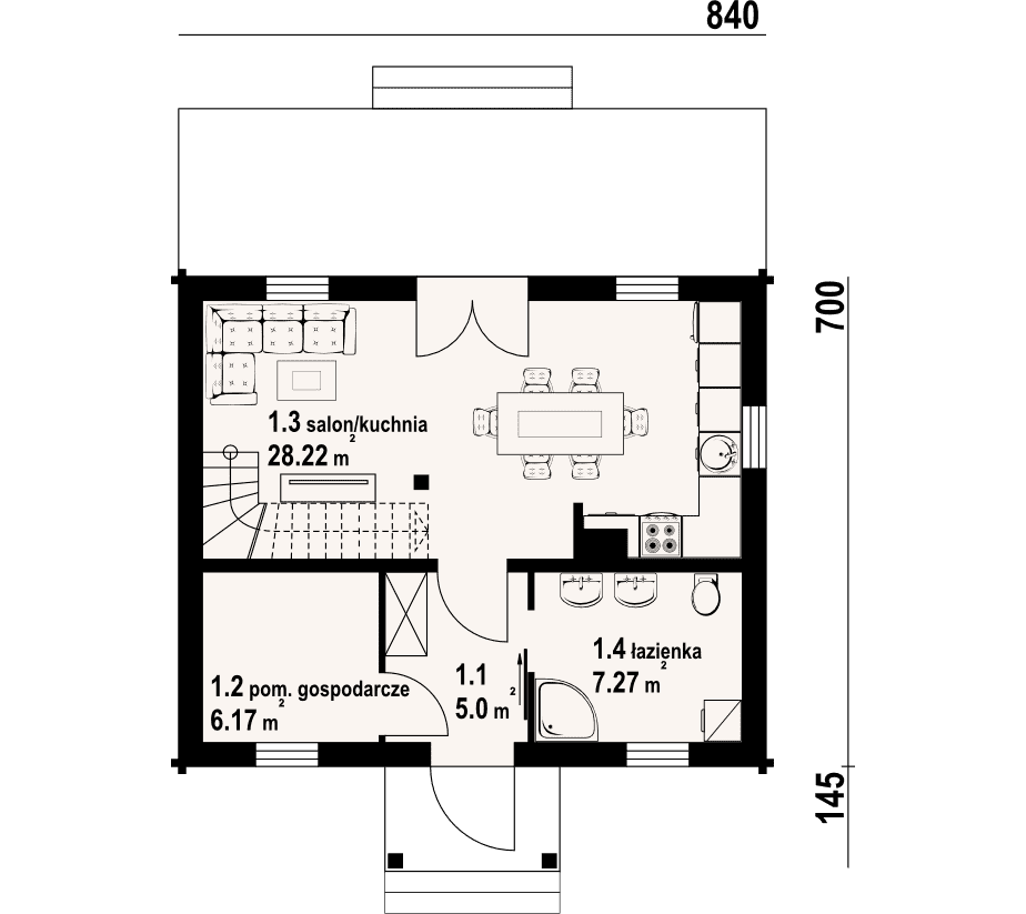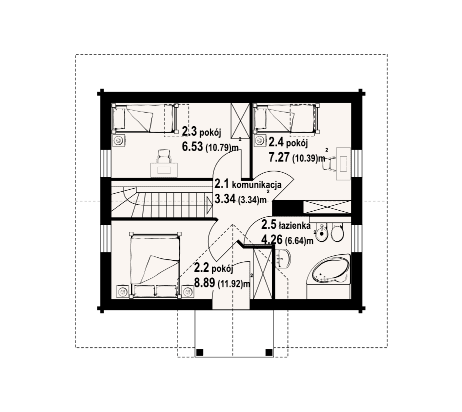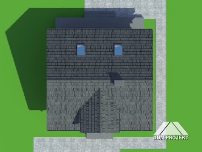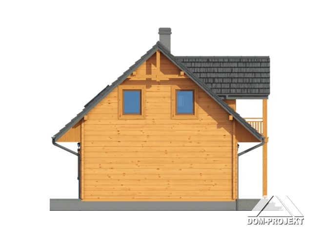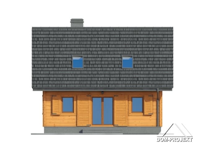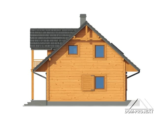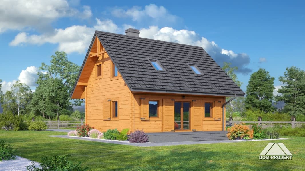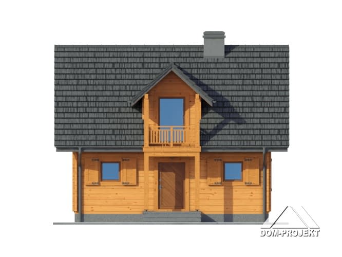 Dom w konstrukcji szkieletu drewnianego. Duży salon z aneksem kuchennym, wyjściem na taras i schodami na poddasze. Łazienka, wiatrołap i pomieszczenie gospodarcze. Na poddaszu trzy pokoje, łazienka, komunikacja i balkon. Zwarta bryła budynku i dach dwuspadowy sprzyjają szybkiej i taniej budowie i niskim kosztom eksploatacji.Rzuty