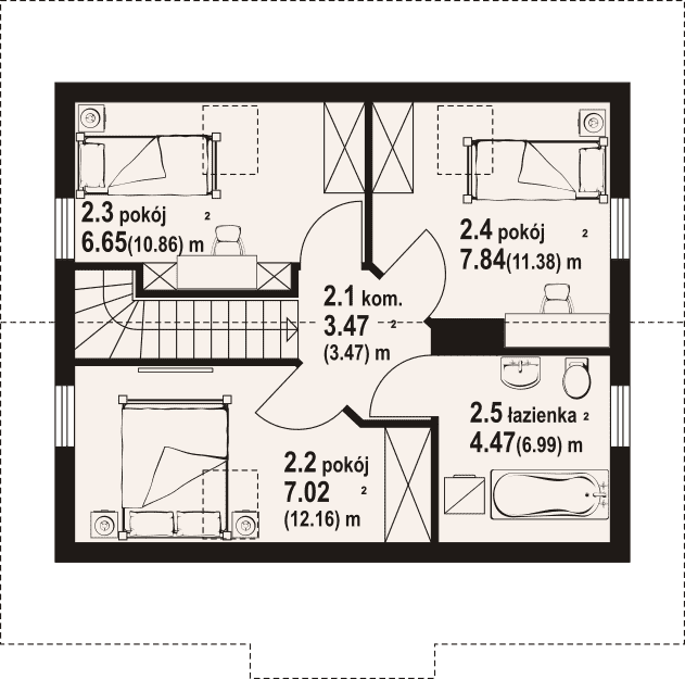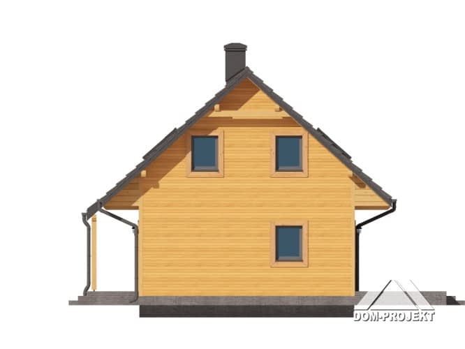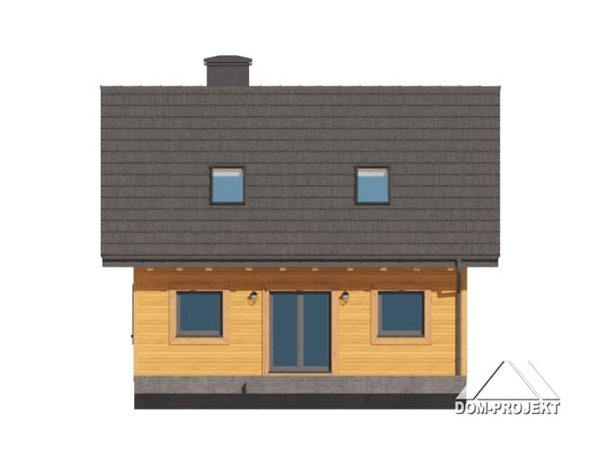 Dom w konstrukcji szkieletu drewnianego. Na parterze salon z aneksem kuchennym, kominkiem, wyjściem na taras i schodami na poddasze. Pokój, wiatrołap, łazienka. Na poddaszu trzy pokoje, komunikacja, łazienka. Zwarta bryła budynku oraz dach dwuspadowy sprzyjają szybkiej i taniej budowie oraz niskim kosztom eksploatacji.Rzuty