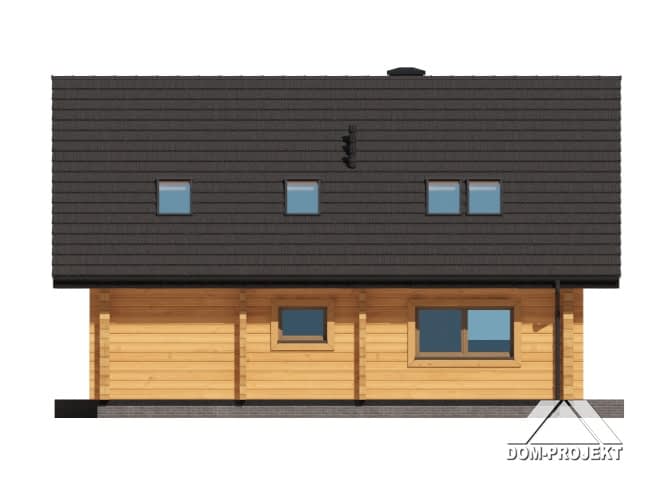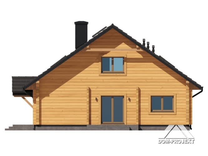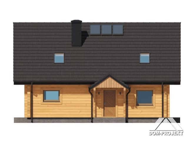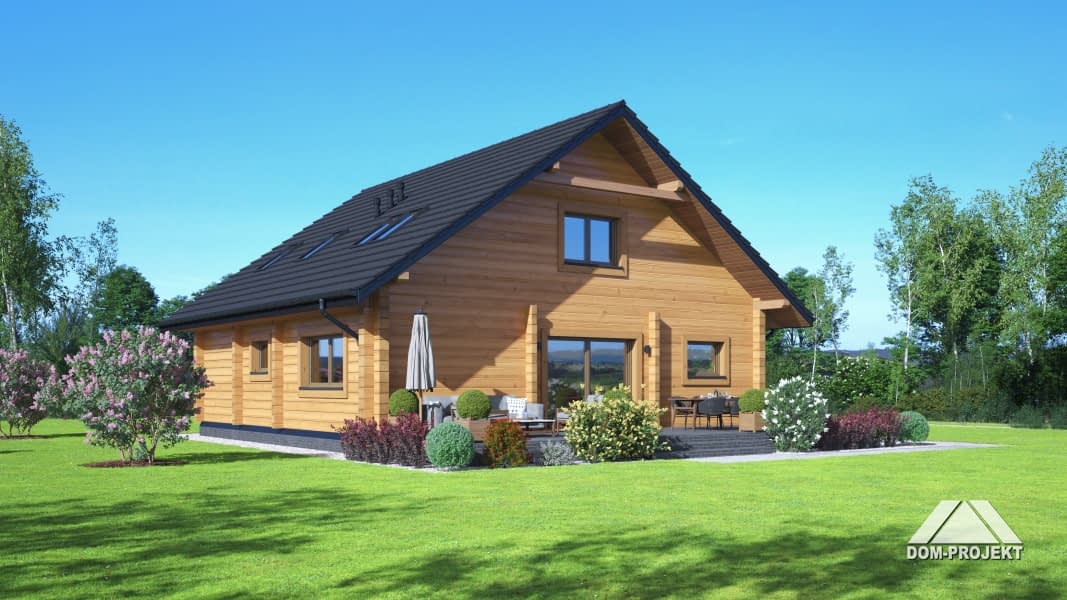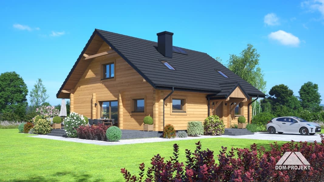 Dom z bali. Na parterze salon z jadalnią, kuchnią, kominkiem oraz wyjściem na taras. Trzy pokoje, dwie łazienki, komunikacja, wiatrołap, pomieszczenie gospodarcze. Na poddaszu dwa pokoje, dwie garderoby, łazienka, komunikacja. Zwarta bryła budynku oraz dach dwuspadowy sprzyjają szybkiej i taniej budowie oraz niskim kosztom eksploatacji.Rzuty