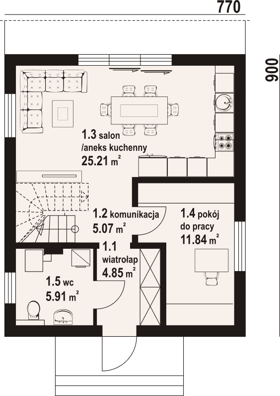 - 1.3 - salon z aneksem kuchennym25.21 m²