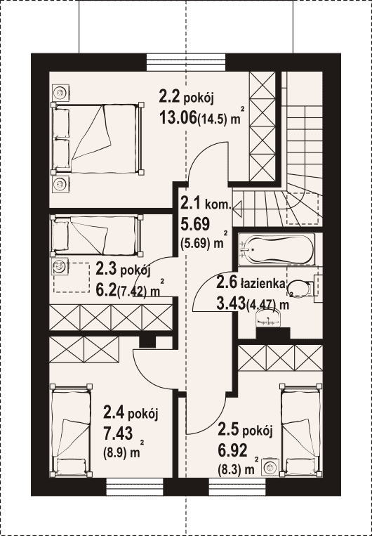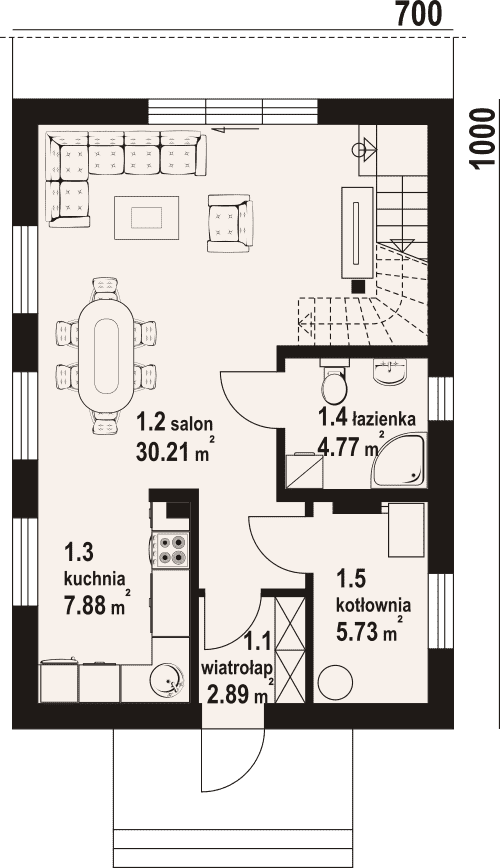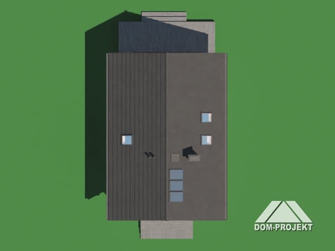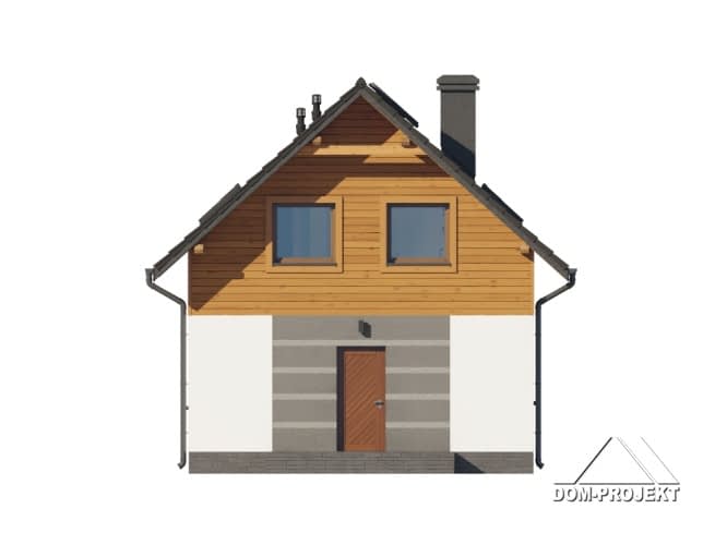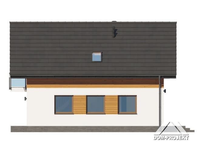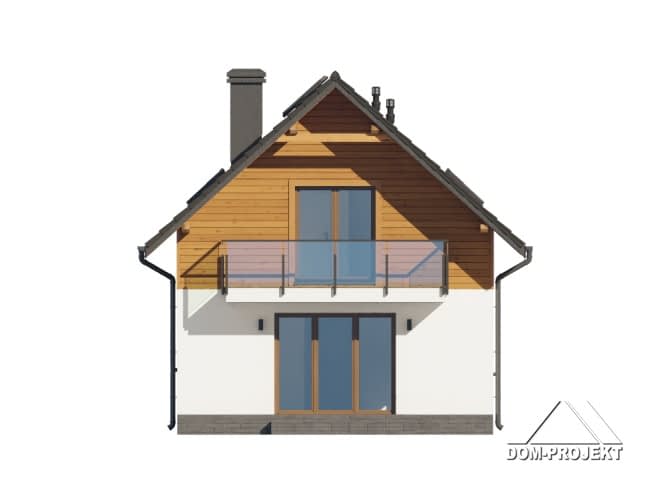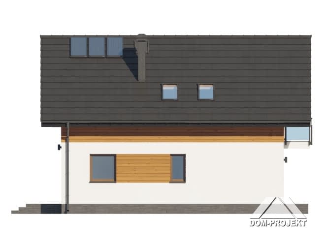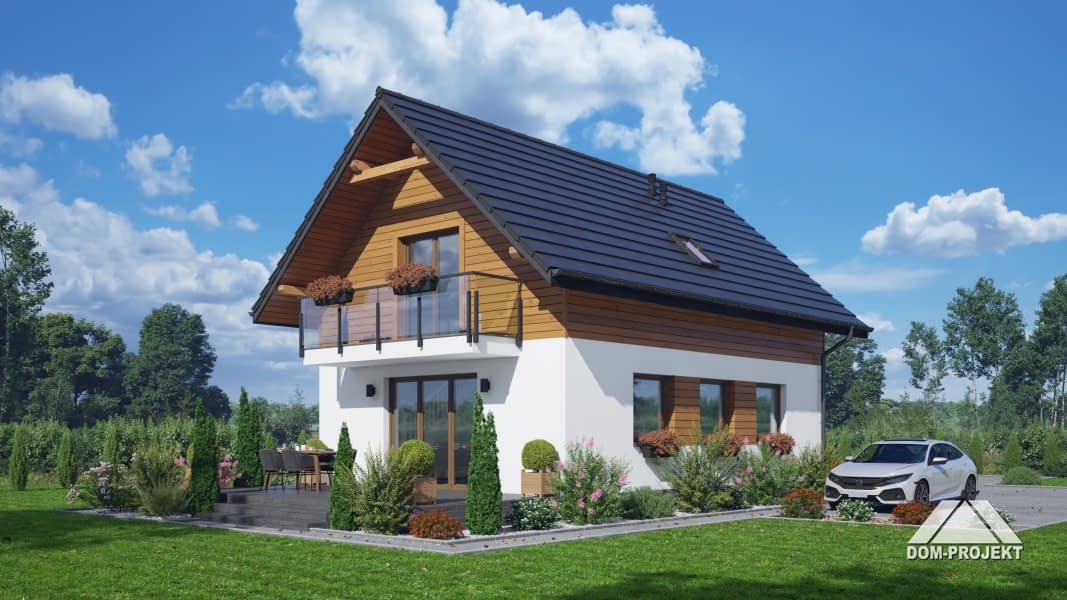 Dom z poddaszem użytkowym. Na parterze salon z kuchnią, wyjściem na taras i schodami na poddasze. Wiatrołap, łazienka, kotłownia. Na poddaszu cztery pokoje, łazienka, komunikacja oraz balkon. Zwarta bryła budynku oraz dach dwuspadowy sprzyjają szybkiej i taniej budowie oraz niskim kosztom eksploatacji.Rzuty