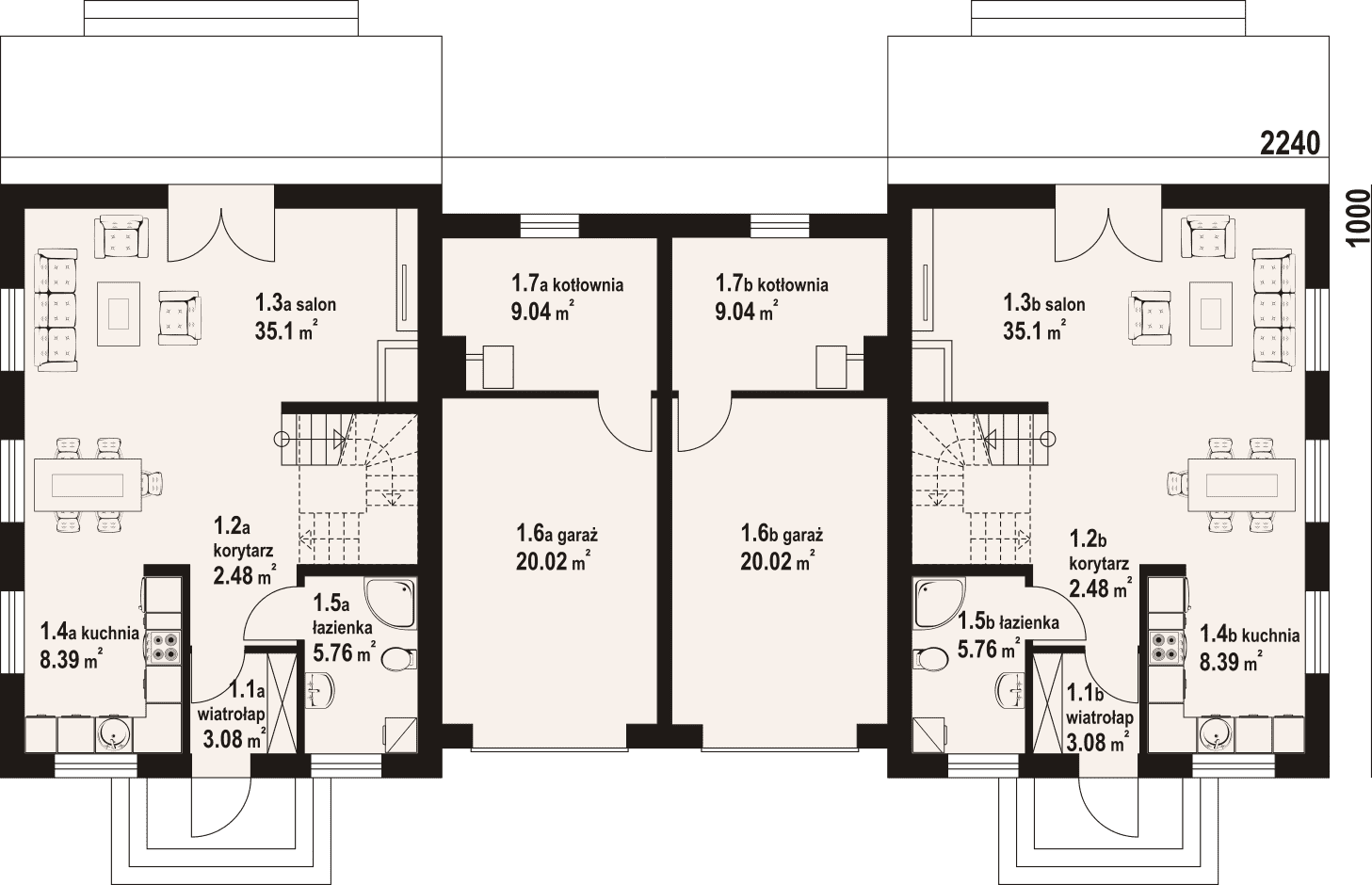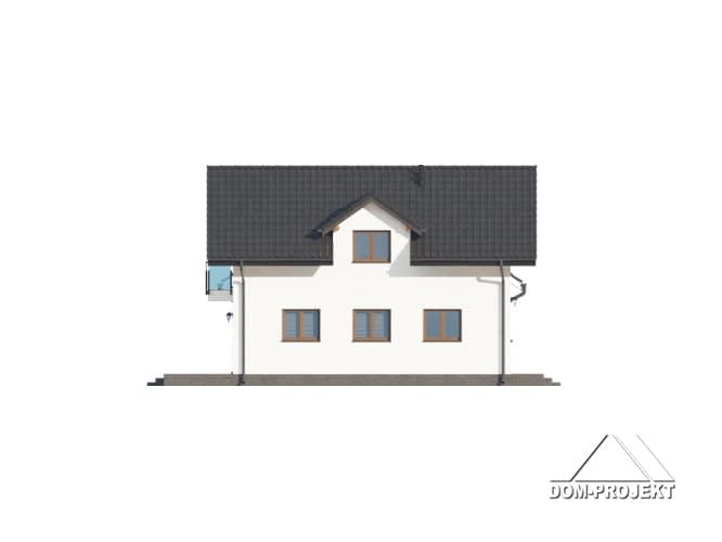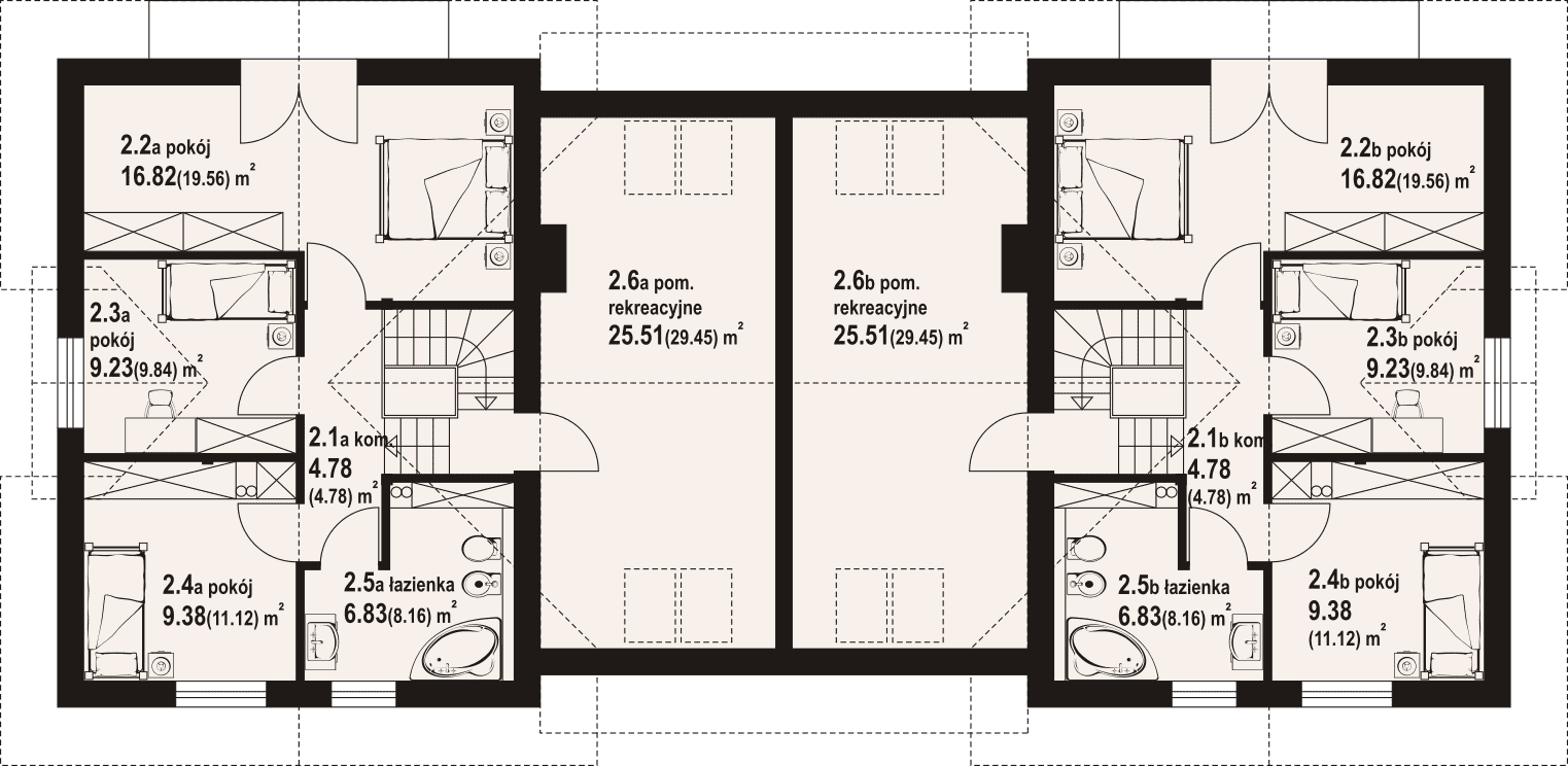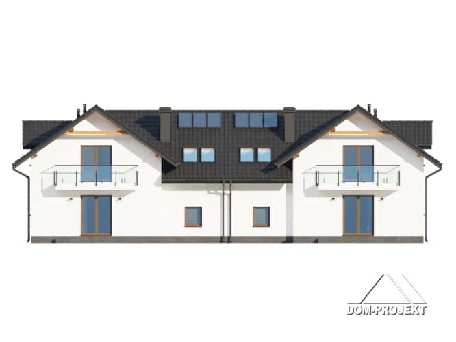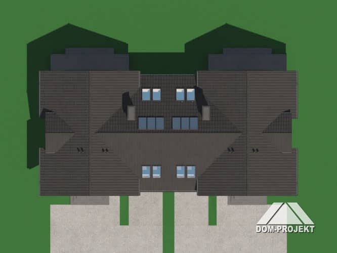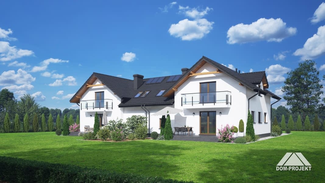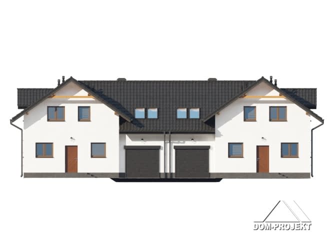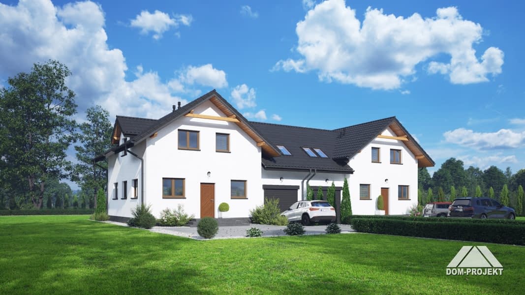 Dom dwulokalowy. Każdy lokal składa się z: dużego salonu z kominkiem i wyjściem na taras, aneksu kuchennego, łazienki, wiatrołapu, korytarza, garażu oraz kotłowni. Na piętrze: trzy pokoje, łazienka, komunikacja oraz pomieszczenie rekreacyjne nad garażem. Zwarta bryła budynku i dach dwuspadowy sprzyjają szybkiej i taniej budowie oraz niskim kosztom eksploatacji.Rzuty