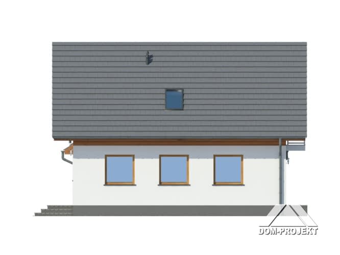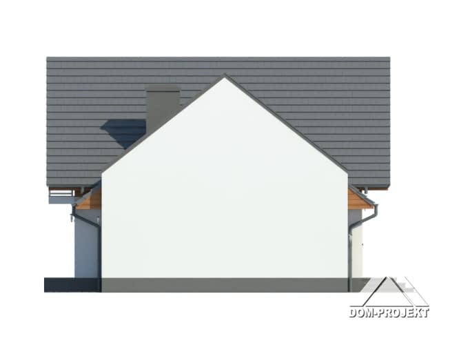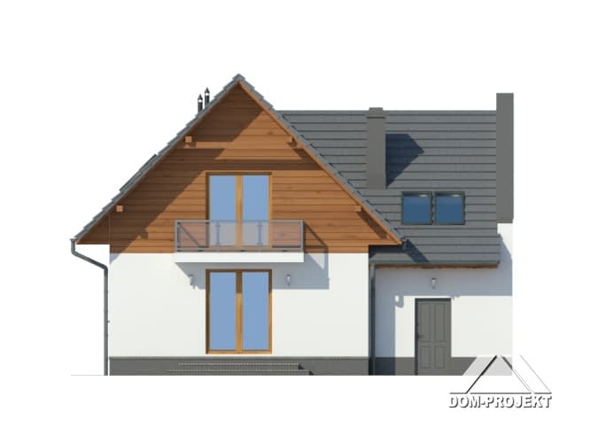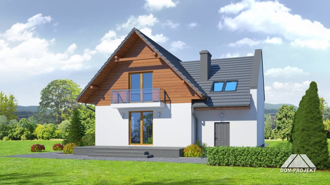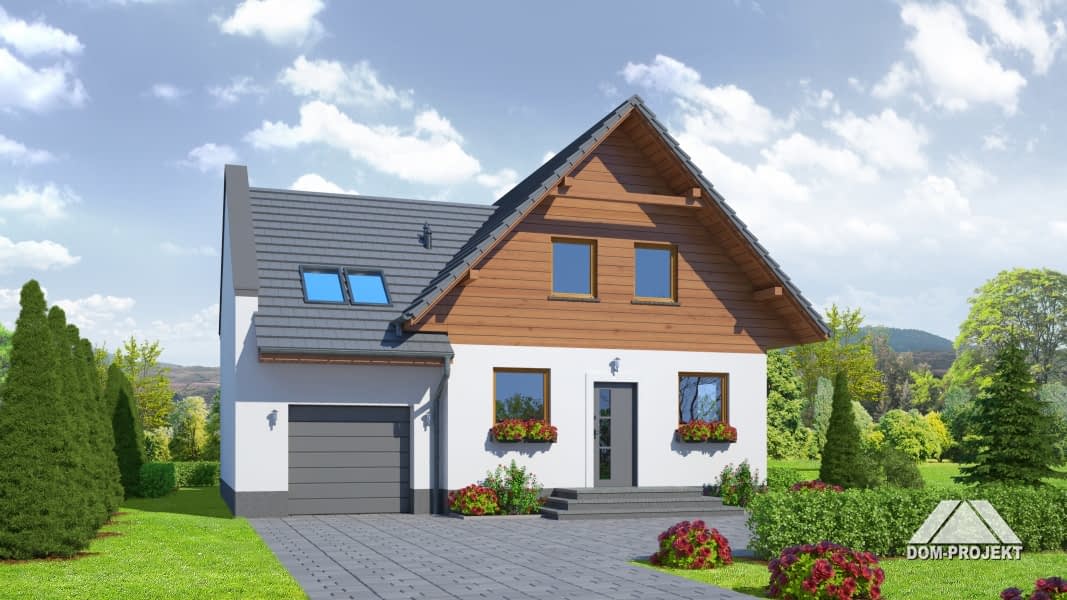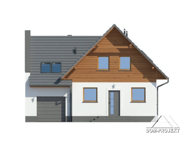 Dom z poddaszem mieszkalnym i garażem. Duży salon z aneksem kuchennym, kominkiem, wyjściem na taras i schodami na poddasze. Łazienka, wiatrołap, garaż i kotłownia. Na poddaszu cztery pokoje, łazienka, komunikacja, balkon. Ściana szczytowa umożliwia budowę w granicy lub w bliskiej odległości od granicy. Zwarta bryła budynku sprzyja szybkiej i taniej budowie i niskim kosztom eksploatacji.Rzuty