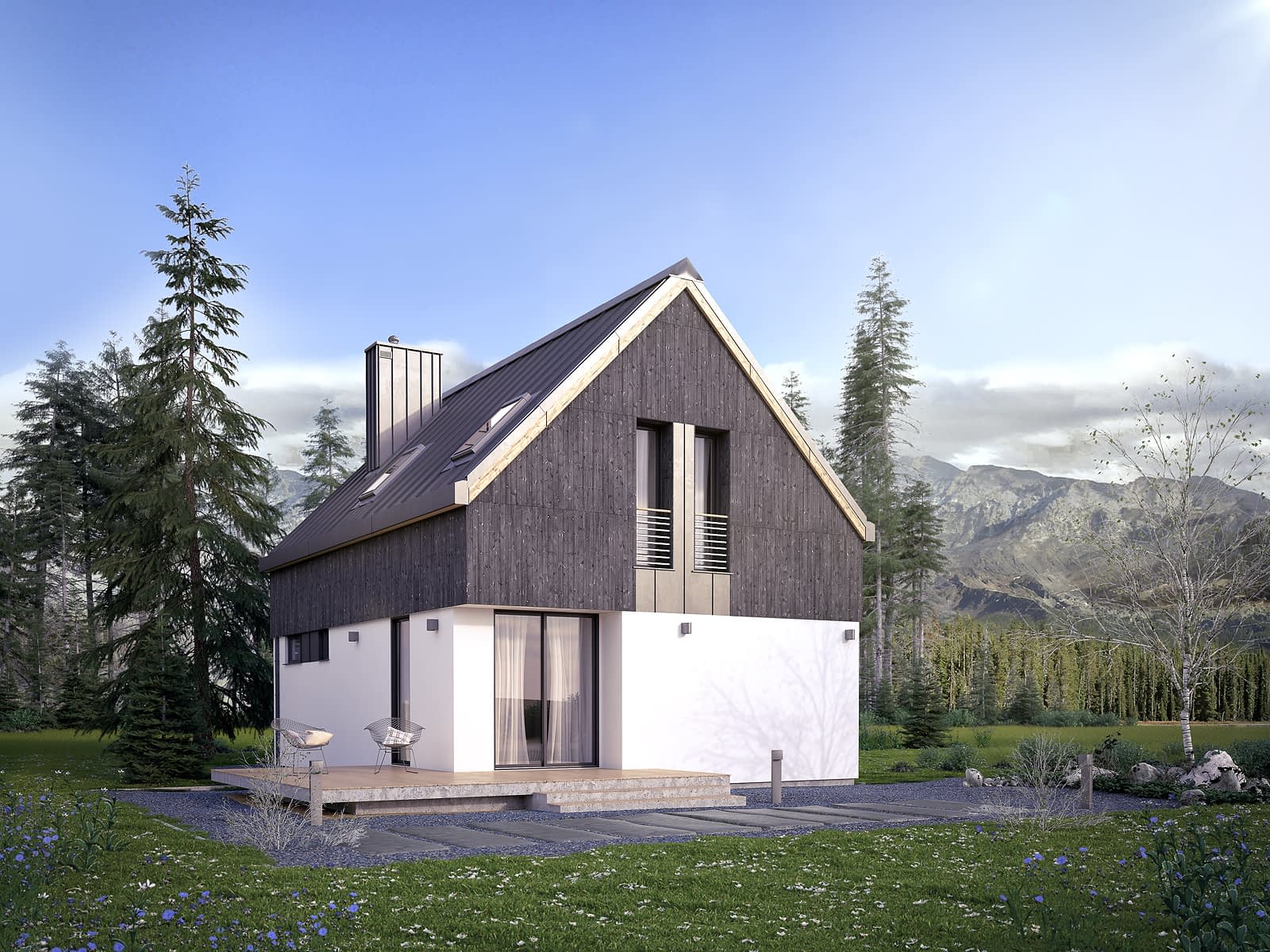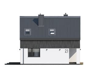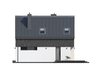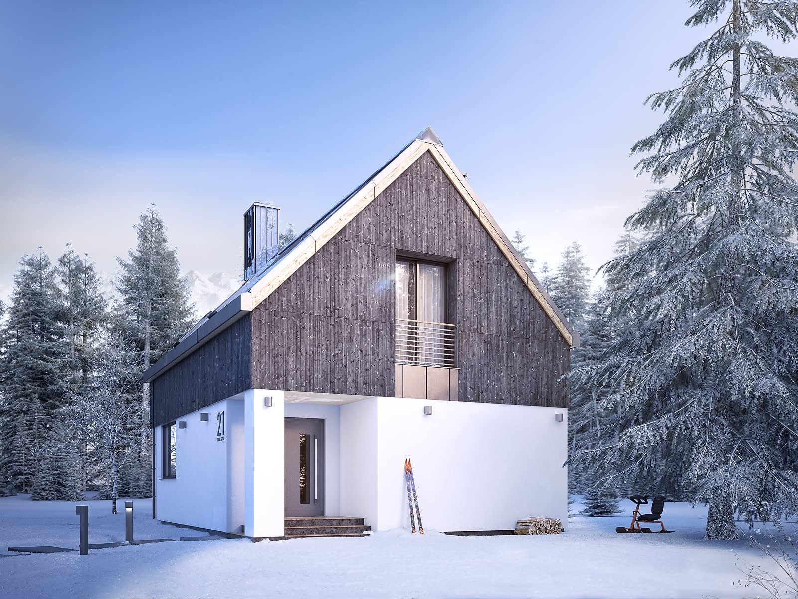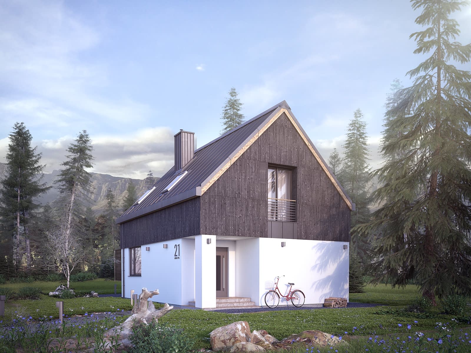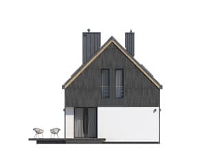 Przytulny dom dla 4-osobowej rodziny. Współczesna bryła budynku nawiązuje do budownictwa tradycyjnego. Wejście zostało podkreślone zapraszającym podcieniem. Na parterze znajduje się przestronna strefa dzienna z kominkiem, otwartą kuchnią i jadalnią. Strefa prywatna została zlokalizowana na poddaszu. Komfort użytkowania domu podnosi dodatkowa garderoba dostępna z głównej sypialni.Konstrukcja