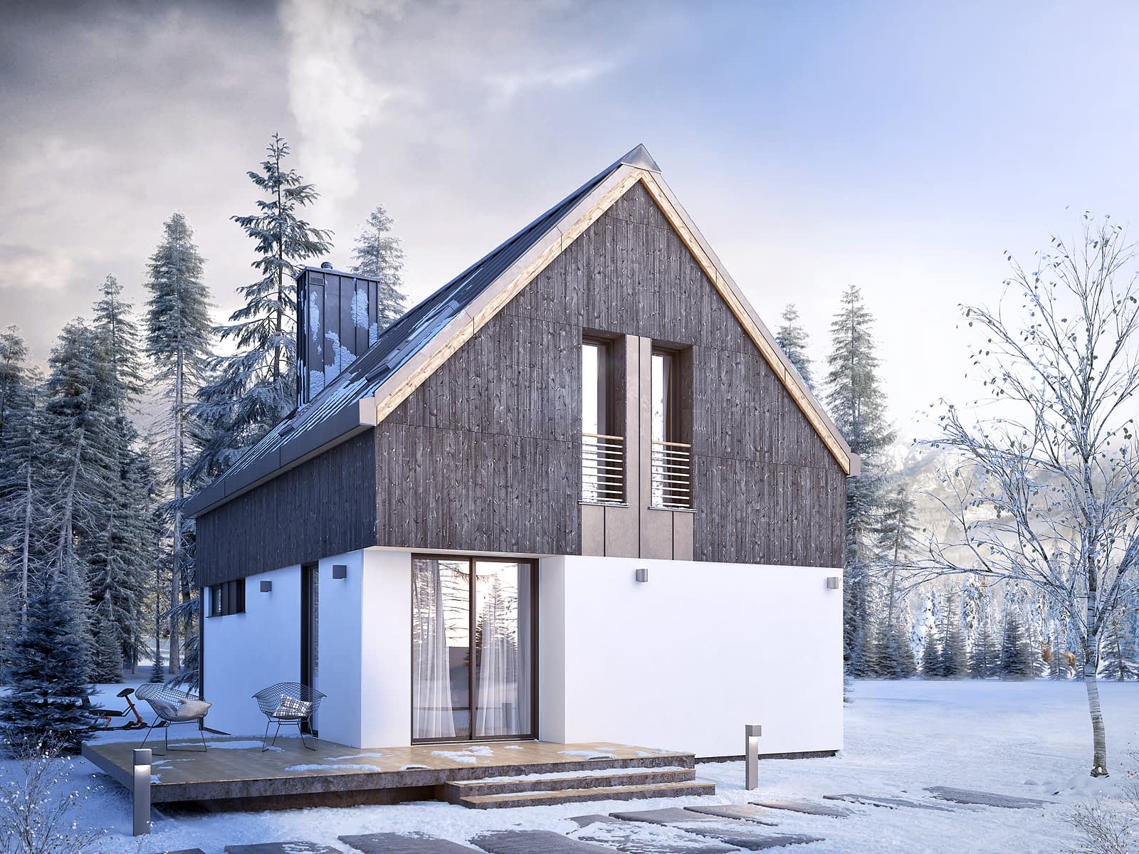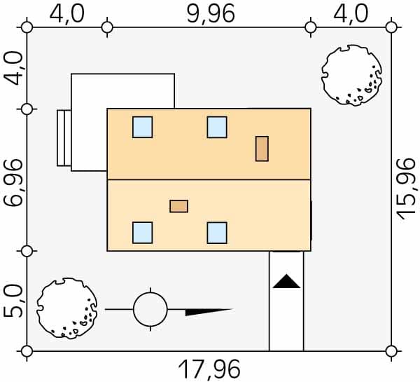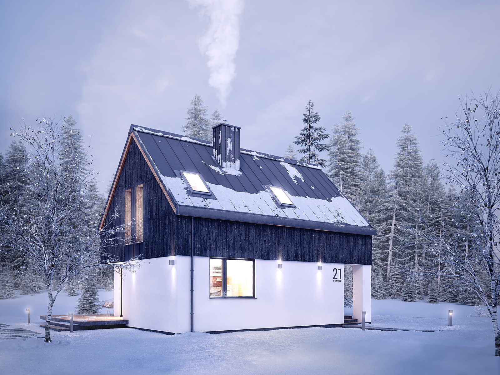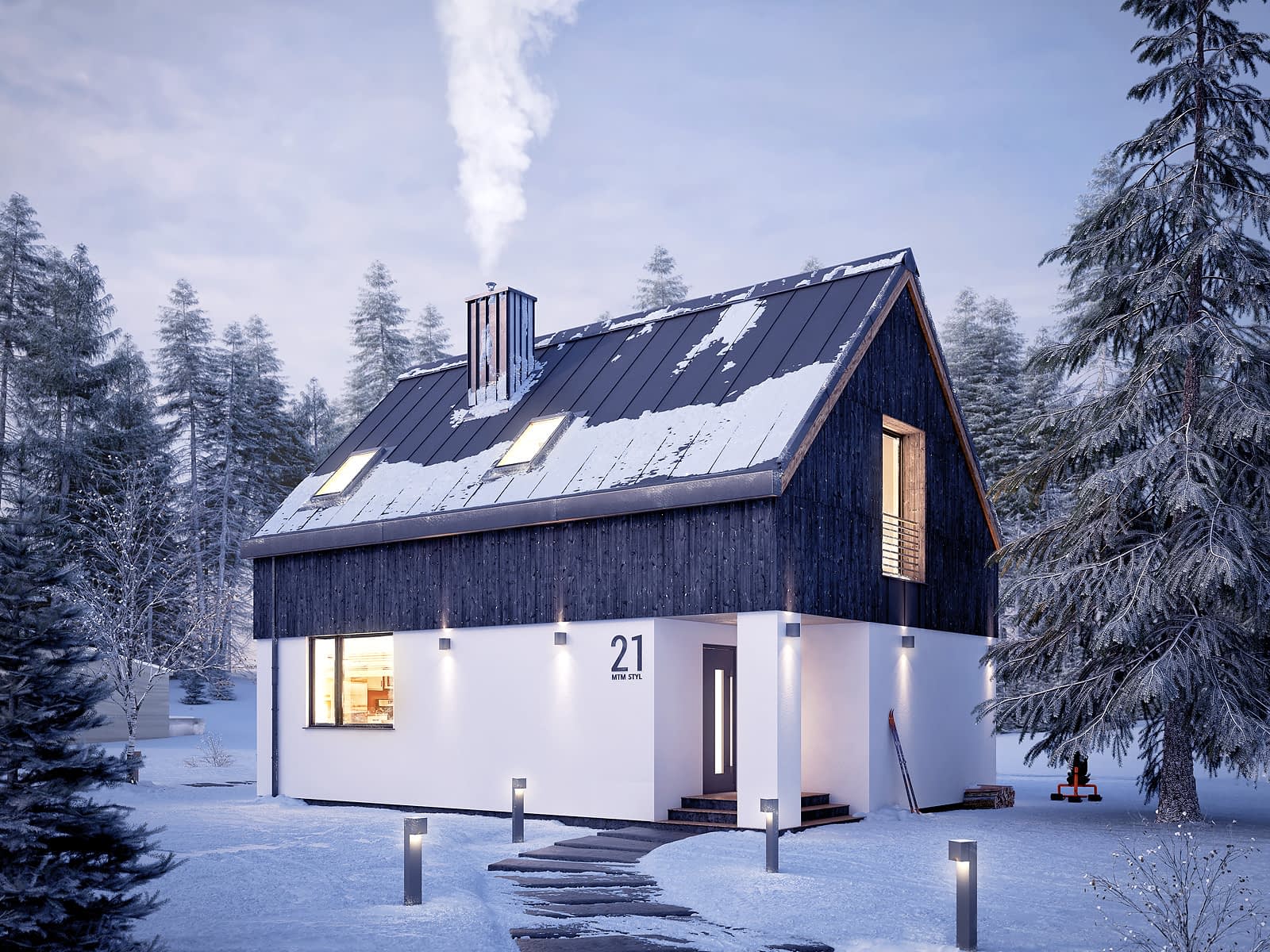 Przytulny dom dla 4-osobowej rodziny. Współczesna bryła budynku nawiązuje do budownictwa tradycyjnego. Wejście zostało podkreślone zapraszającym podcieniem. Na parterze znajduje się przestronna strefa dzienna z kominkiem, otwartą kuchnią i jadalnią. Strefa prywatna została zlokalizowana na poddaszu. Komfort użytkowania domu podnosi dodatkowa garderoba dostępna z głównej sypialni.Konstrukcja