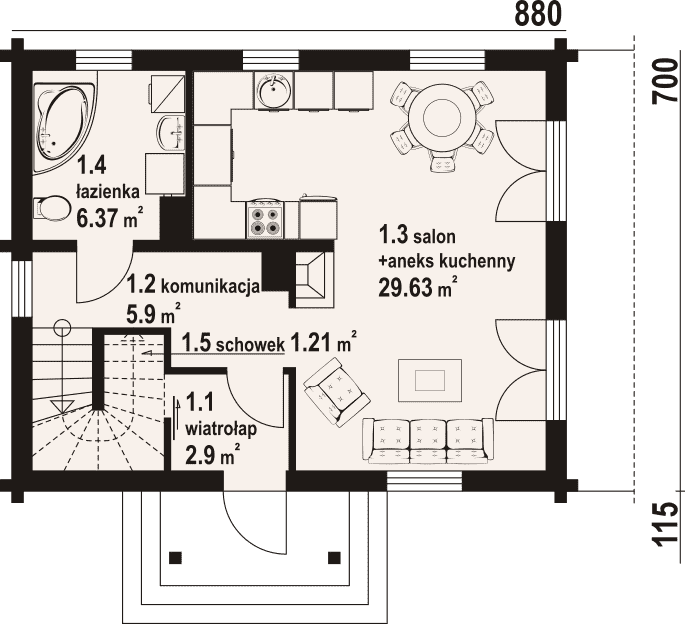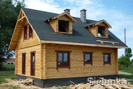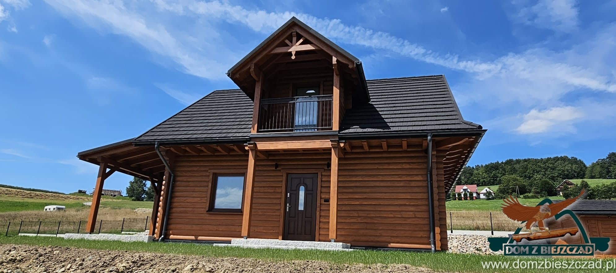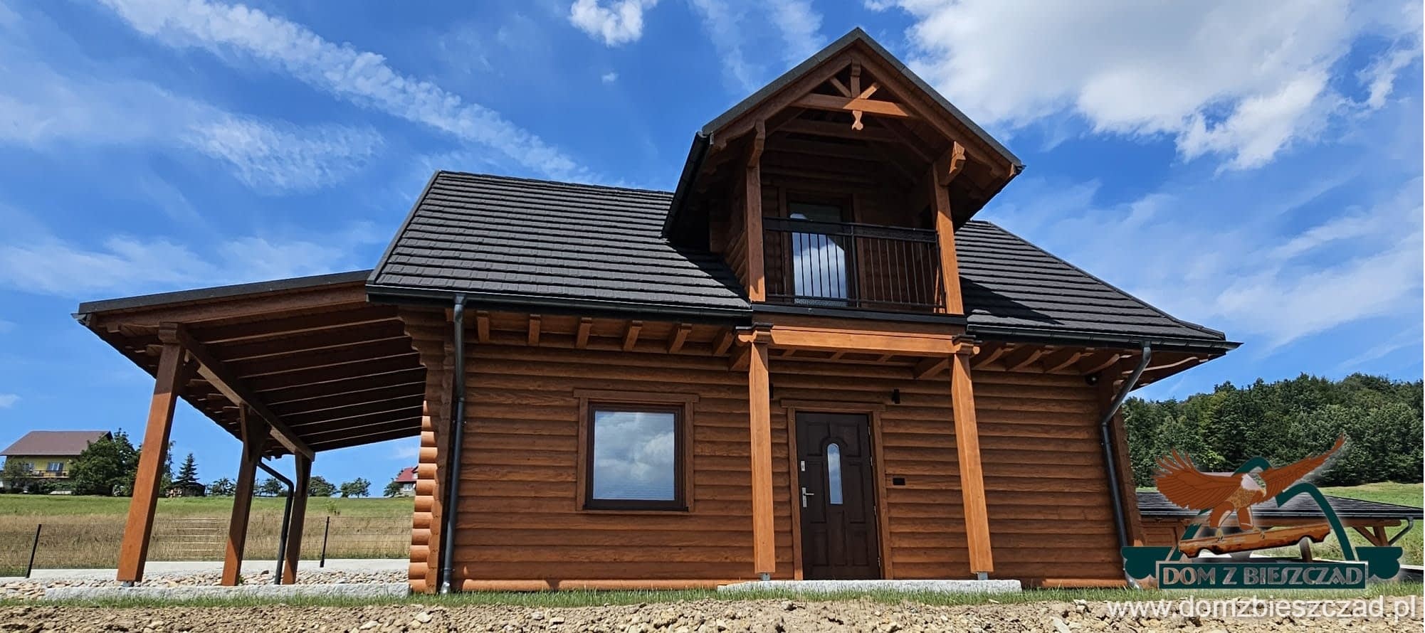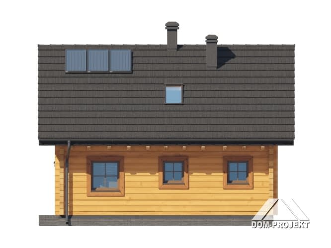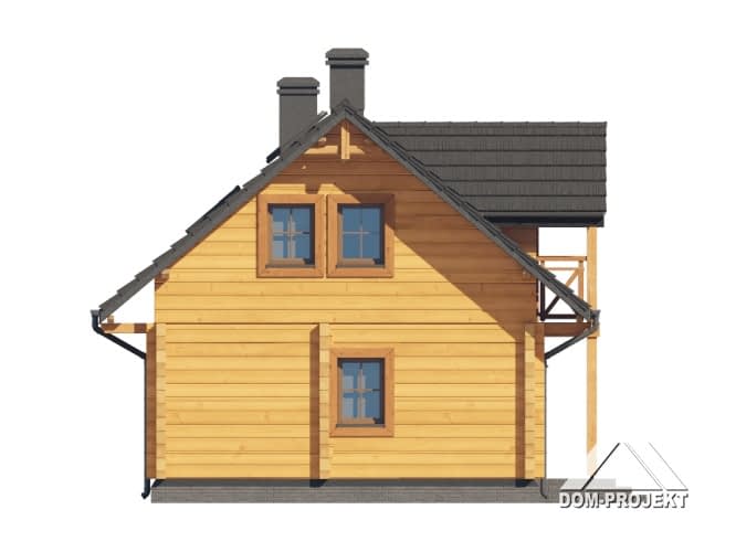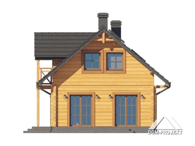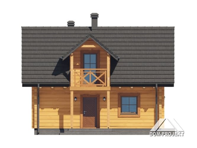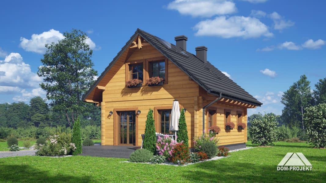 Dom z bali. Na parterze salon z aneksem kuchennym, kominkiem oraz wyjściami na taras. Łazienka, komunikacja, schowek, wiatrołap. Na poddaszu dwa pokoje, łazienka oraz balkon. Zwarta bryła budynku oraz dach dwuspadowy sprzyjają szybkiej i taniej budowie oraz niskim kosztom eksploatacji.Rzuty