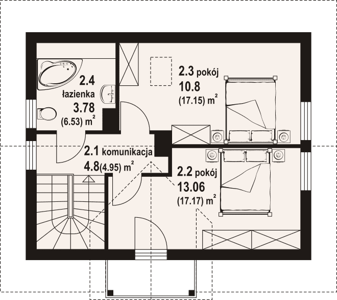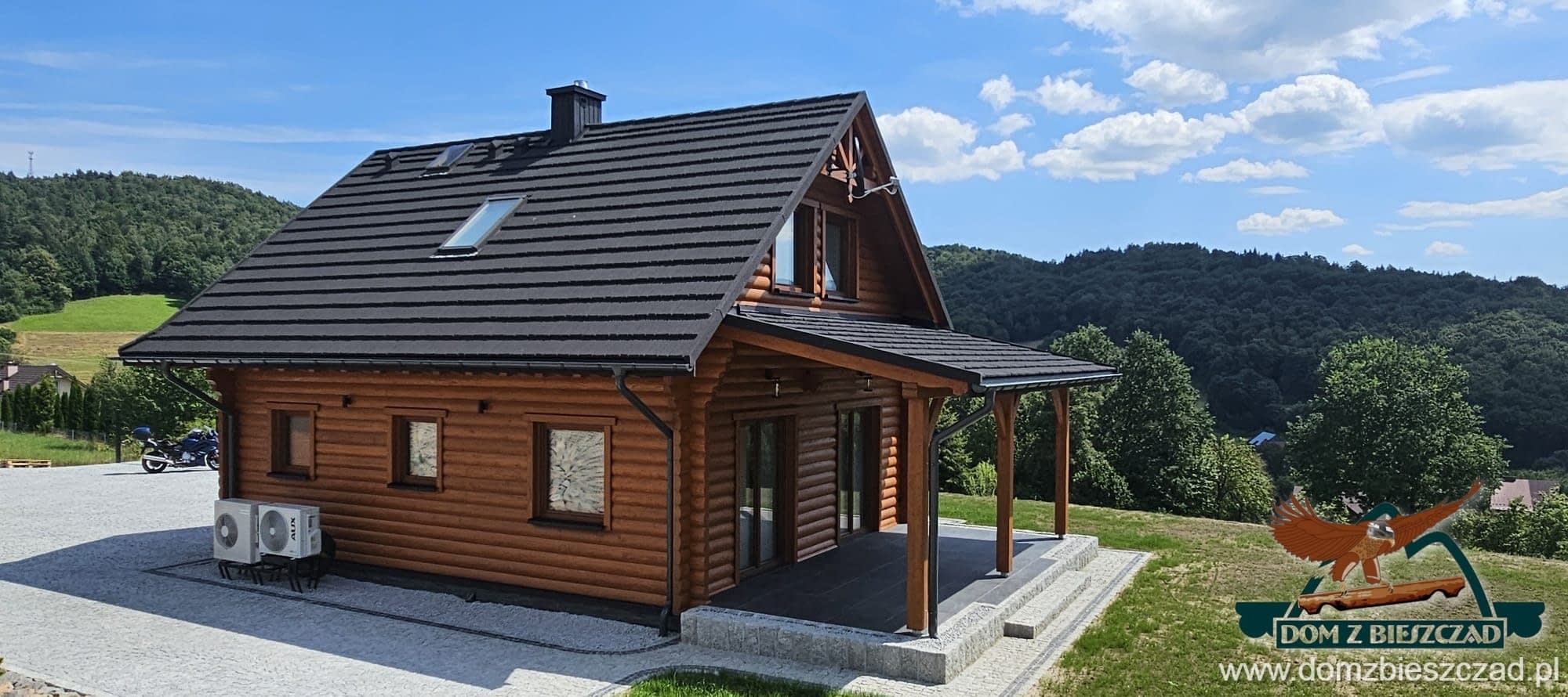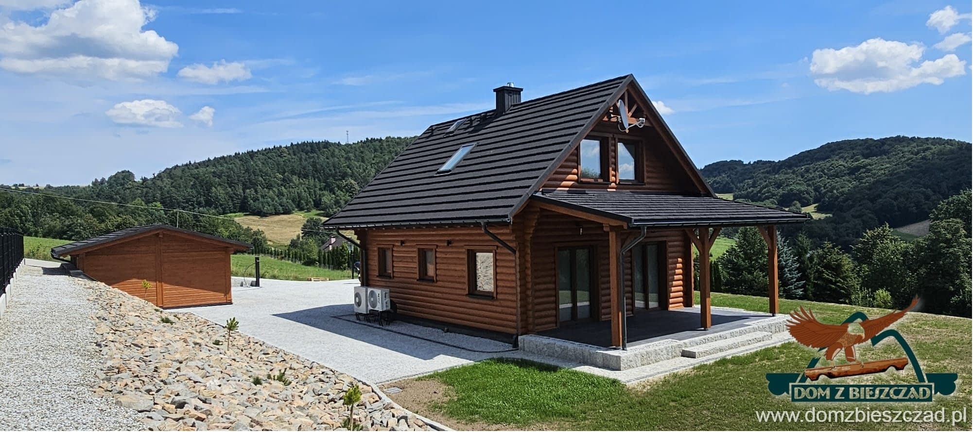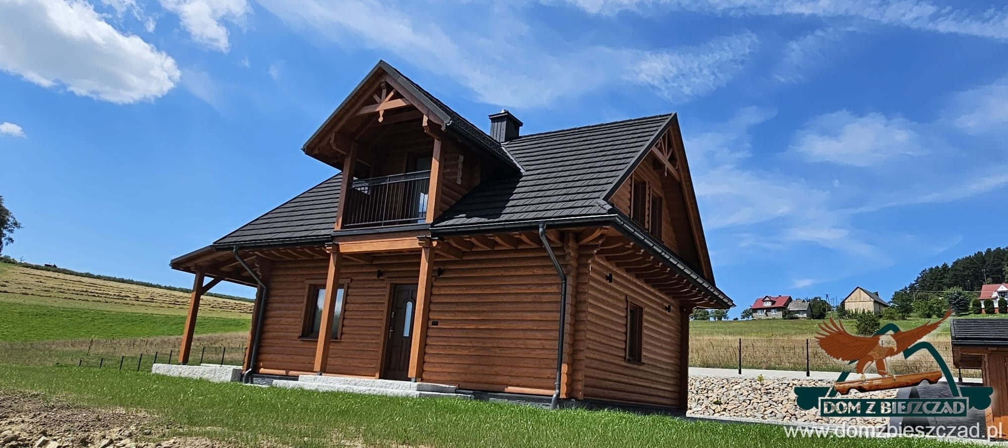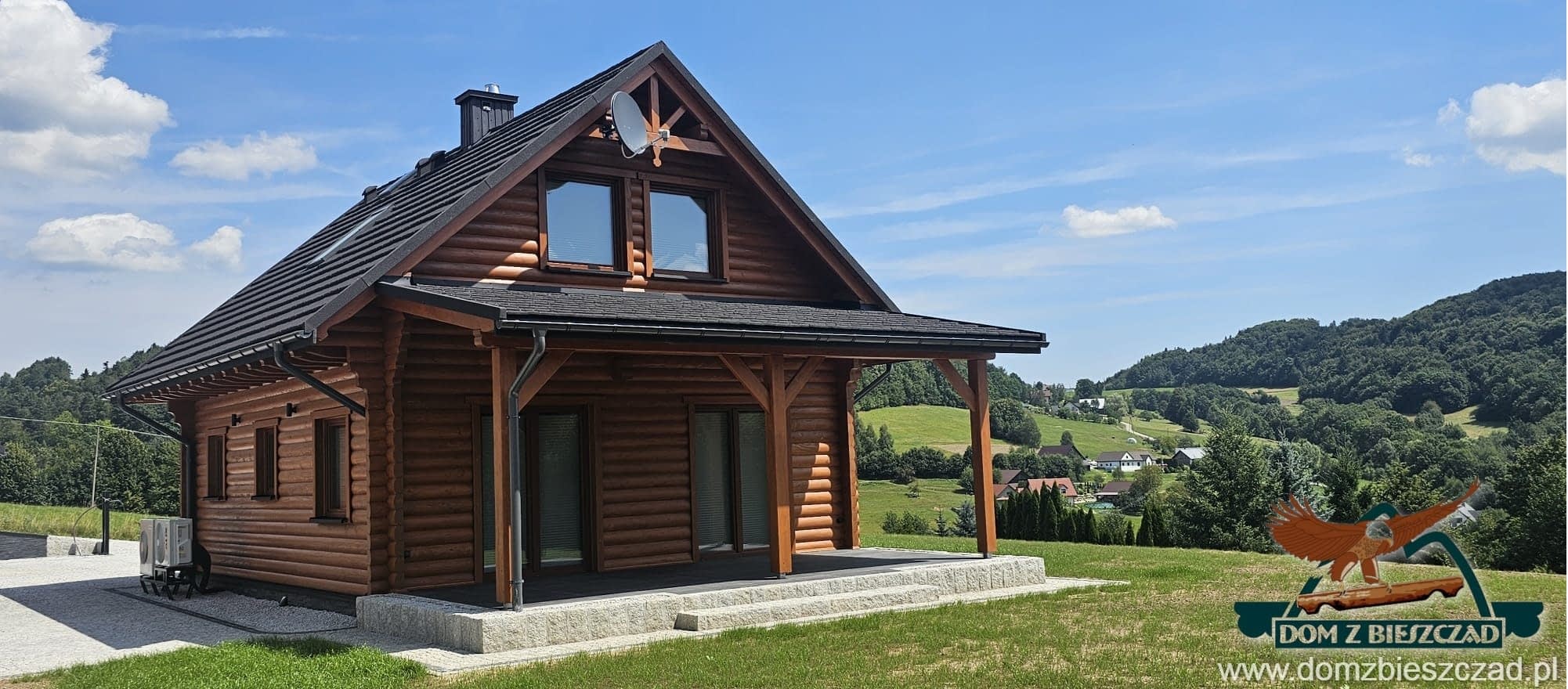 Dom z bali. Na parterze salon z aneksem kuchennym, kominkiem oraz wyjściami na taras. Łazienka, komunikacja, schowek, wiatrołap. Na poddaszu dwa pokoje, łazienka oraz balkon. Zwarta bryła budynku oraz dach dwuspadowy sprzyjają szybkiej i taniej budowie oraz niskim kosztom eksploatacji.Rzuty