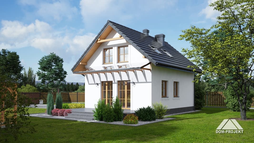 Dom z poddaszem użytkowym. Prosta i ekonomiczna bryła. Salon z aneksem kuchennym, dwie sypialnie. Kominek w salonie z możliwością rozprowadzenia ciepła. Dom tani w budowie.Rzuty