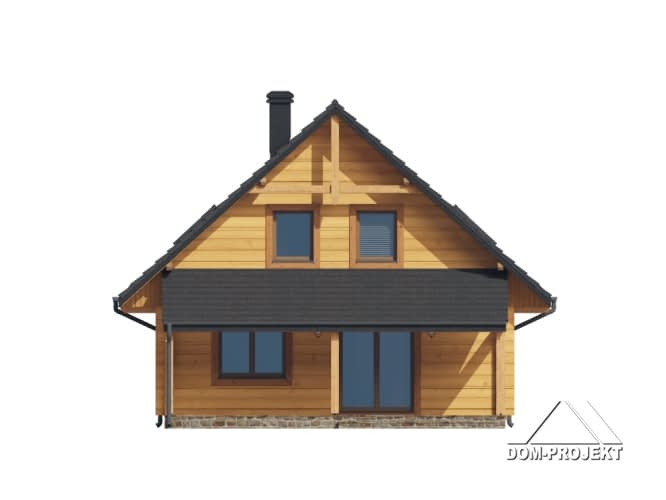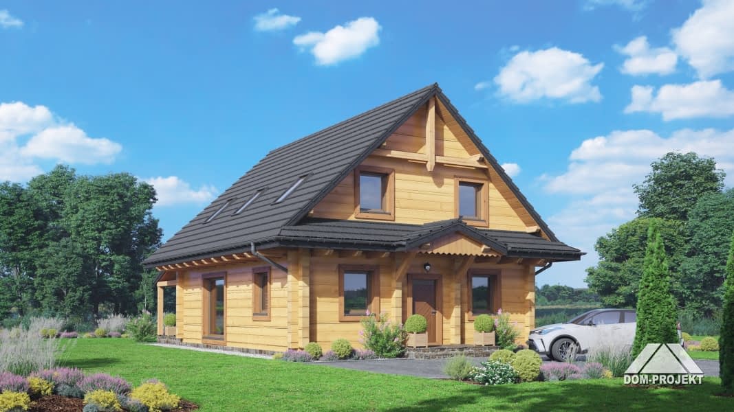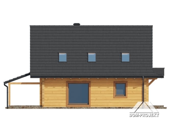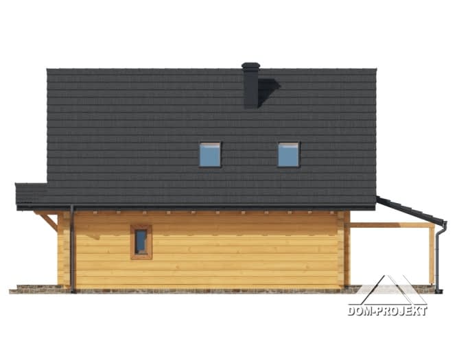 Dom z bali. Na parterze salon z kuchnią, kominkiem oraz wyjściem na duży, zadaszony taras. Pokój, spiżarka, komunikacja, łazienka, pomieszczenie gospodarcze, wiatrołap. Na poddaszu trzy pokoje, łazienka, komunikacja, garderoba. Zwarta bryła budynku oraz dach dwuspadowy sprzyjają szybkiej i taniej budowie oraz niskim kosztom eksploatacji.Rzuty