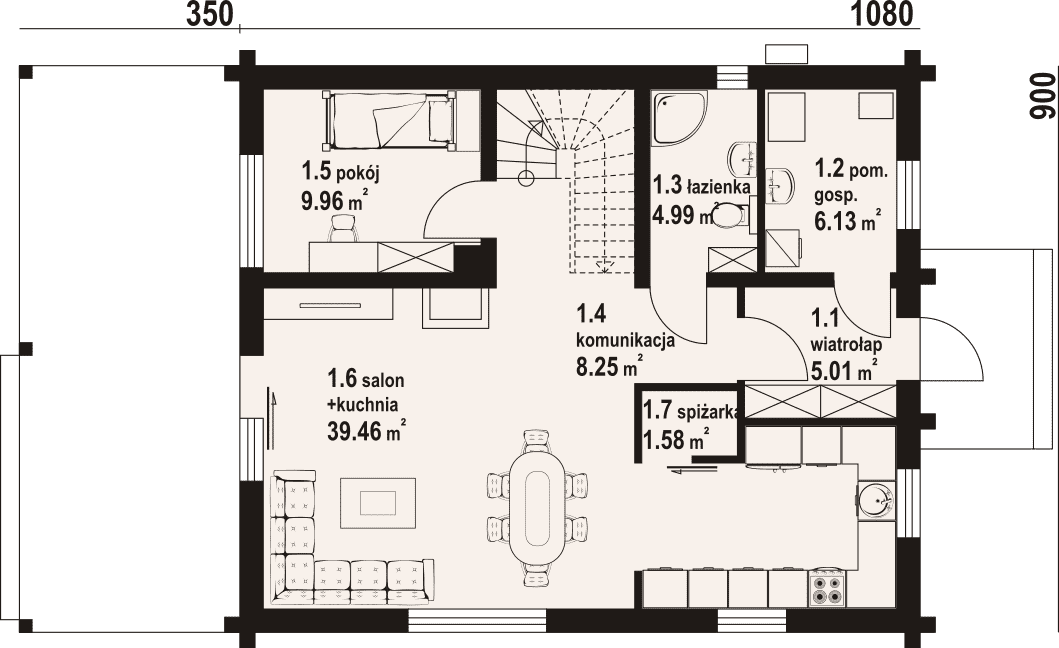 - 1.6 - kuchnia, salon39.46 m²