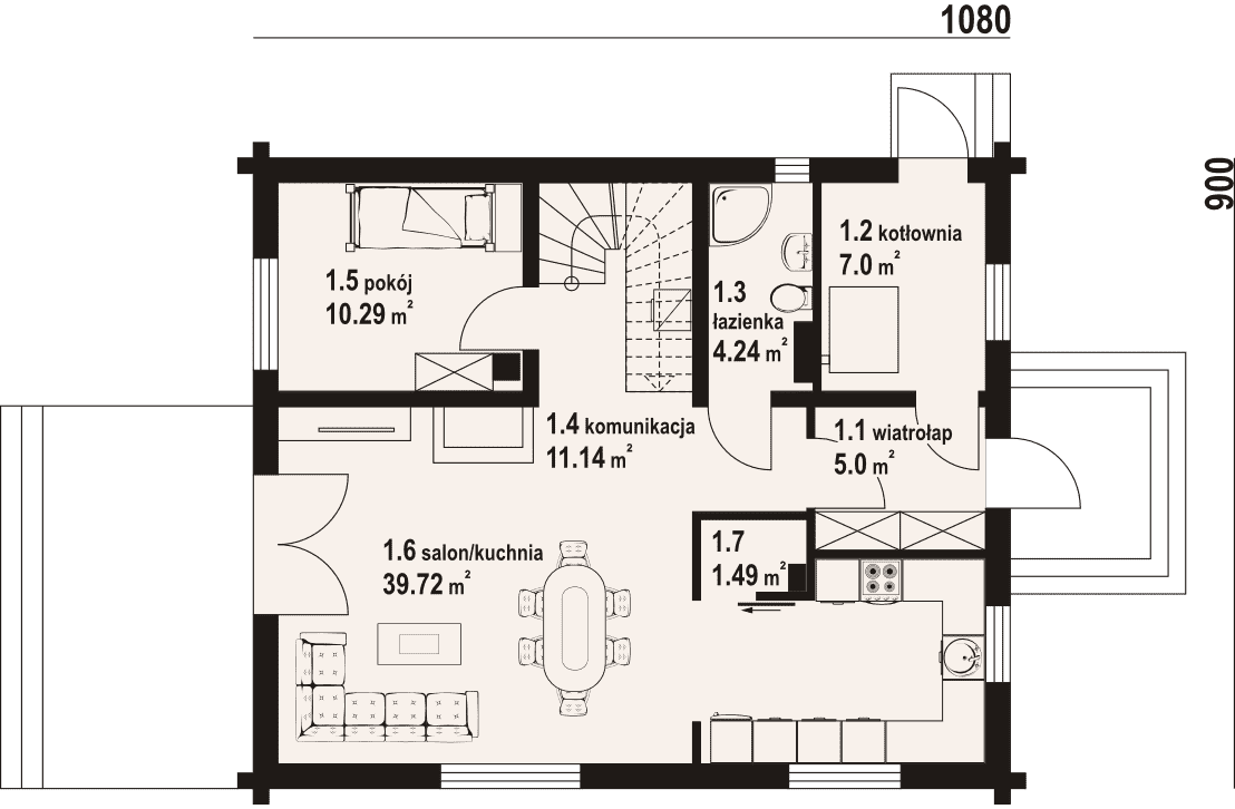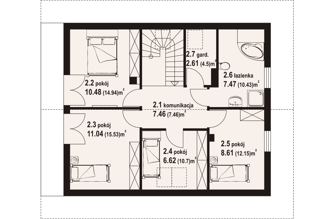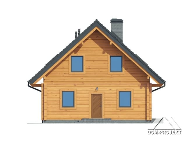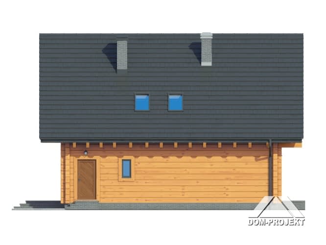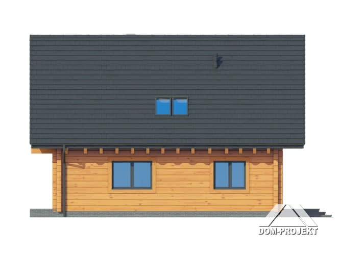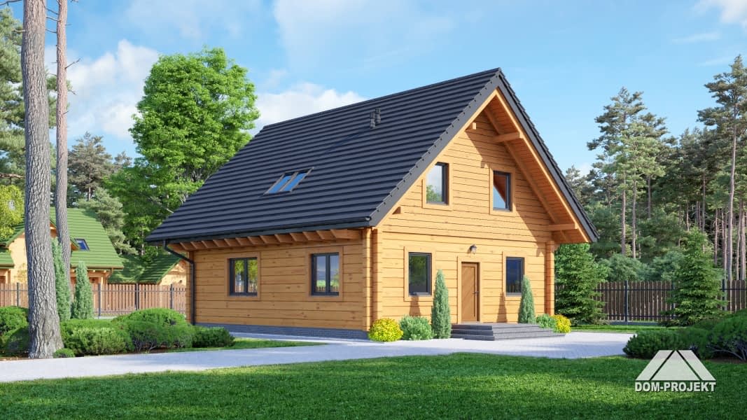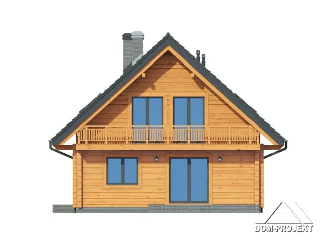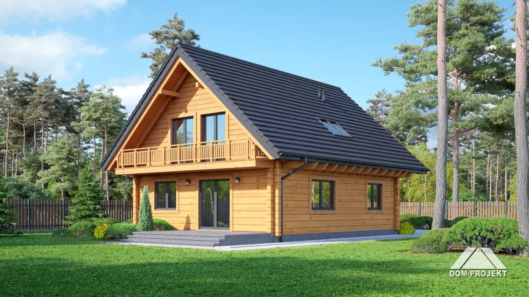 Dom z bali drewnianych. Duży salon z aneksem kuchennym, kominkiem, wyjściem na taras i schodami na poddasze. Pokój, łazienka, kotłownia, wiatrołap, spiżarka i komunikacja. Na poddaszu cztery pokoje, łazienka, garderoba, balkon i komunikacja. Zwarta bryła budynku i dach dwuspadowy sprzyjają szybkiej i taniej budowie i niskim kosztom eksploatacji.Rzuty