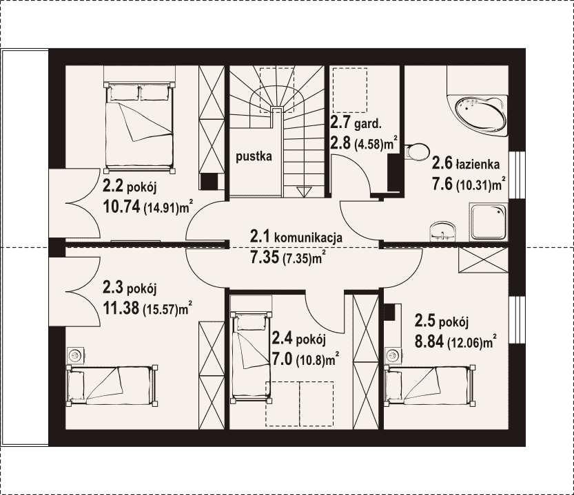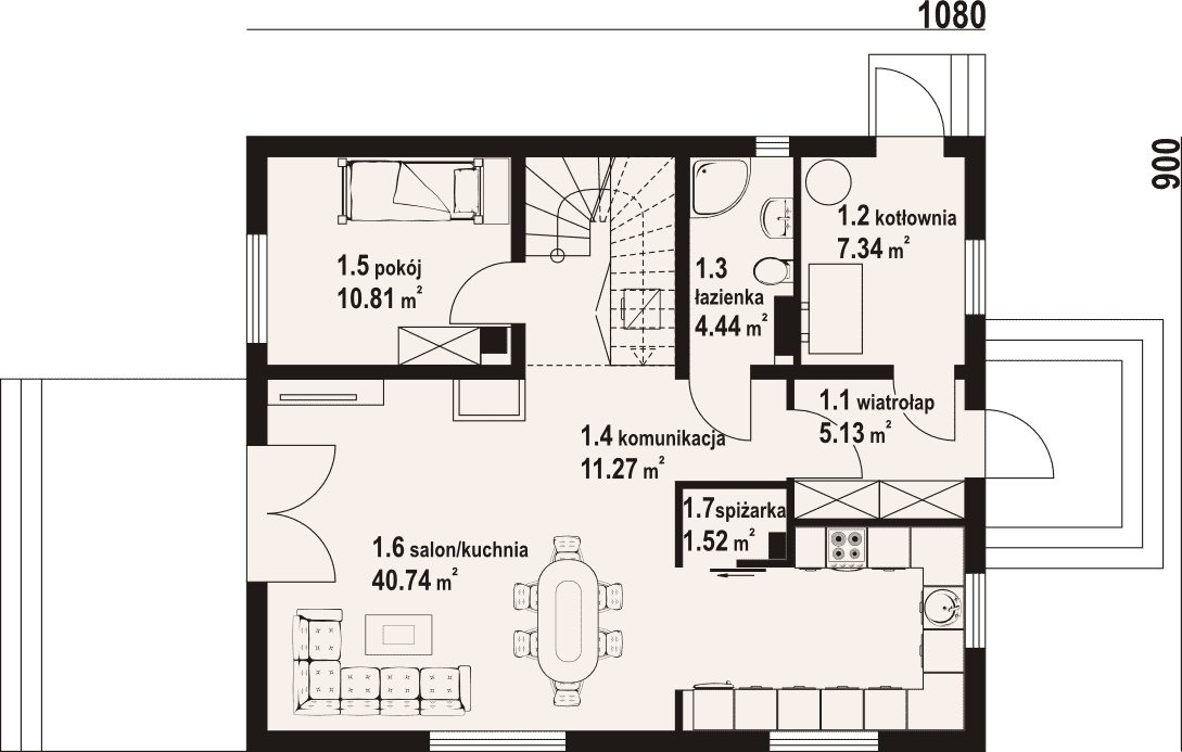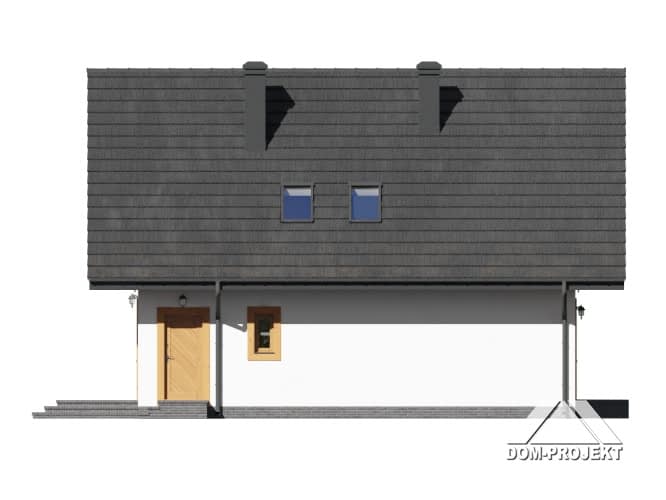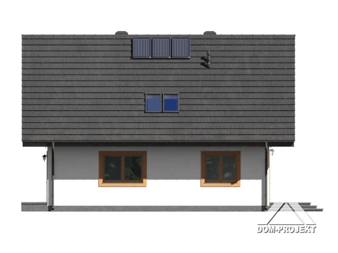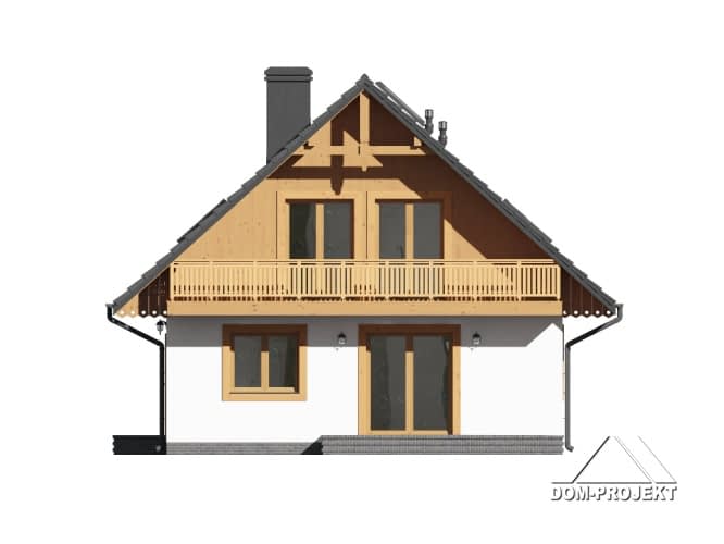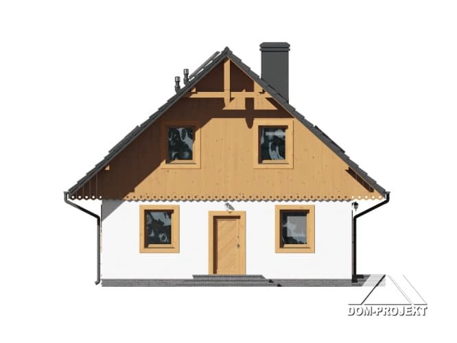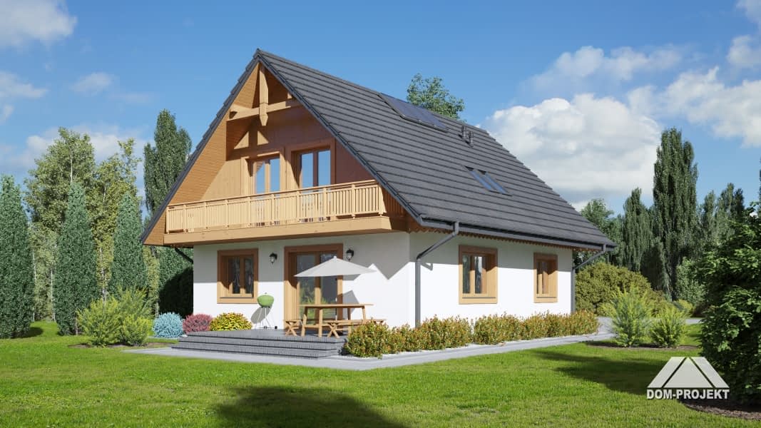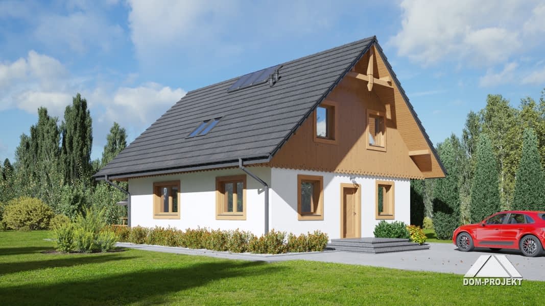 Dom w konstrukcji szkieletu drewnianego. Duży salon z aneksem kuchennym, kominkiem i wyjściem na taras. Pokój, łazienka, spiżarka, komunikacja, wiatrołap, kotłownia. Na poddaszu cztery pokoje, łazienka, garderoba, komunikacja i balkon. Zwarta bryła budynku i dach dwuspadowy sprzyjają szybkiej i taniej budowie i niskim kosztom eksploatacji.Rzuty