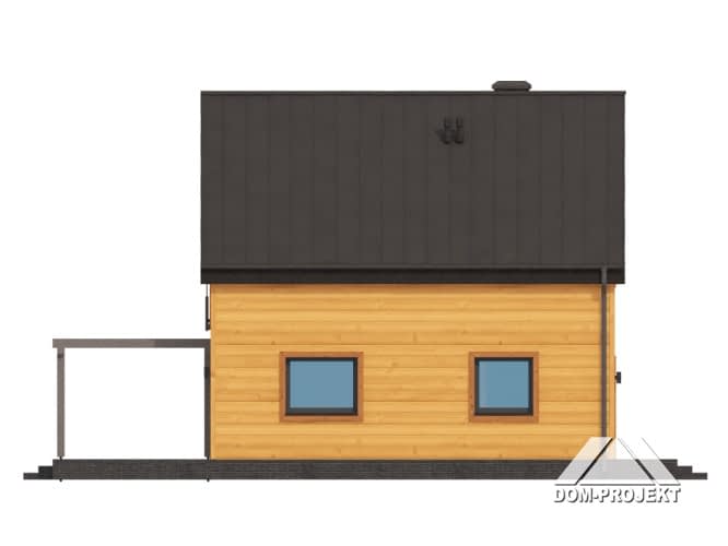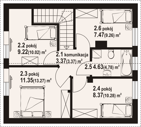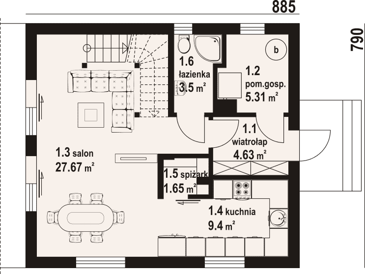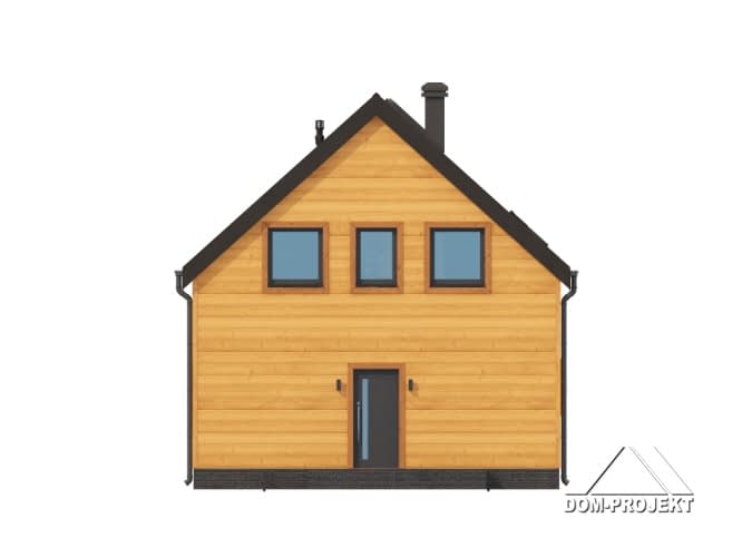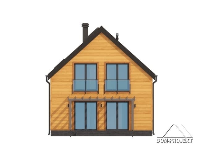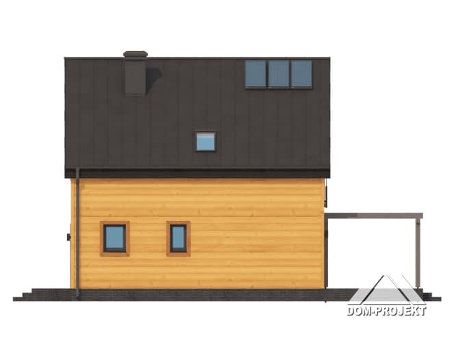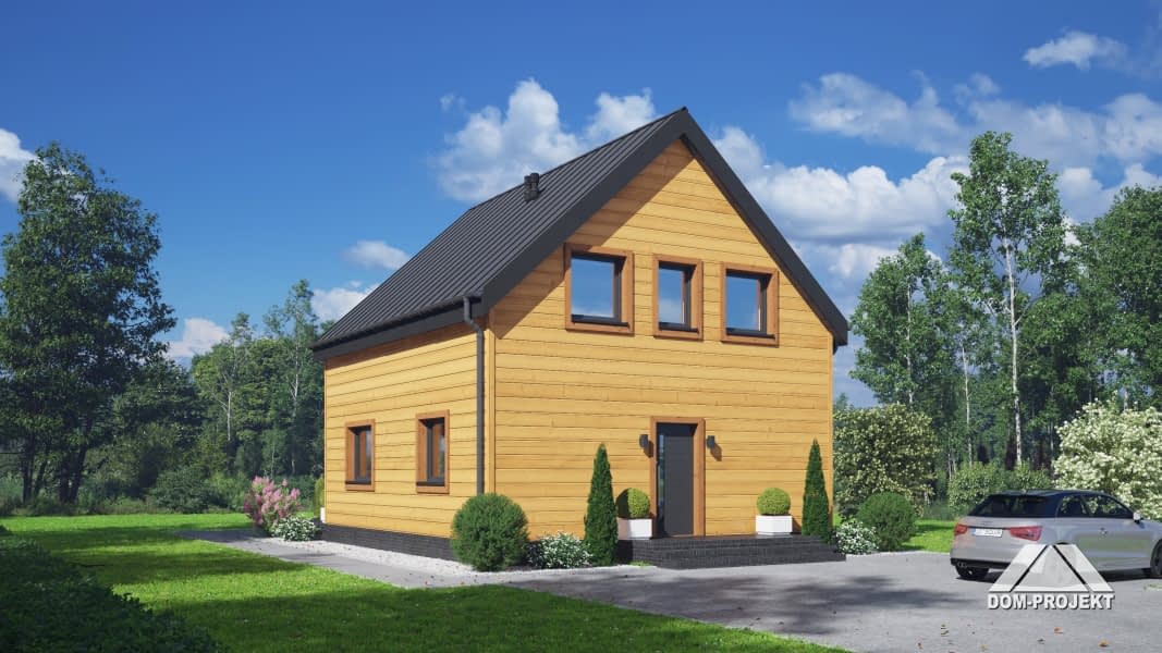 Dom w konstrukcji szkieletu drewnianego. Na parterze salon z kuchnią, wyjściem na taras i schodami na poddasze. Spiżarka, pomieszczenie gospodarcze, łazienka, wiatrołap. Na poddaszu cztery pokoje, komunikacja, łazienka. Zwarta bryła budynku oraz dach dwuspadowy sprzyjają szybkiej i taniej budowie oraz niskim kosztom eksploatacji.Rzuty