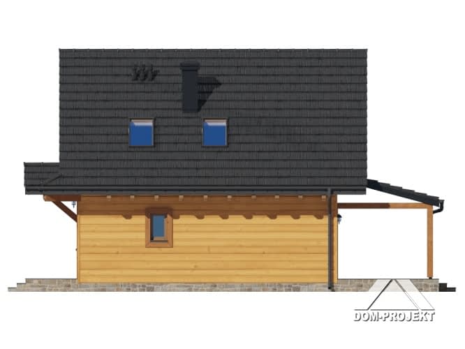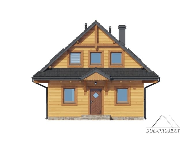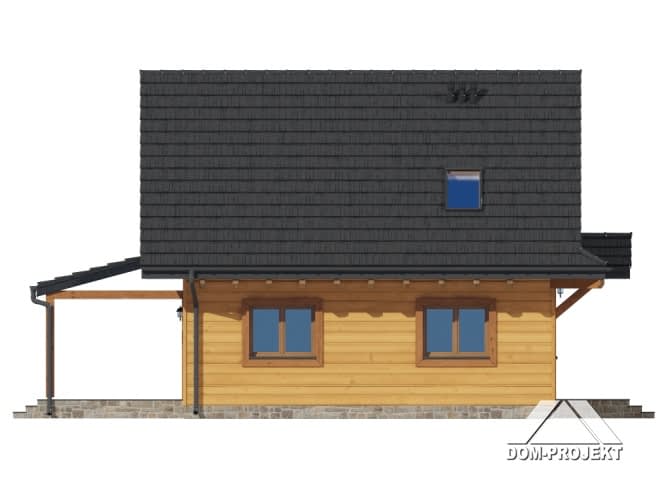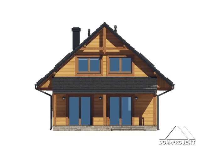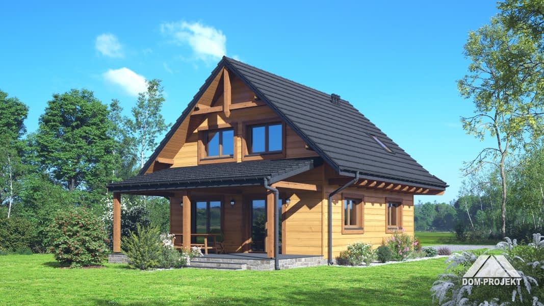 Dom w konstrukcji szkieletu drewnianego. Na parterze salon z kuchnią, wyjściem na duży, zadaszony taras i schodami na poddasze. Spiżarka, łazienka, pomieszczenie gospodarcze, wiatrołap. Na poddaszu cztery pokoje, łazienka, komunikacja, Zwarta bryła budynku oraz dach dwuspadowy sprzyjają szybkiej i taniej budowie oraz niskim kosztom eksploatacji.Rzuty