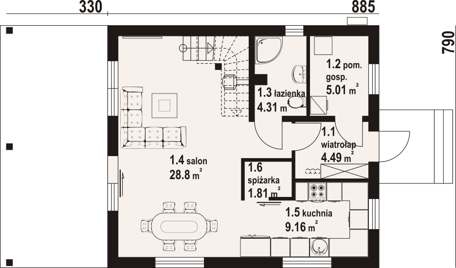 - 1.4 - salon28.8 m²