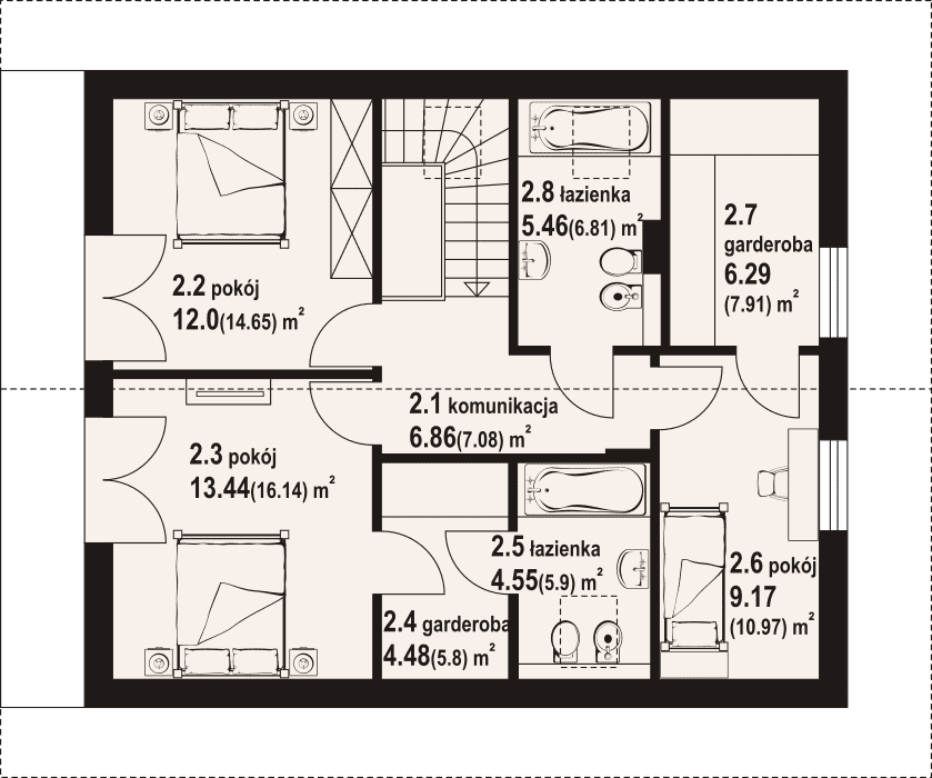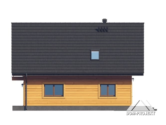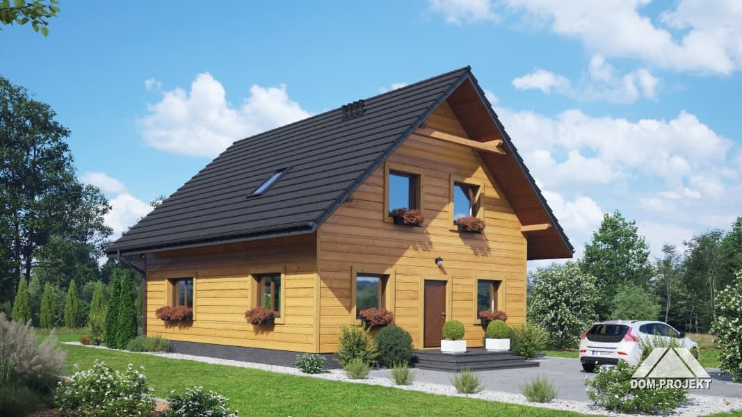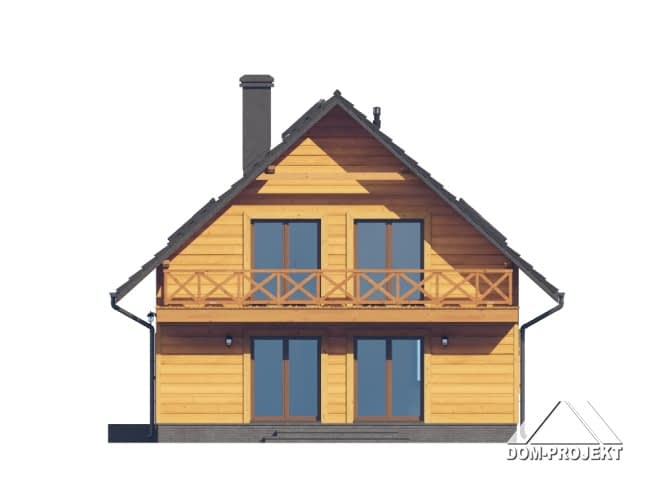 Dom w konstrukcji szkieletu drewnianego. Na parterze duży salon z wyjściami na taras i schodami na poddasze. Kuchnia, spiżarka, wiatrołap, łazienka, kotłownia. Na poddaszu trzy pokoje, dwie łazienki, dwie garderoby, komunikacja oraz balkon dostępny z dwóch pokoi. Zwarta bryła budynku oraz dach dwuspadowy sprzyjają szybkiej i taniej budowie oraz niskim kosztom eksploatacji.Rzuty