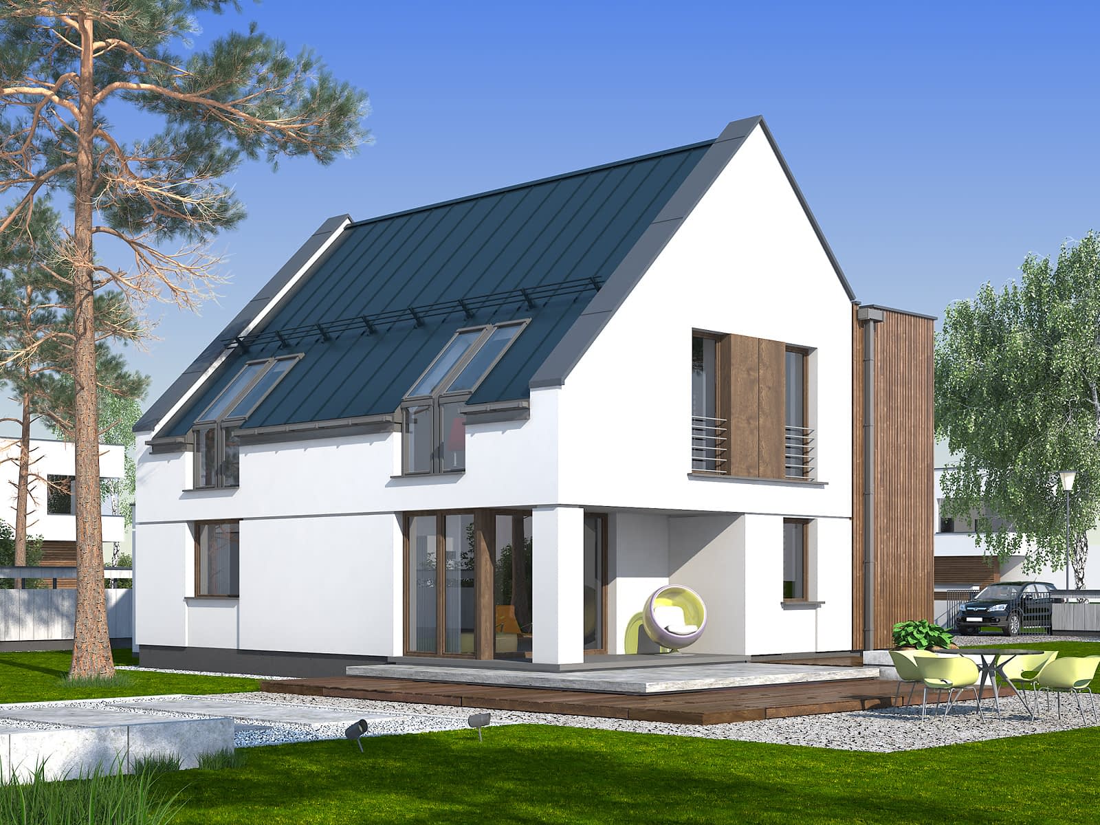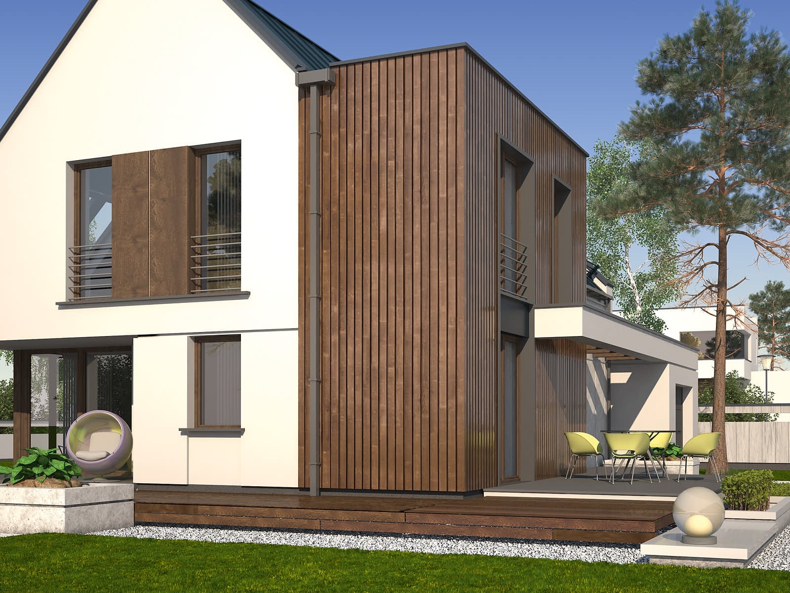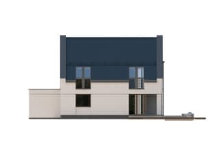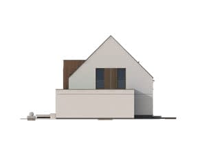 Nowoczesny dom mieszkalny jednorodzinny wyróżniający się ciekawym zestawieniem elementów wykończeniowych. W charakterystycznym, dwukondygnacyjnym wykuszu z płaskim dachem, wykończonym szalówką drewnianą, zaprojektowano kuchnię. Na poddaszu zaś znajduje się sypialnia bez skosów. Dodatkowy pokój na parterze ze względu na zaprojektowanie pełnej łazienki może służyć nie tylko jako gabinet, ale i jako pokój gościnny lub pokój seniora. Ciekawa, nowoczesna bryła łączy zalety funkcjonalne, które spełnią wymagania każdej rodziny.Konstrukcja