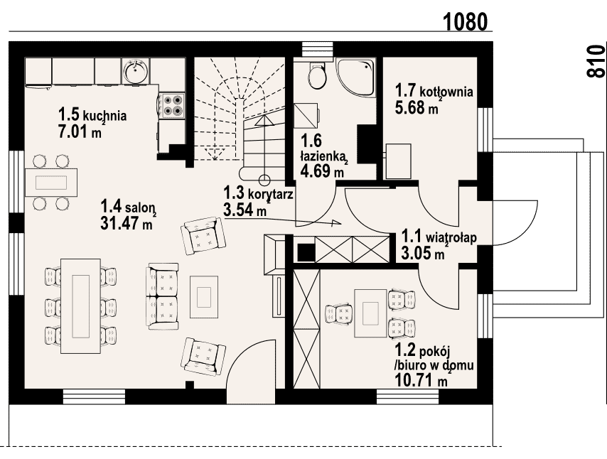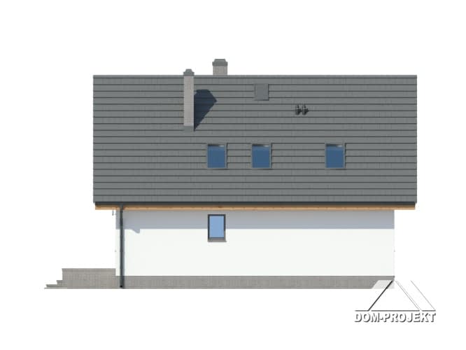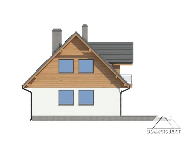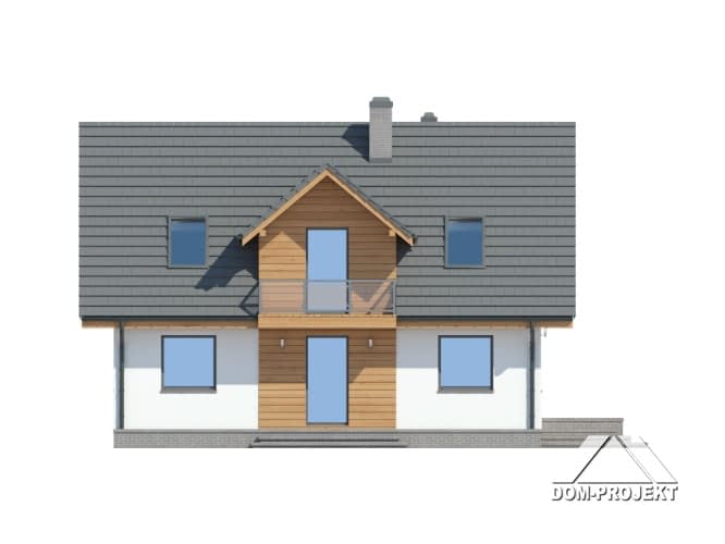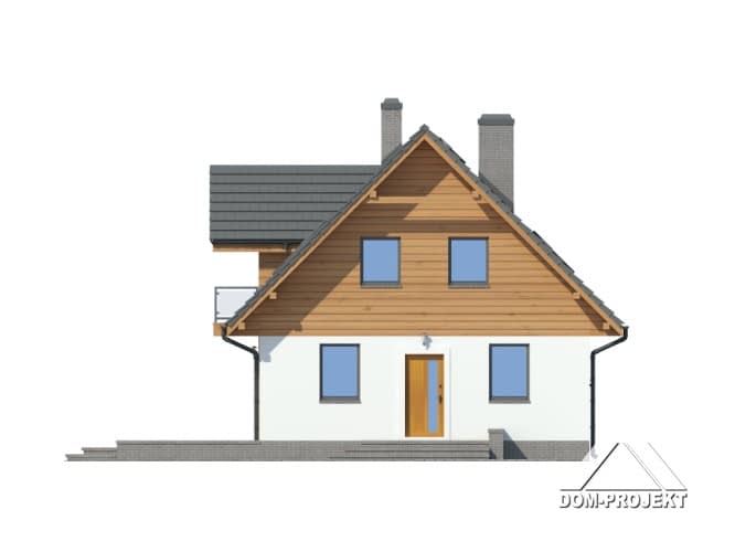 Dom w konstrukcji szkieletu drewniane dla czteroosobowej rodziny. Duży salon z aneksem kuchennym, kominkiem, schodami na poddasze i wyjściem na taras. Pokój do pracy (biuro w domu), łazienka, kotłownia, wiatrołap i komunikacja. Na poddaszu trzy pokoje, łazienka, wc i komunikacja. Największy pokój poddasza ma balkon. Zwarta bryła budynku, dach dwuspadowy.Rzuty