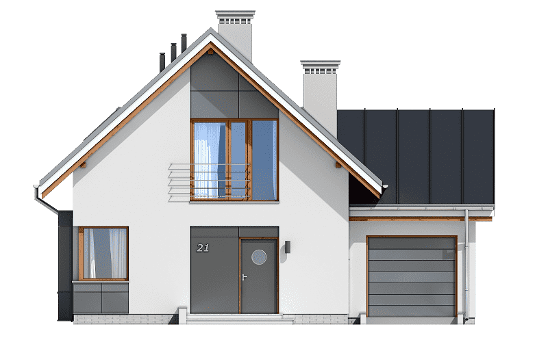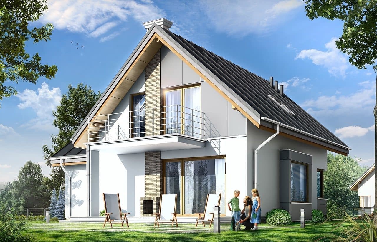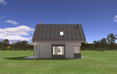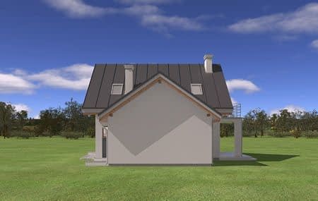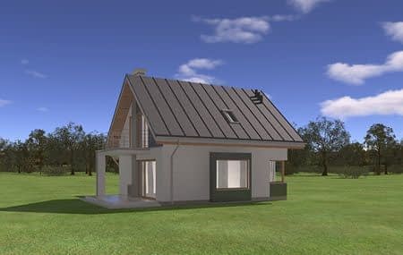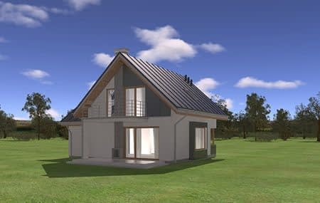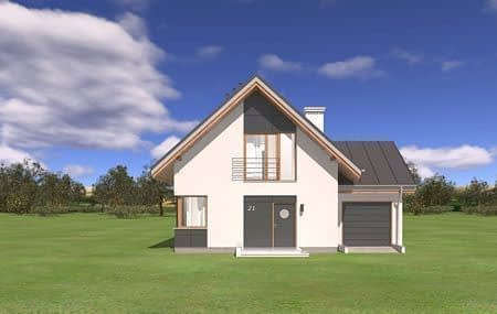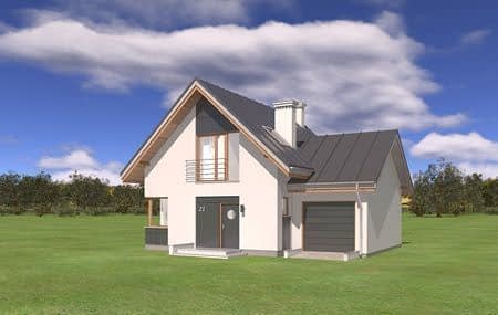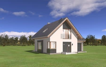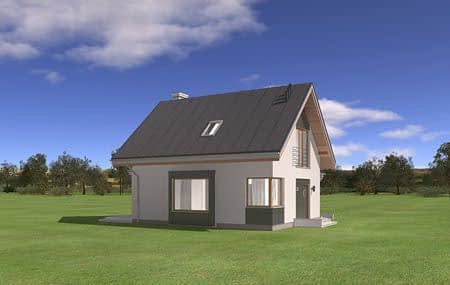 Projekt domu Gucio 2 to nowoczesny niewielki domek dla cztero-pięcioosobowej rodziny. Parterowy budynek przekryty dwuspadowymi dachami, z dobudowanym do głównej bryły garażem. Dom zaprojektowano, aby dać jak największy komfort przyszłym mieszkańcom, tworząc otwartą przestrzeń dzienną, charakterystyczną dla dużych domów jednorodzinnych. Salon połączony z holem, aneksem jadalnym z wykuszem, wyeksponowanymi reprezentacyjnymi schodami będzie wspaniałym miejscem do życia dla przyszłych domowników. Kominek w domu Gucio 2 usytuowany został na ścianie zewnętrznej, co pozwoli rozkoszować się widokiem ognia i ogrodu równocześnie. Duże przeszklone drzwi łączą pokój dzienny z częściowo zadaszonym tarasem. Na parterze znajduje się też wygodna kuchnia, przedsionek, kotłownia, wc z natryskiem i garaż. Na poddaszu zaprojektowano trzy wygodne sypialnie z niewielkimi "skosami", oraz z wbudowanymi szafami - garderobami. Dodatkowo na poddaszu znajduje się ładna łazienka. Nad garażem mieści się strych gospodarczy dostępny z garażu. Architektura domu podkreśla prostotę form, nowoczesność w doborze materiałów, co wszystko razem tworzy udaną kompozycję. Dom jest łatwy w budowie i niedrogi w późniejszym utrzymaniu. Projekt domu Gucio 2 dostępny jest także w wersji odbicia lustrzanego oraz w wersji bez garażu projekt domu Gucio.