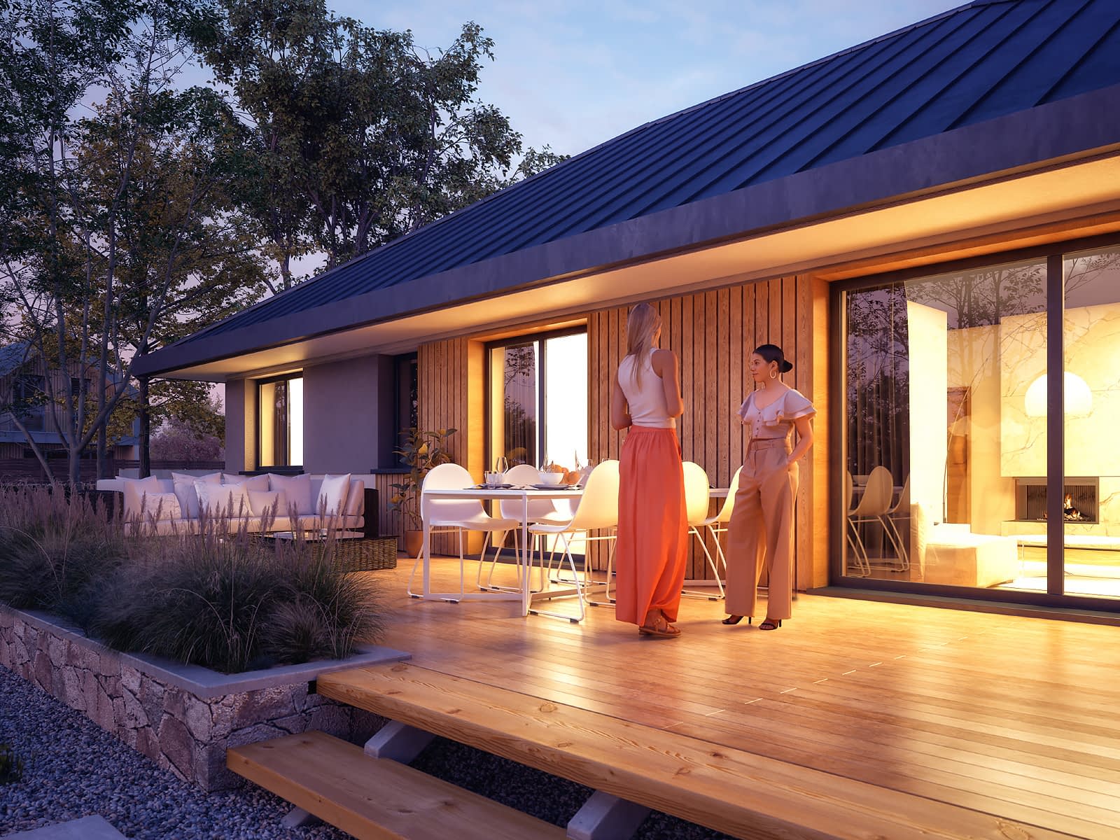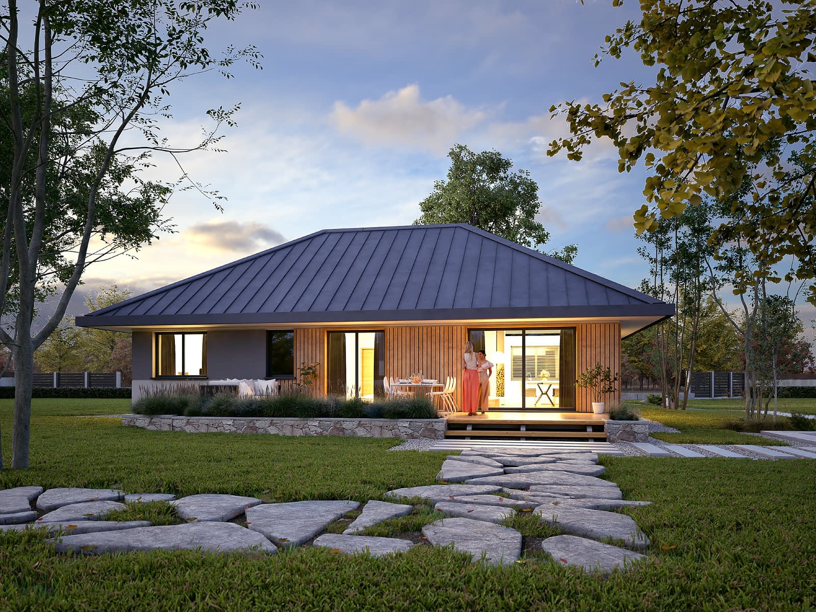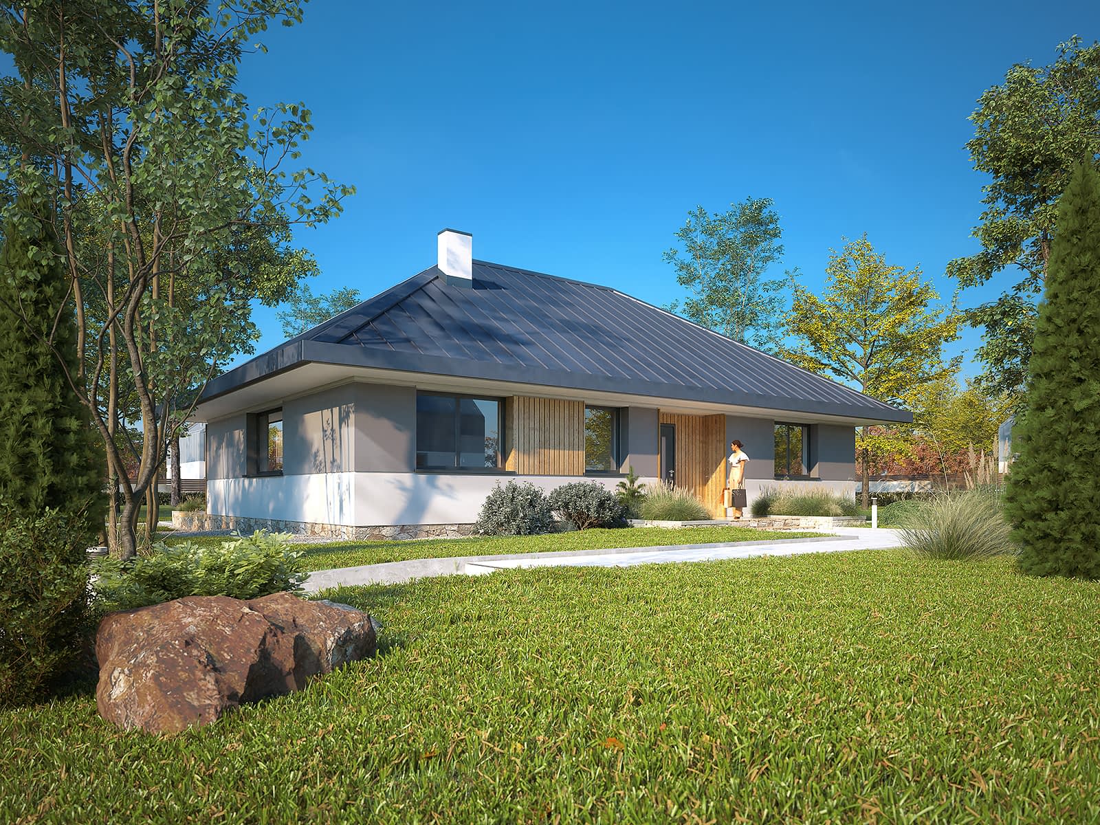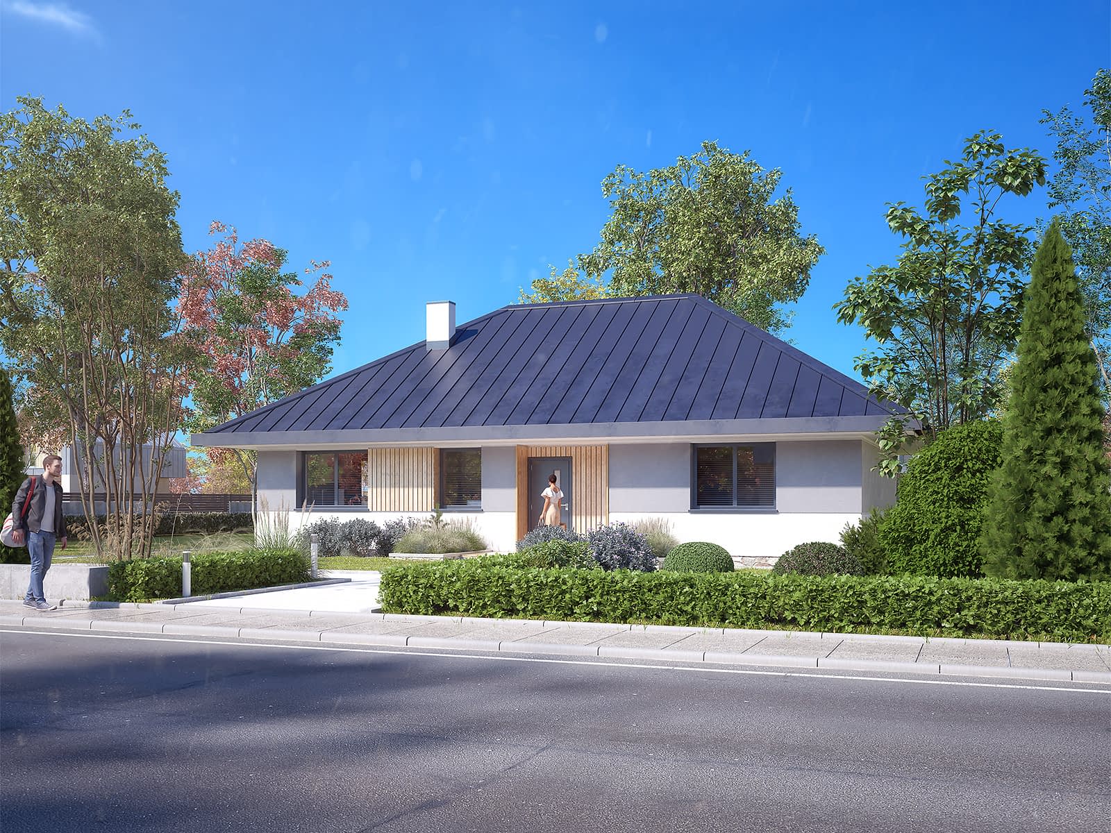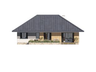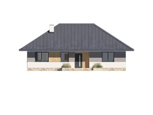 Gwiazdka 2 to projekt domu parterowego o powierzchni 106 m2. To propozycja projektowa dla 4-osobowej rodziny. Projekt posiada otwarta część dzienna z licznymi przeszkleniami. Zaprojektowano tu salon, dużą jadalnię i otwartą kuchnię. Mieszkańcy do dyspozycji mają trzy wygodne sypialnie oraz rodzinną łazienkę. Układ funkcjonalny domu dopełnia dodatkowy pokój przewidziany jako gabinet do pracy lub nauki oraz wiatrołap z miejscem na pojemna szafę. Projekt utrzymany został w nowoczesnym stylu.Konstrukcja