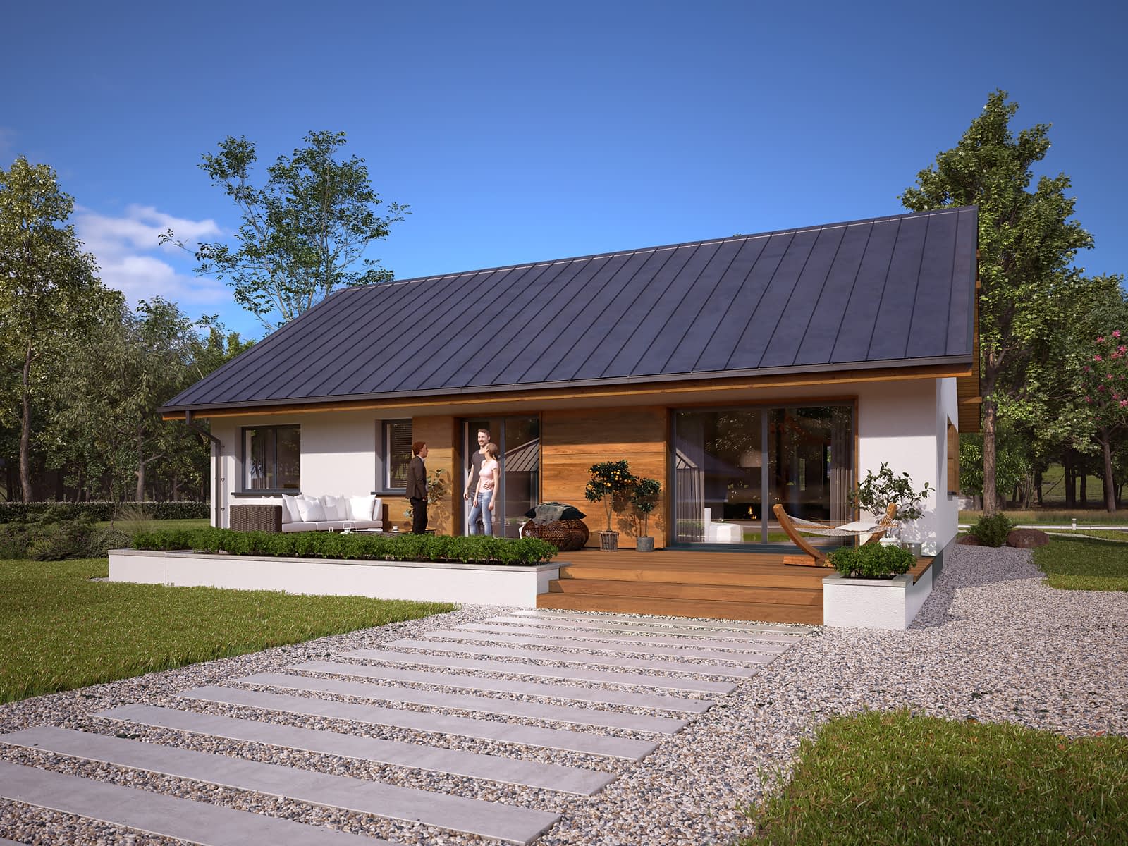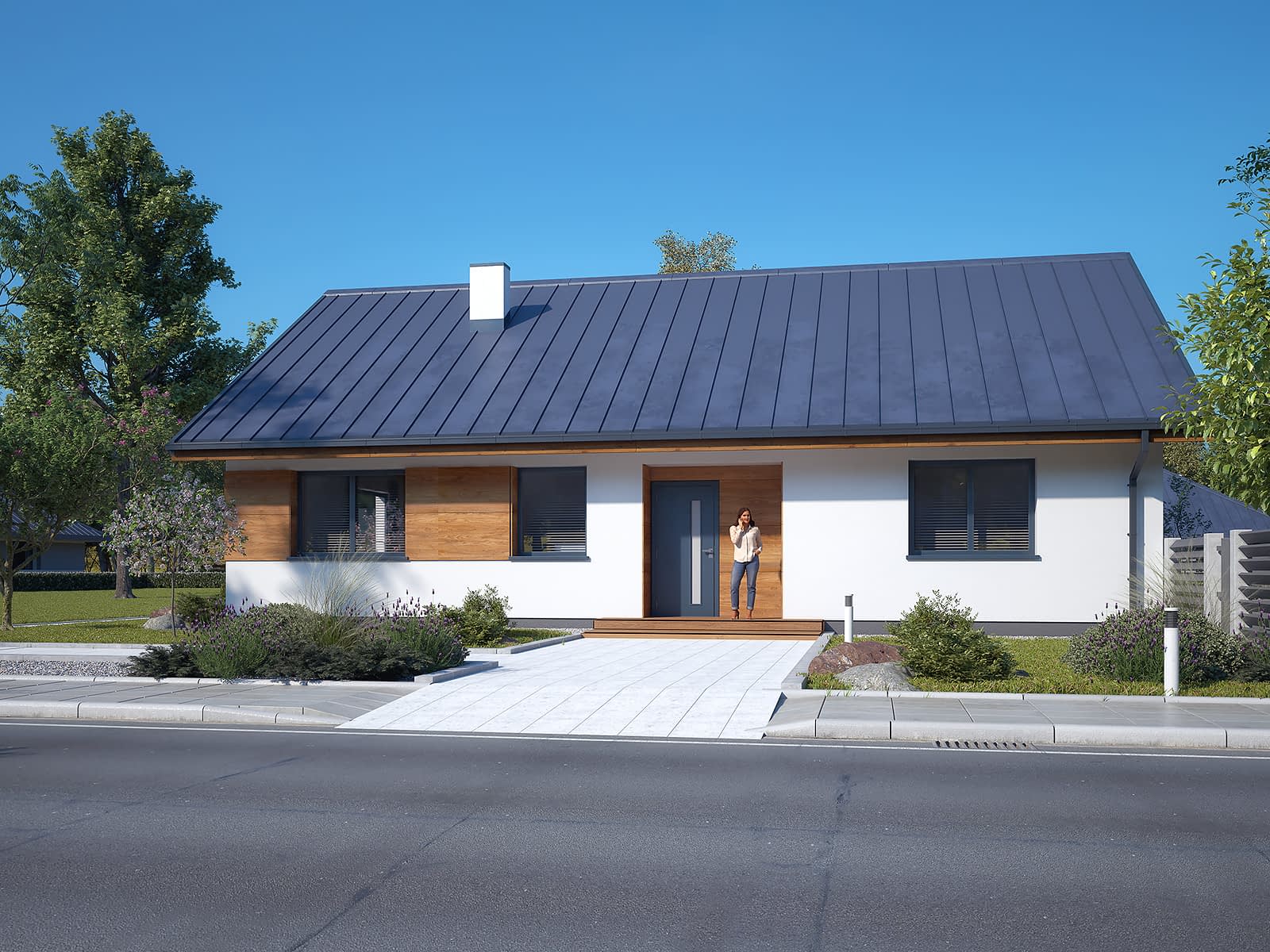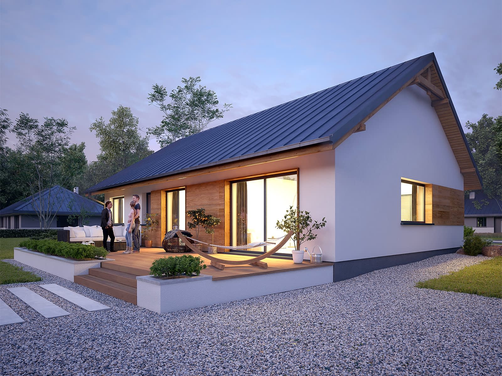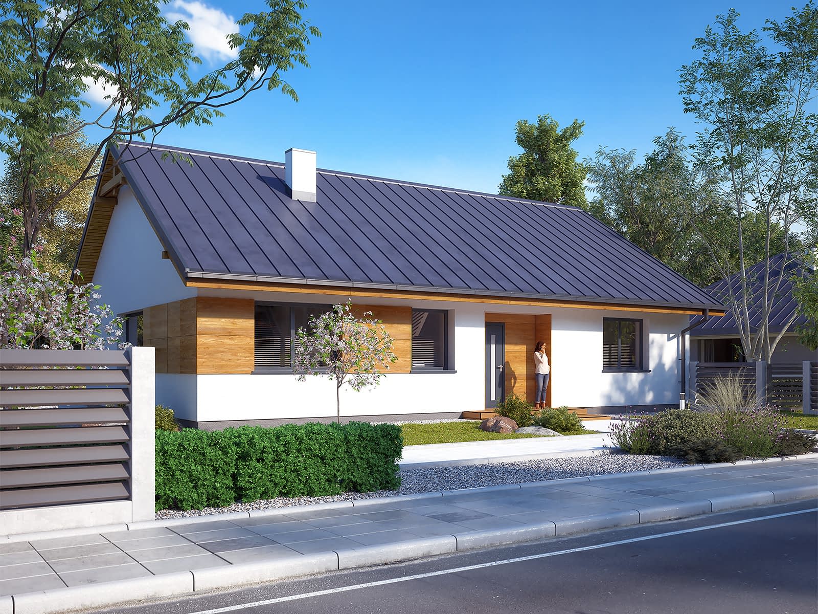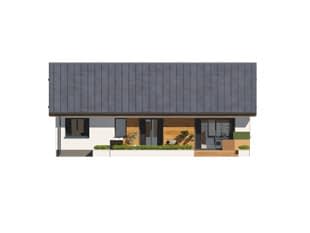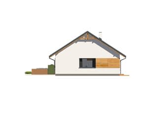 Gwiazdka 3 to projekt domu parterowego o powierzchni 106 m2. Projekt posiada prostą bryłę przykrytą dwuspadowym dachem. To odpowiedź na potrzeby inwestorów, którzy szukają prostoty i funkcjonalności. Projekt będzie idealny dla 4-osobowej rodziny. Gwiazdka 3 utrzymana została w nowoczesnym stylu. Elewację wykończono białym tynkiem i drewnianą szalówką, które wspaniale się ze sobą komponują. Biały tynk to klasyczne rozwiązanie, które daje poczucie czystości i elegancji. Drewniana szalówka ociepla natomiast budynek nadając mu przytulności. Na dachu pojawiła się blacha na rąbek w grafitowym kolorze, która podkreśla nowoczesny charakter domu.Konstrukcja