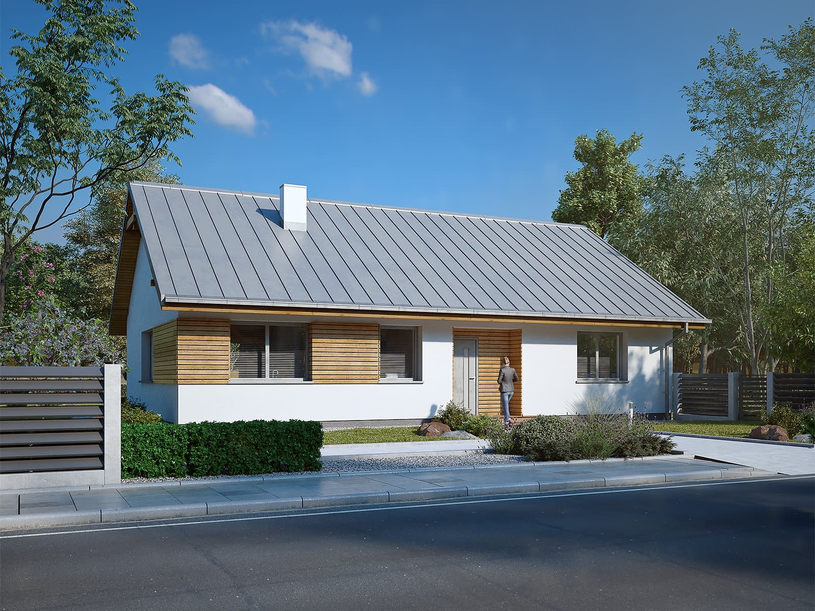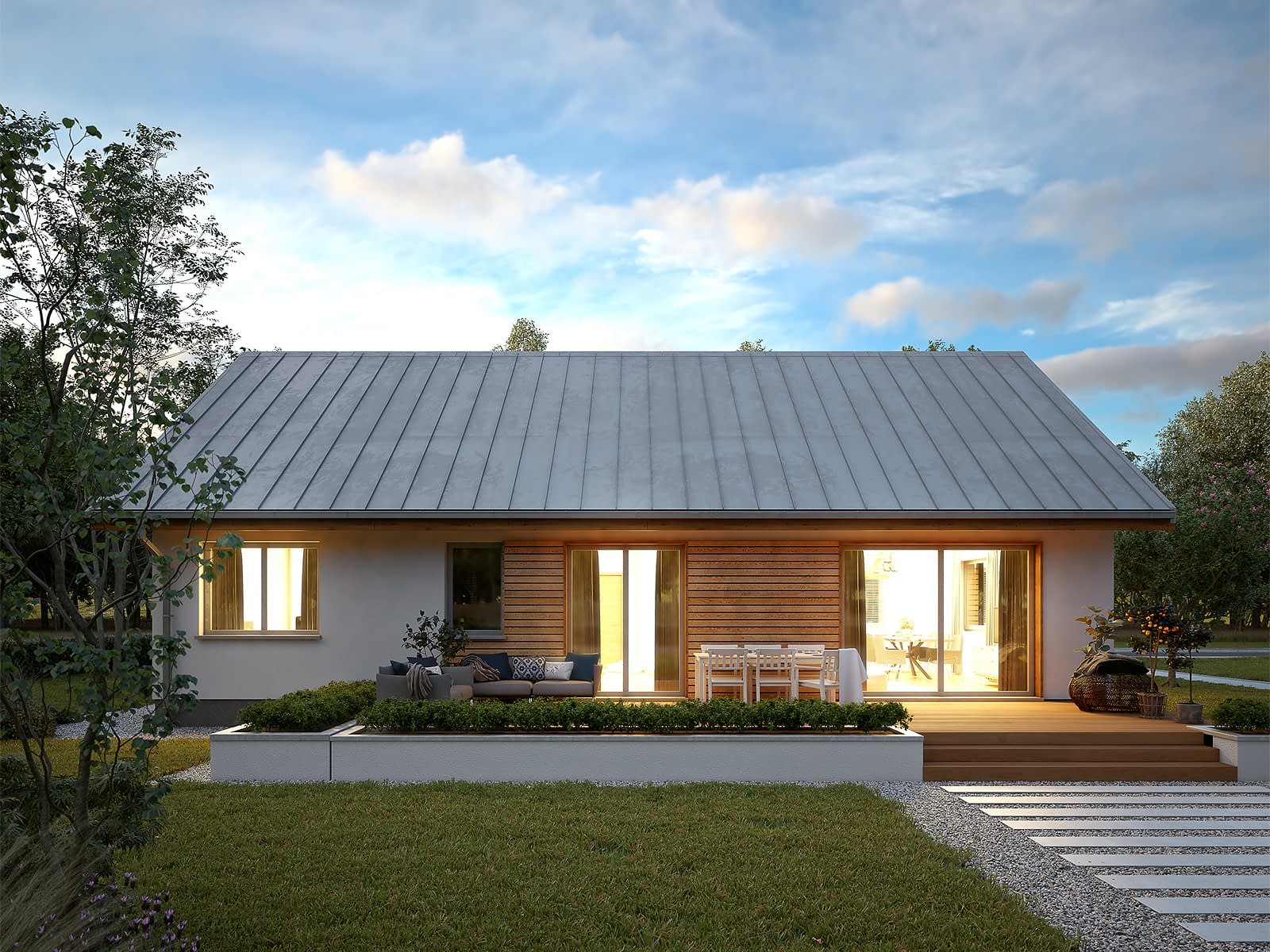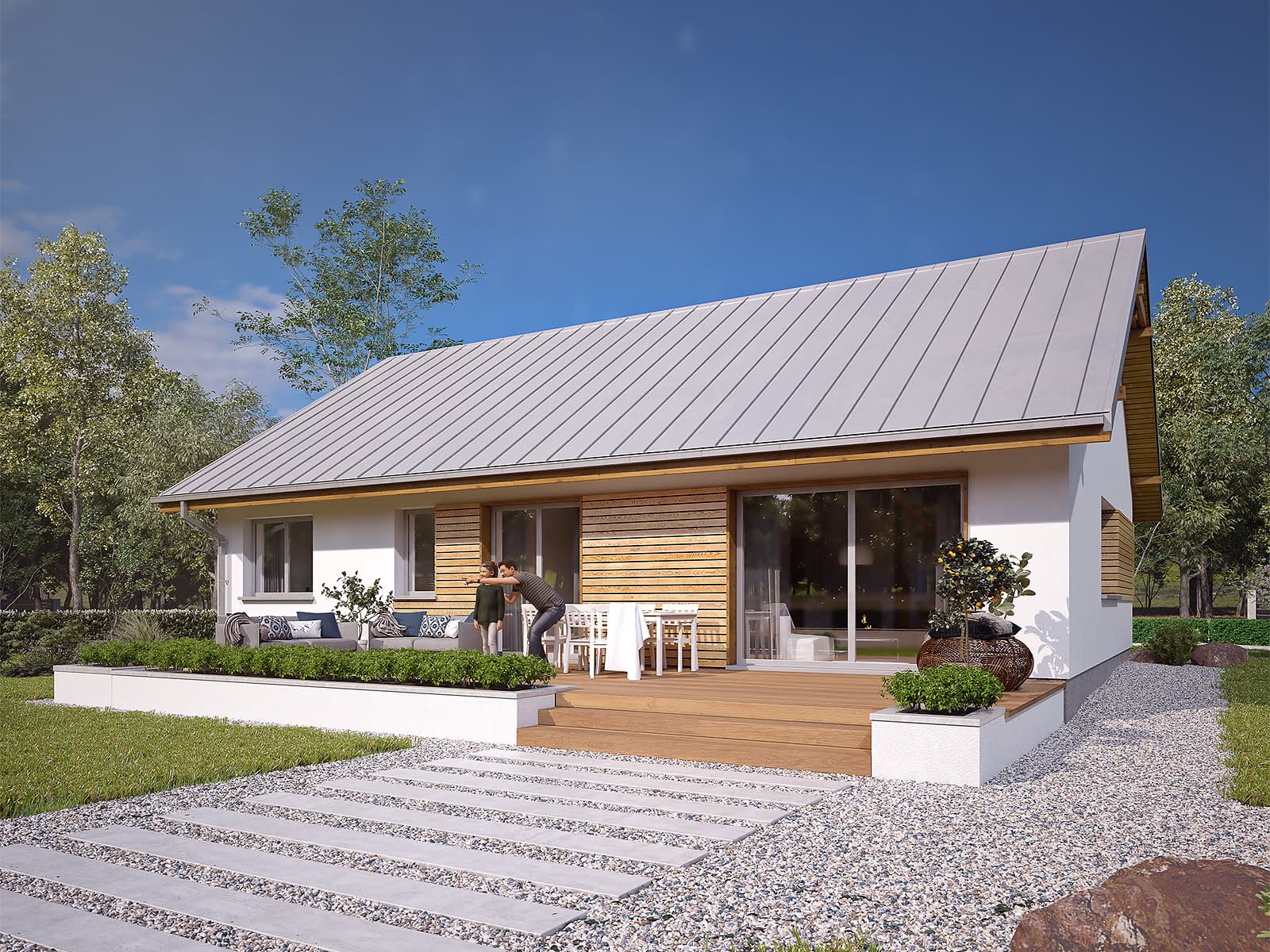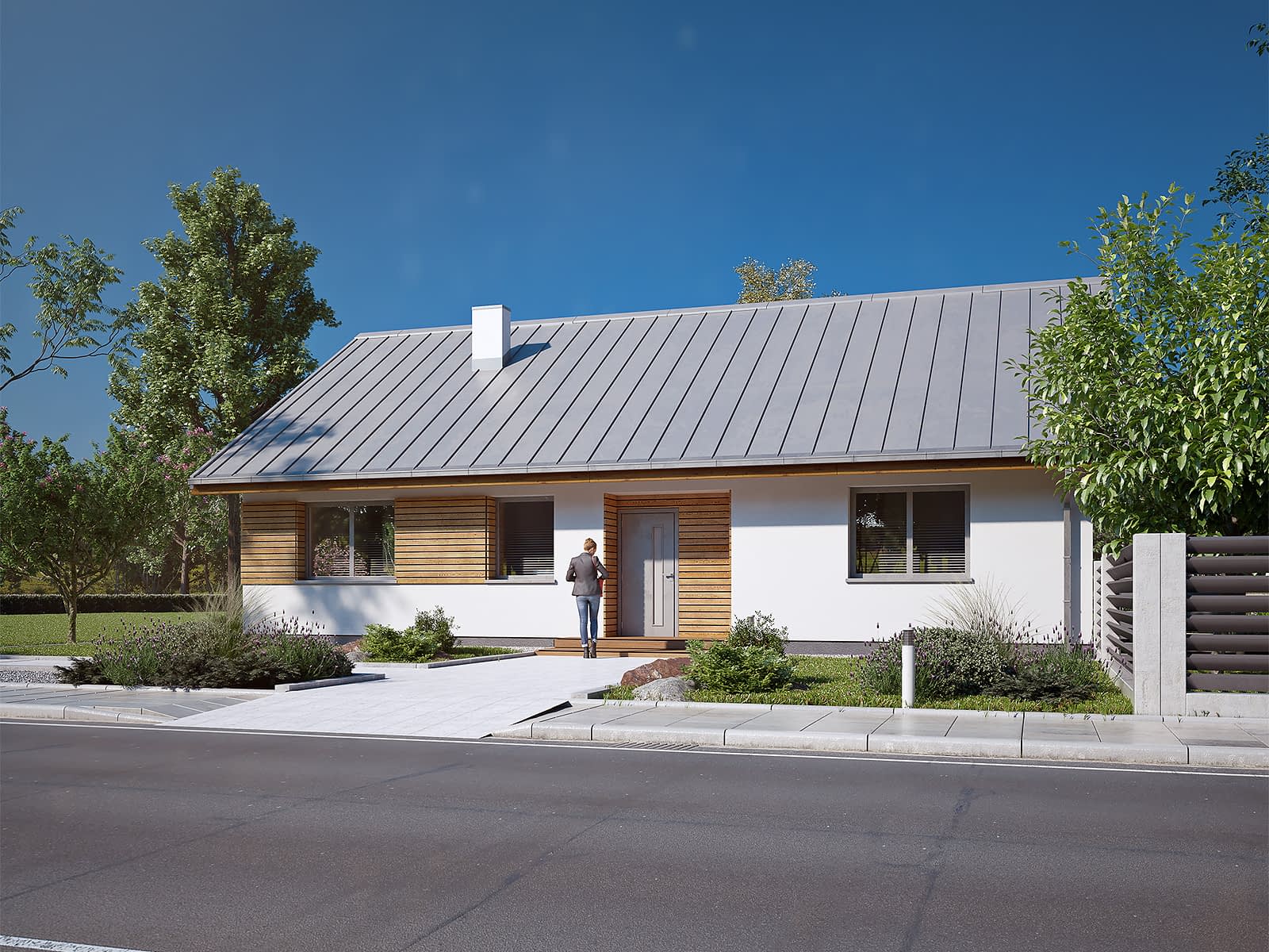 Gwiazdka 5 to nowoczesny projekt domu parterowego. Mieszkańcy do dyspozycji mają 106 m2 powierzchni użytkowej. Projekt posiada prostą bryłę przykrytą dwuspadowym dachem. Część dzienna to salon z jadalnią oraz otwarta kuchnia. Część nocna znajduje się po przeciwległej stronie domu. Zaprojektowano tu trzy funkcjonalne sypialnie oraz rodzinną łazienkę.Konstrukcja