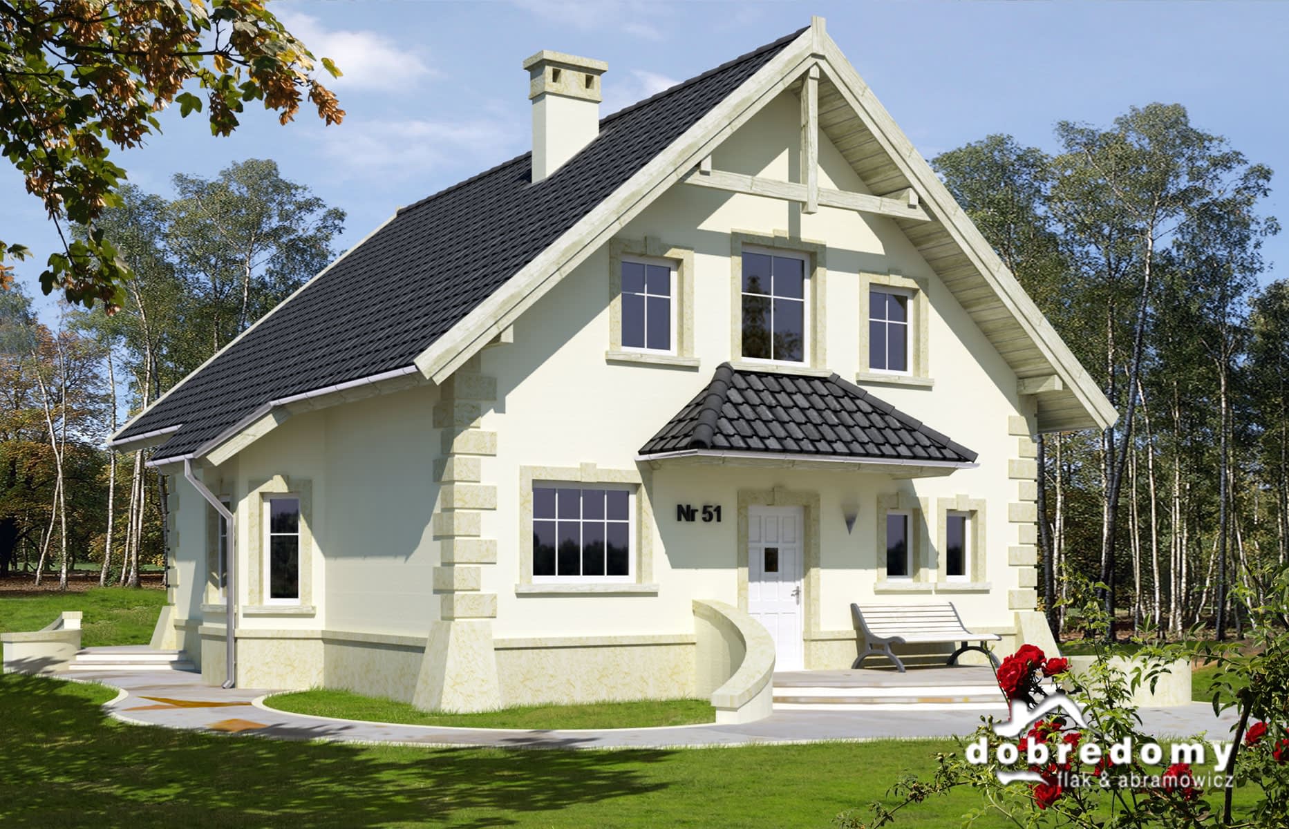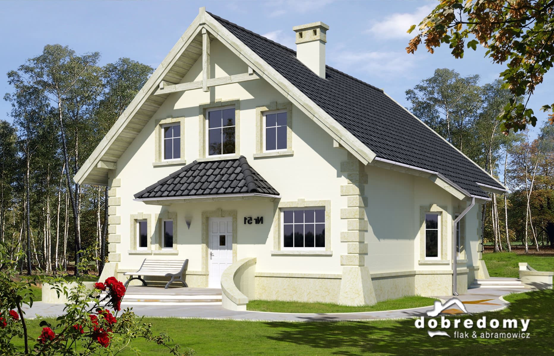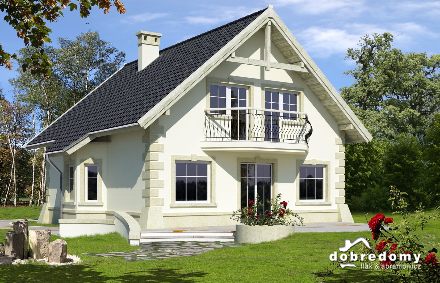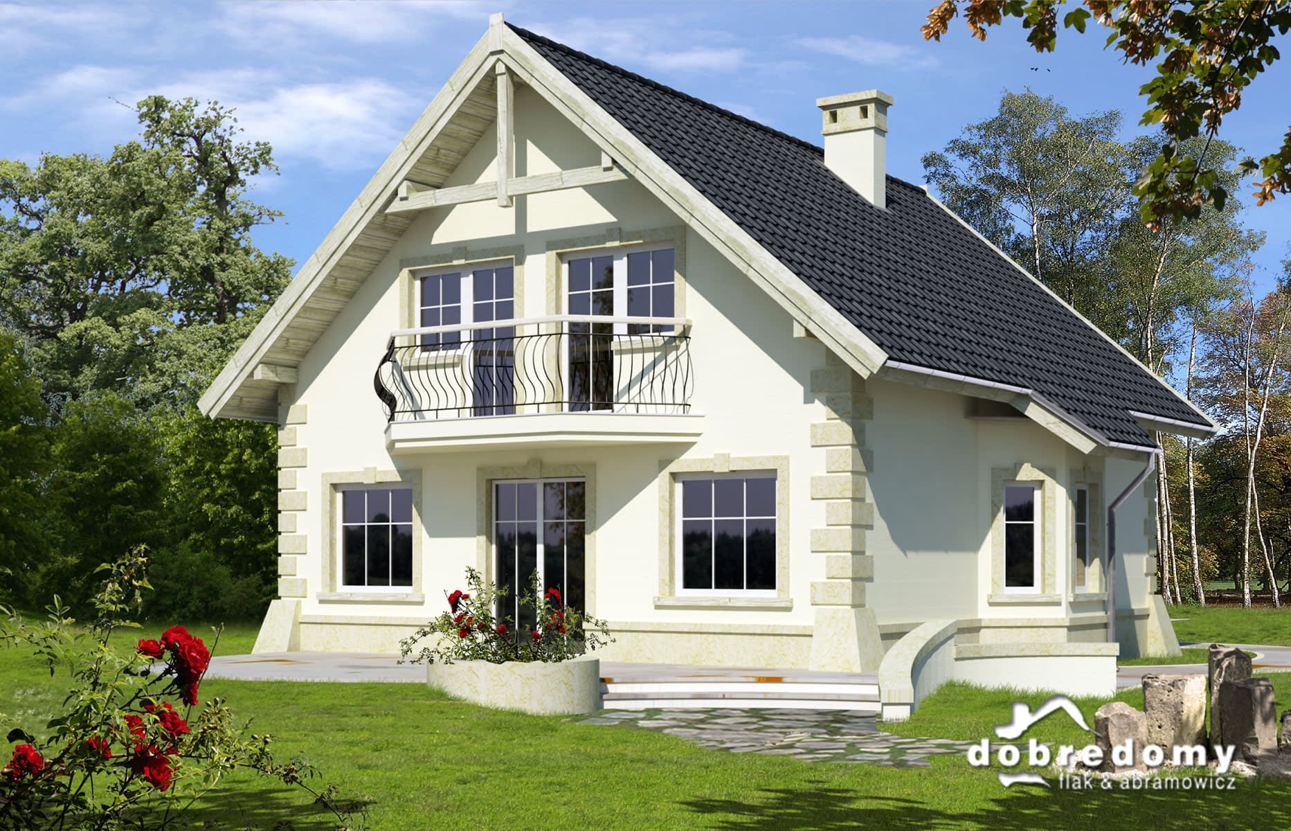 Elewacje pokryte tynkiem strukturalnym w systemie ociepleń Termo Organika. Pokrycie dachu - dachówka ceramiczna lub cementowa CREATON.